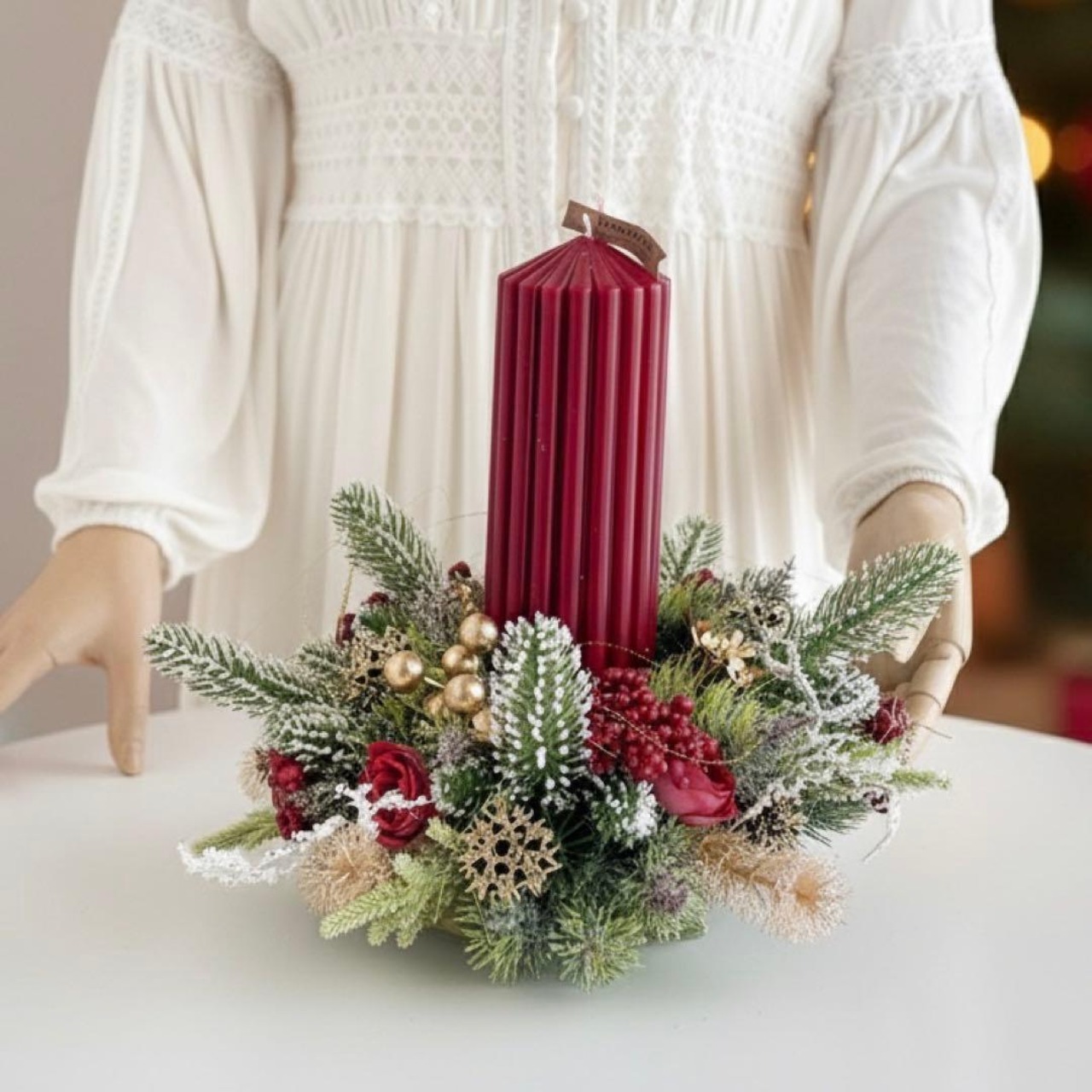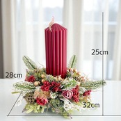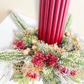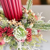 深みのあるボルドーのキャンドルを中心に、雪化粧をまとったグリーンとローズ、ベリー、ゴールドの木の実を贅沢にあしらいました。