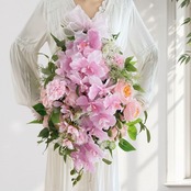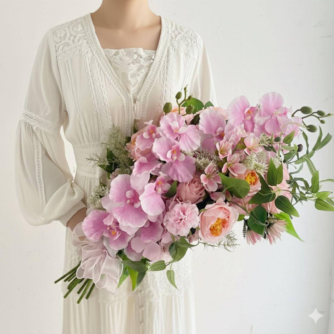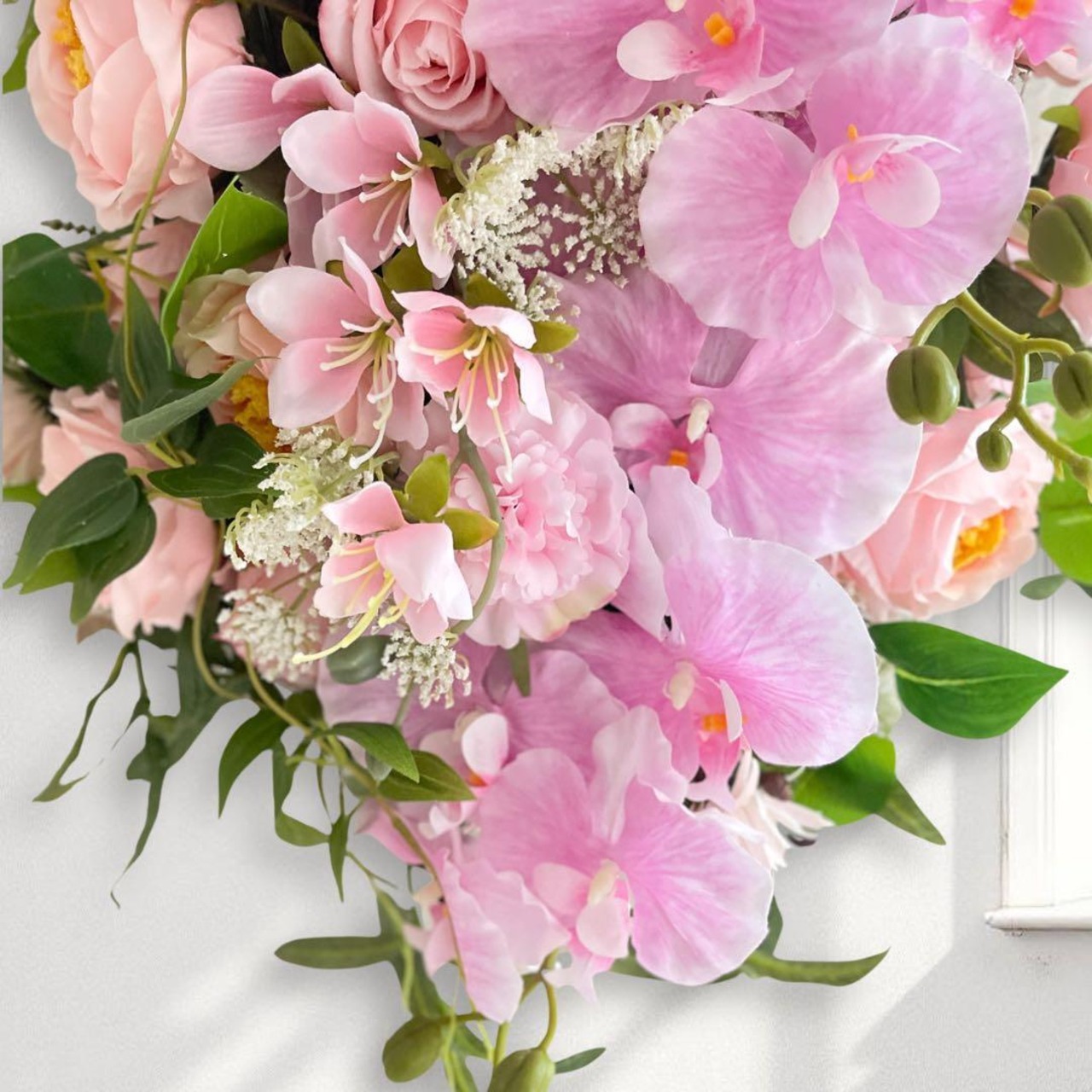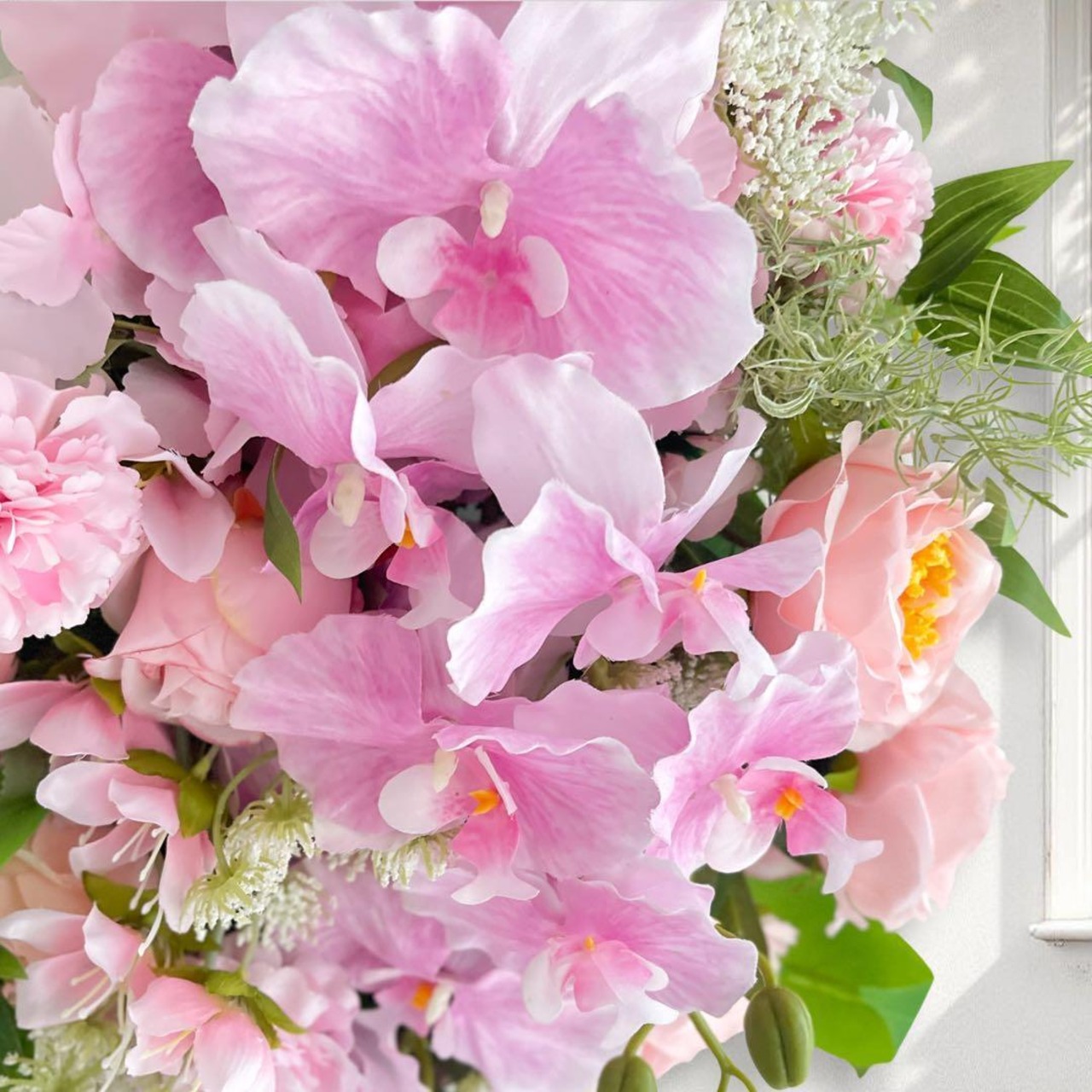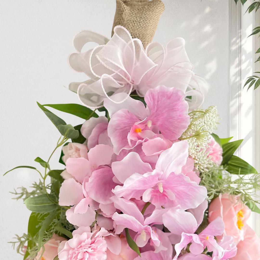 ふんわりと優しいピンクの胡蝶蘭をメインに、可憐なローズやレースフラワーをたっぷりと束ねた、華やかなスワッグリースです。