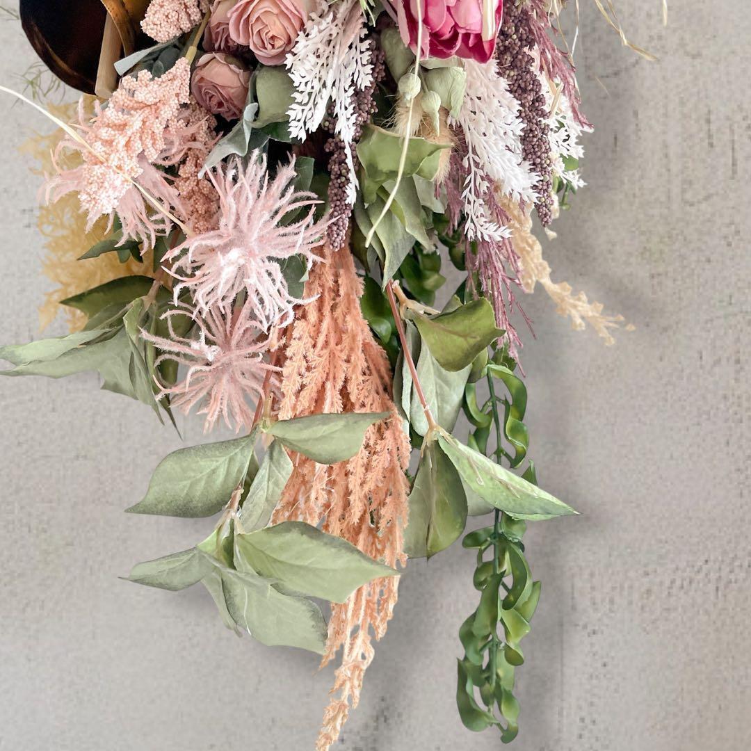 ドライテイストで仕上げた、アーティフィシャルフラワーの特大スワッグです。