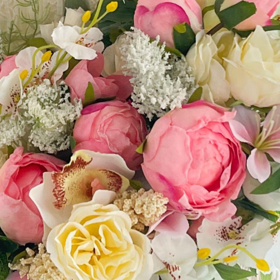 ふんわりと重ねたピオニーローズとホワイトローズ、レースフラワーが、見る人の心を穏やかに包み込み、空間に華やぎを添えます。