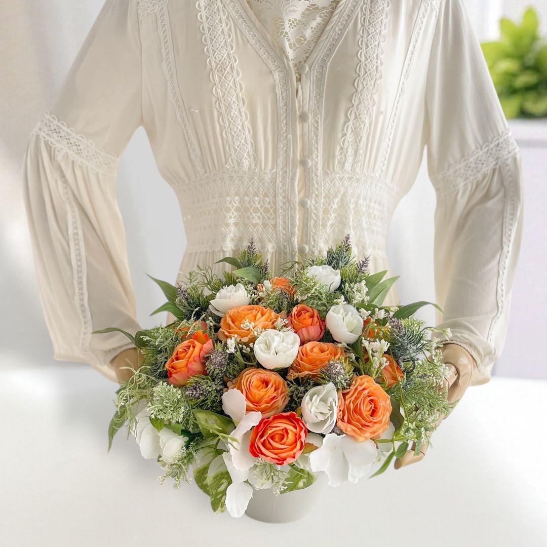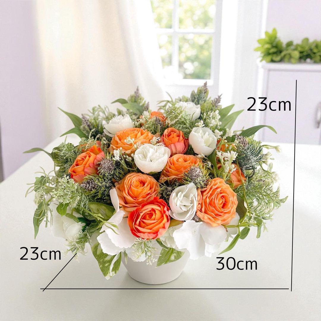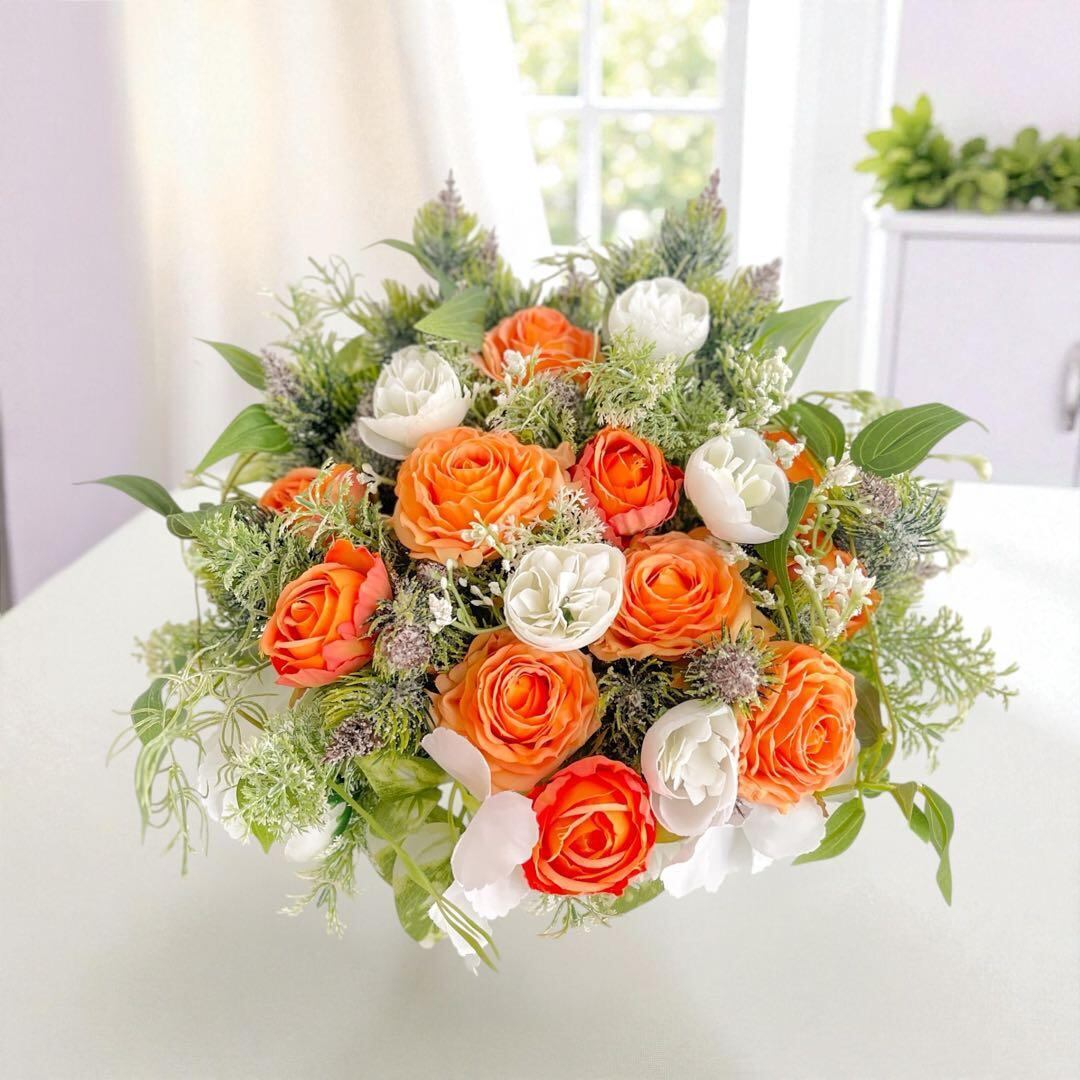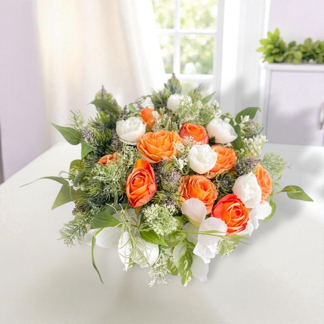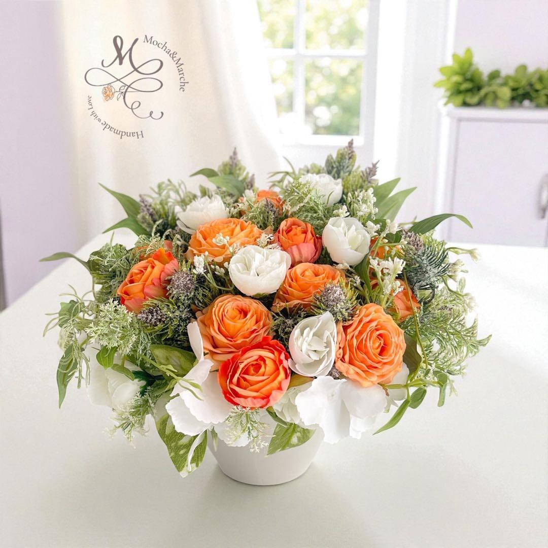 オレンジ&ホワイトローズの光触媒フラワーアレンジ|開店祝い・誕生日ギフト・造花 アーティフィシャルフラワー
