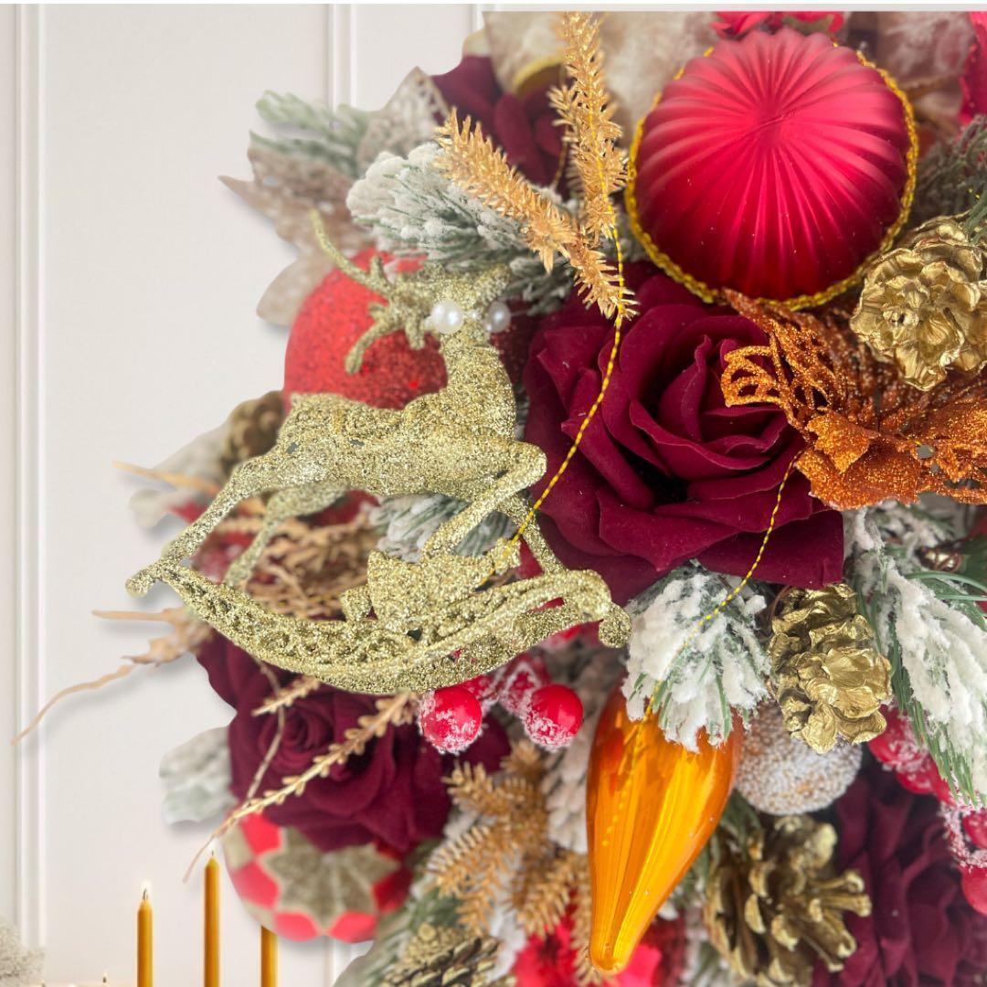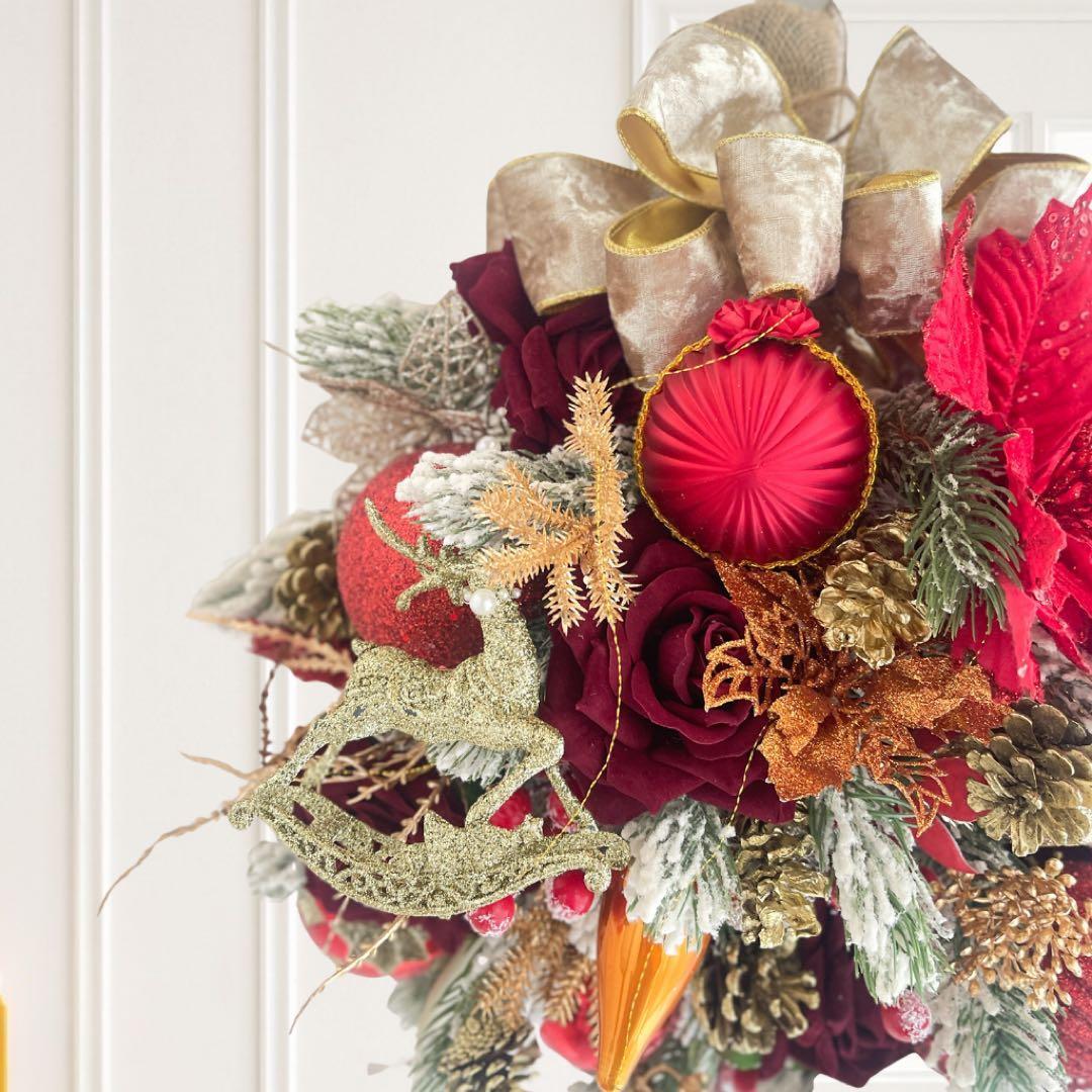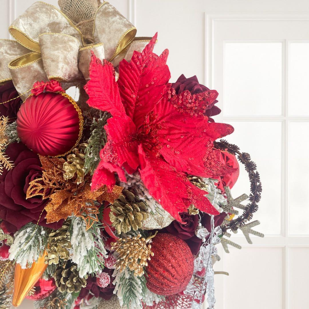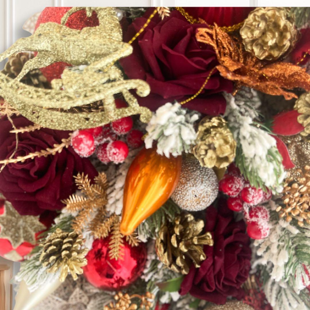 深みのあるレッドローズとゴールドのアクセントが織りなす、まるで“クリスマスの女王”のような圧倒的な存在感が魅力的なツリー型のクリスマスリースです。