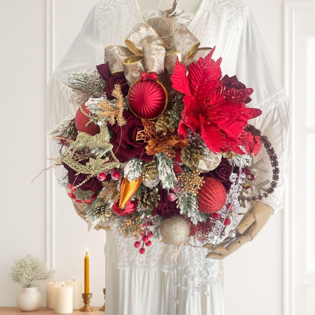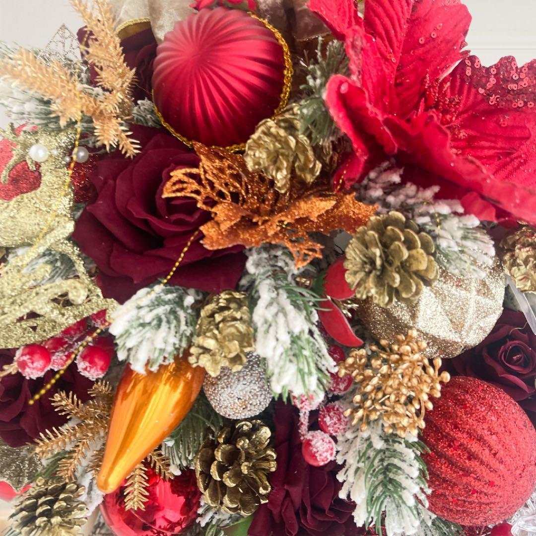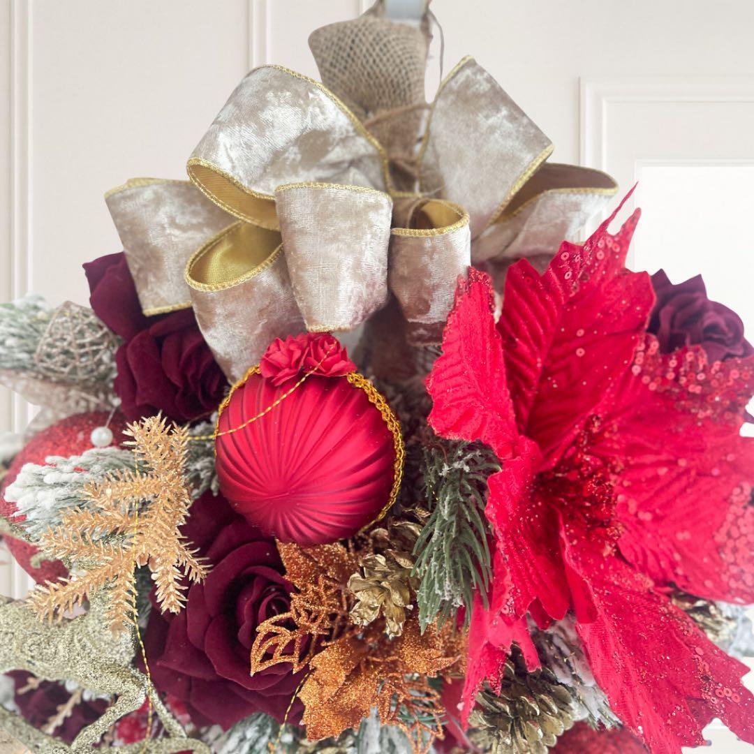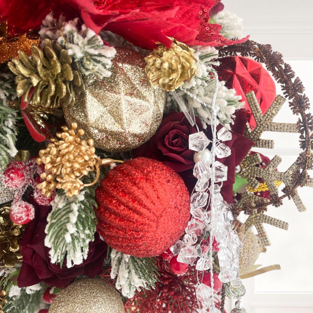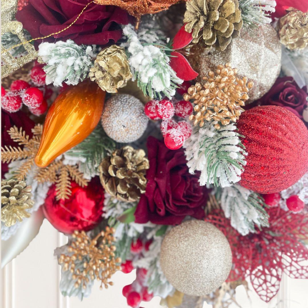 深みのあるレッドローズとゴールドのアクセントが織りなす、まるで“クリスマスの女王”のような圧倒的な存在感が魅力的なツリー型のクリスマスリースです。