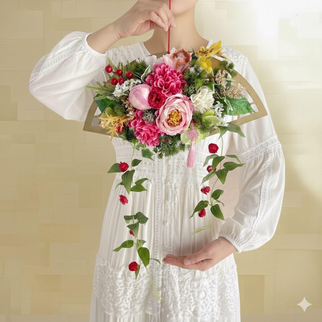 ゴールドベースの土台の凛とした佇まいに、アーティフィシャルフラワーを繊細に重ね、和の上品さと優雅なボリュームを両立。