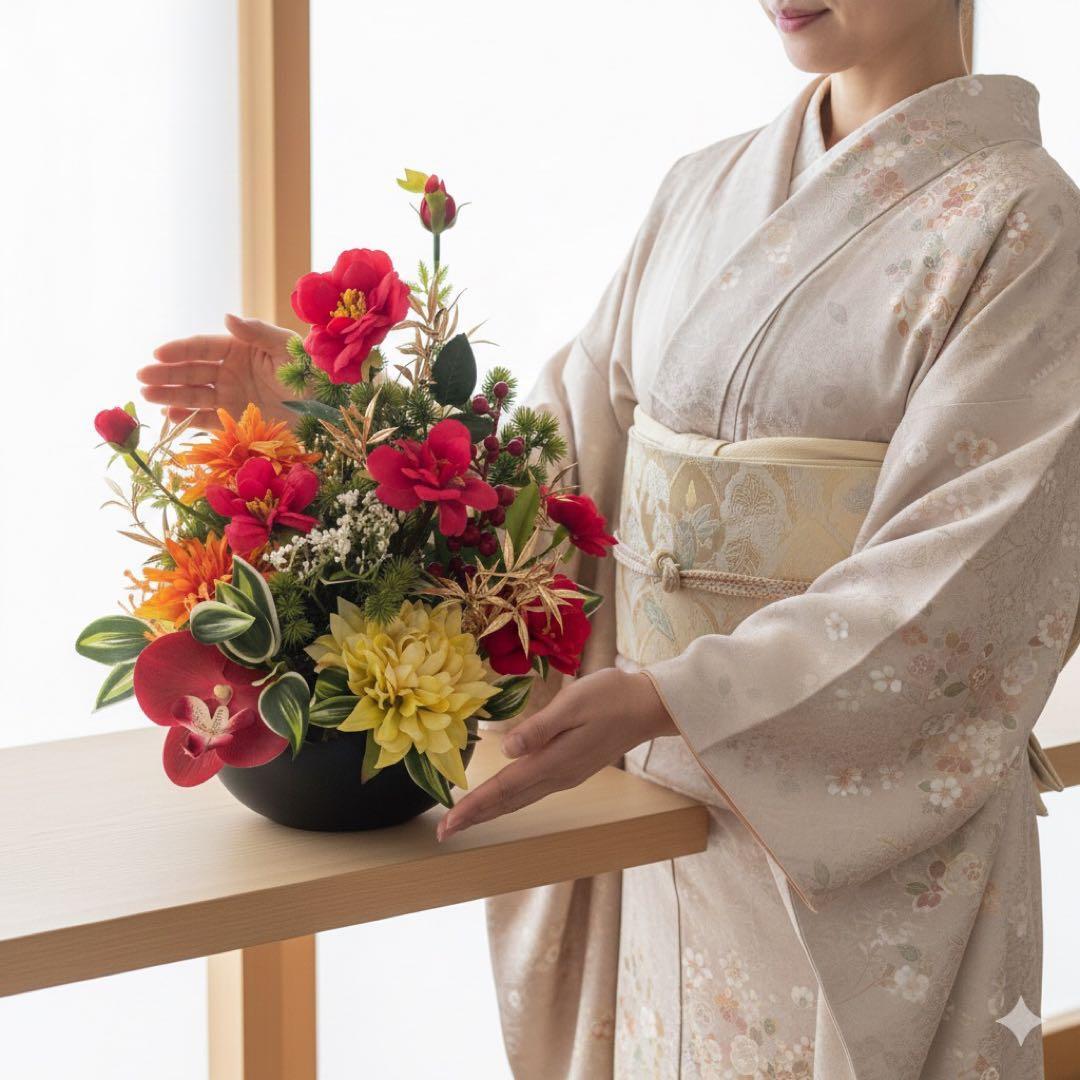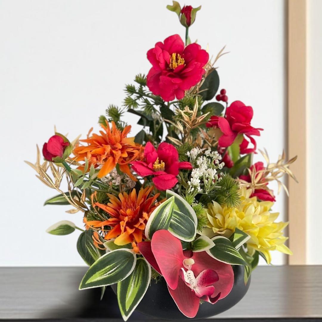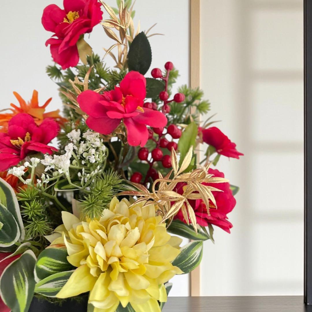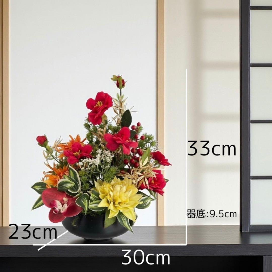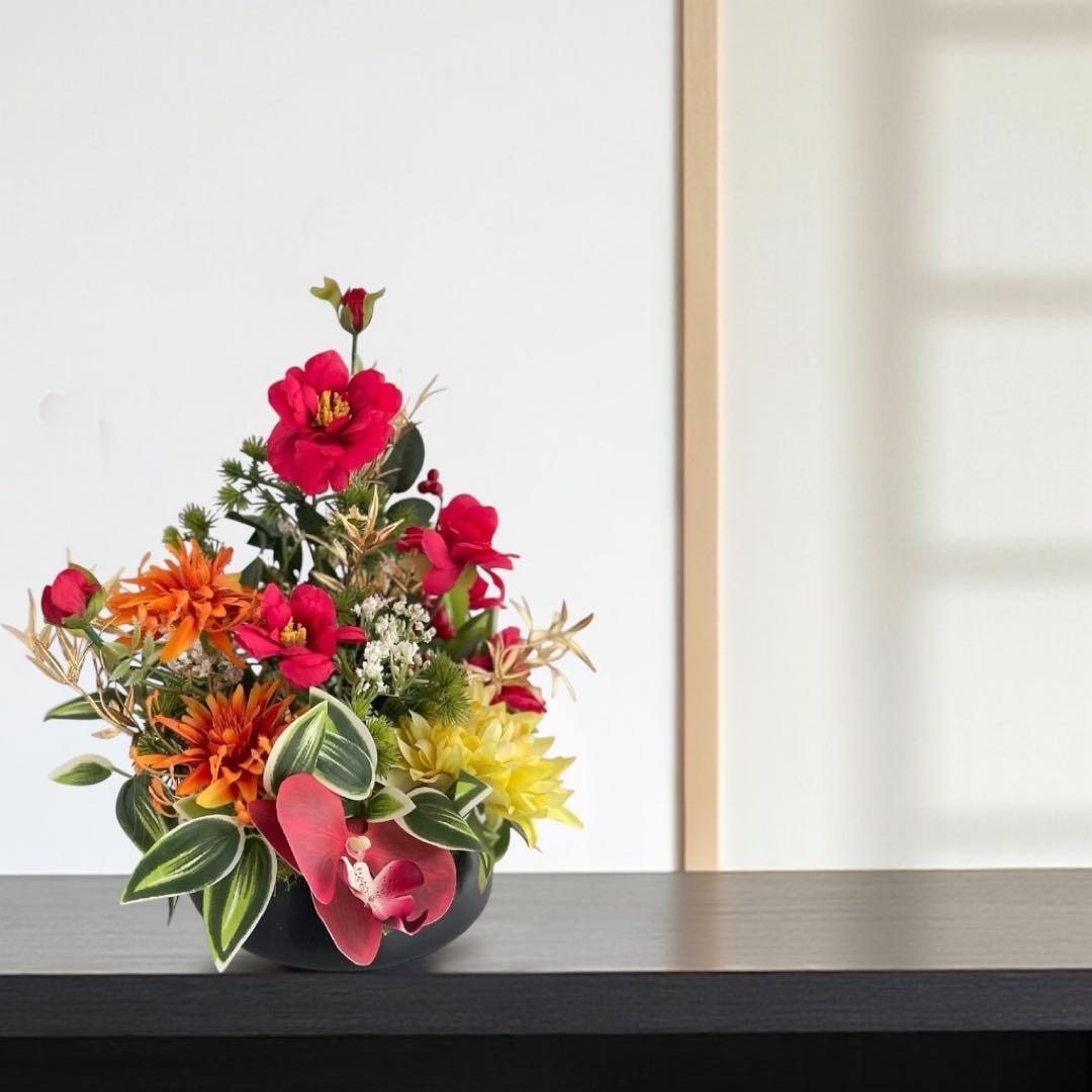 モダン和アレンジメント|ダリア・椿・胡蝶蘭の上質お祝い花|玄関・和室・お正月 アーティフィシャルフラワー