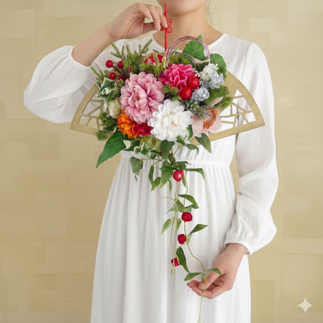 ゴールドベースの土台の凛とした佇まいに、アーティフィシャルフラワーを繊細に重ね、和の上品さと優雅なボリュームを両立。