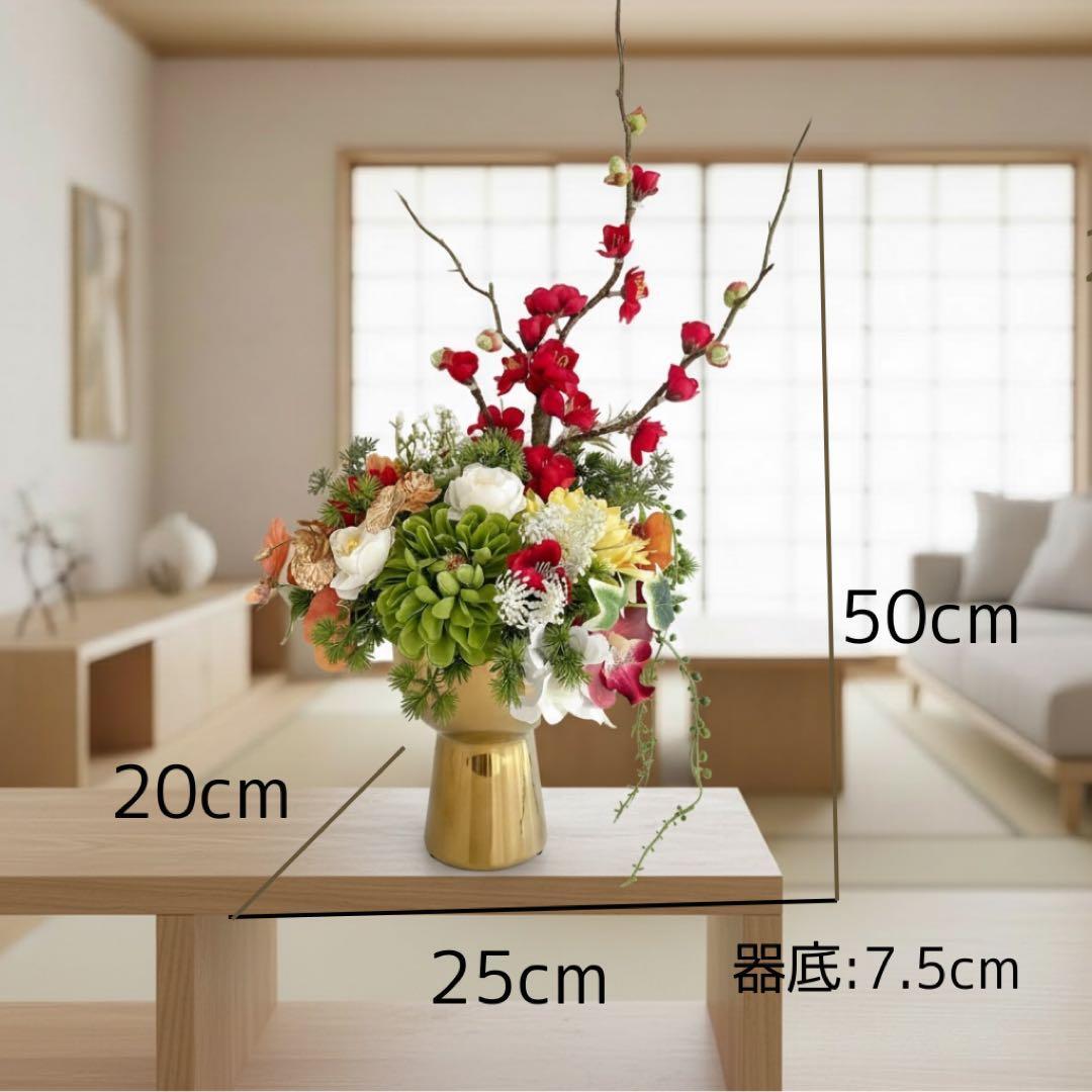 《迎春の光彩》金彩モダン和アレンジメント – 梅と牡丹が華やぐ新年の祝花 造花 正月アレンジ 迎春飾り