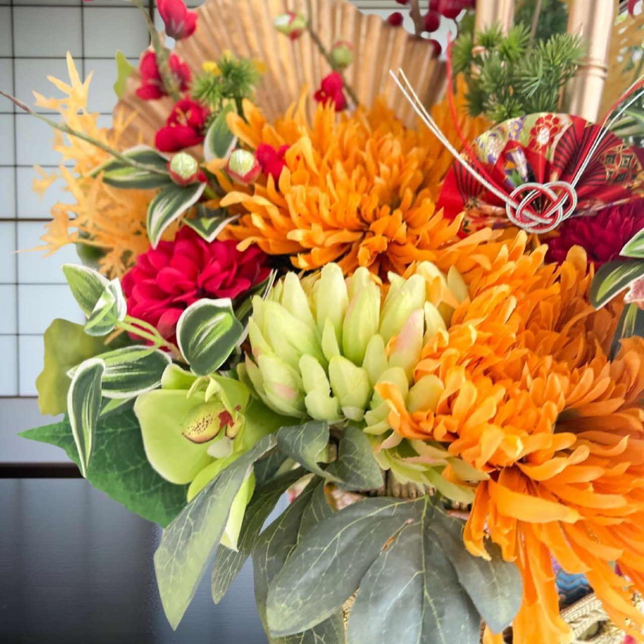 松・竹・梅をはじめ、優雅な菊、蘭、シンビジウム、木蓮、紅葉、千両などをふんだんに使用し、和の格式と華やかさを存分に閉じ込めました。