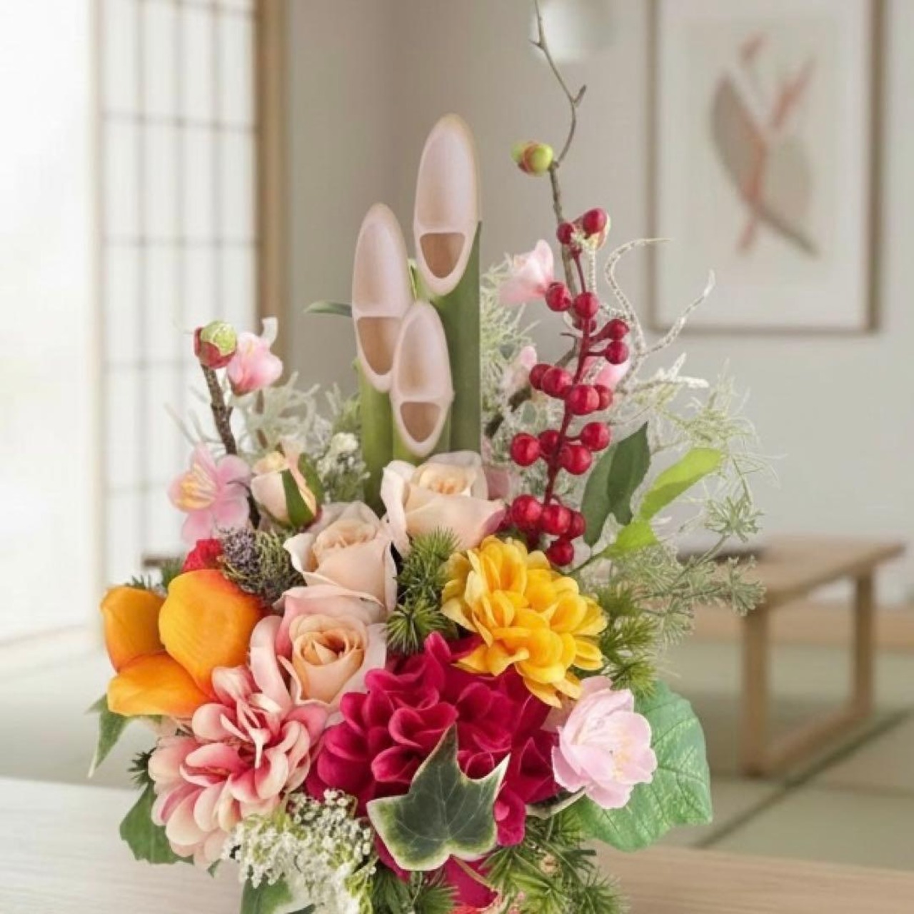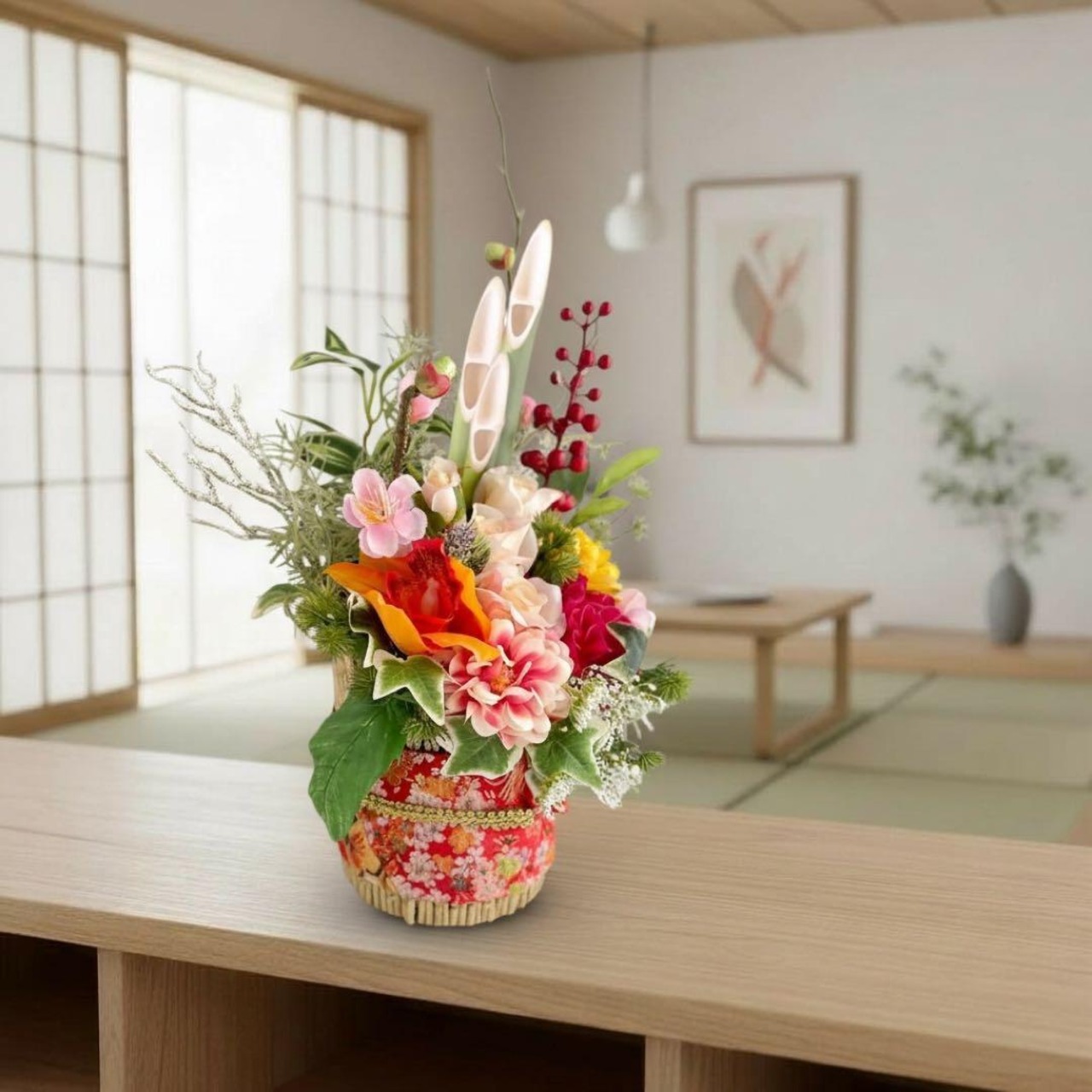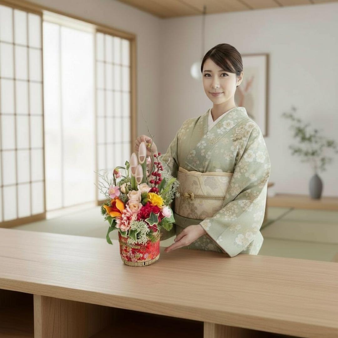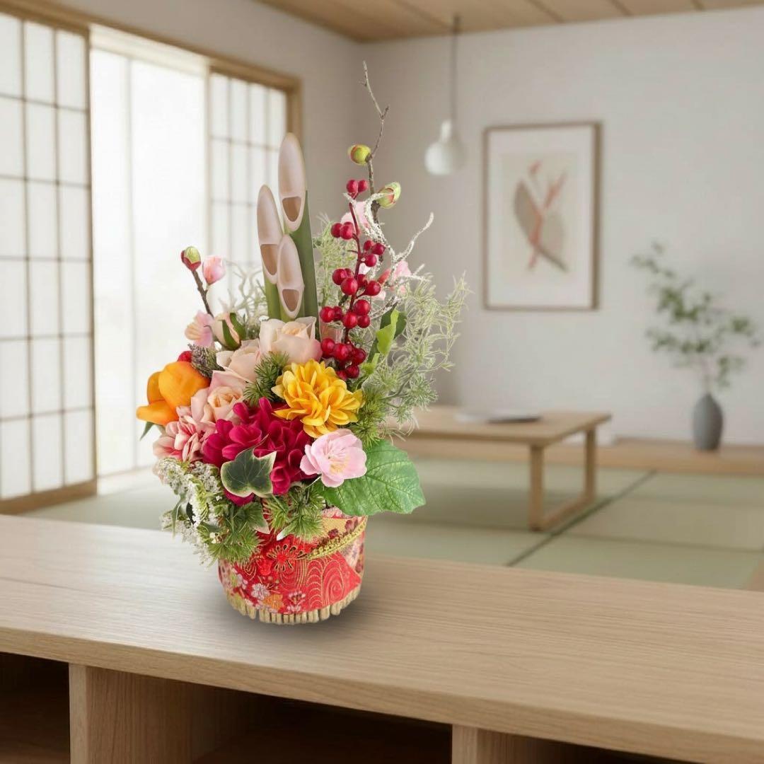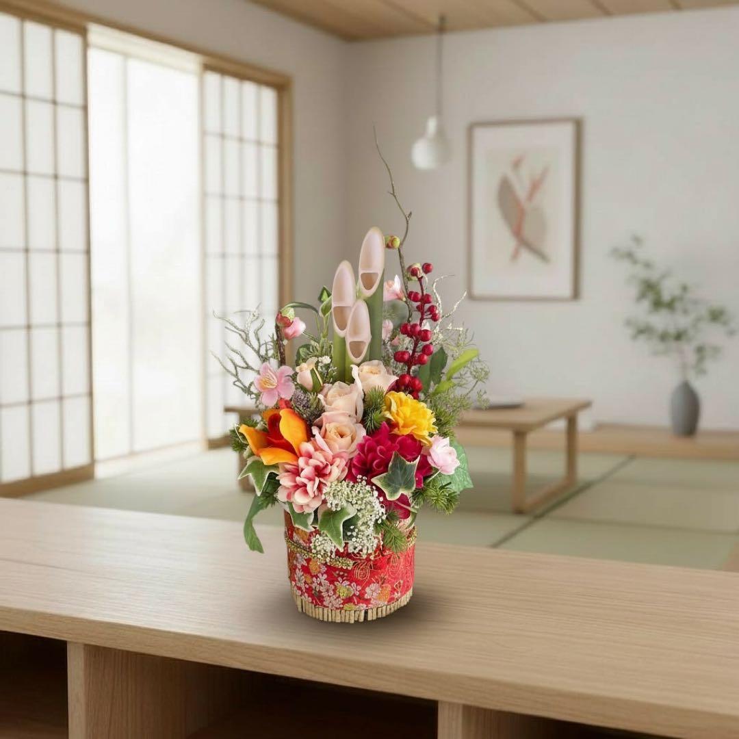 お正月を過ぎても「和のフラワーアレンジメント」として長くお楽しみいただけます。