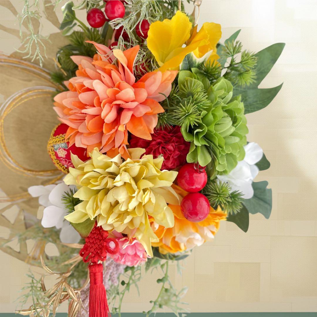 ゴールドベースの土台の凛とした佇まいに、アーティフィシャルフラワーを繊細に重ね、和の上品さと優雅なボリュームを両立。