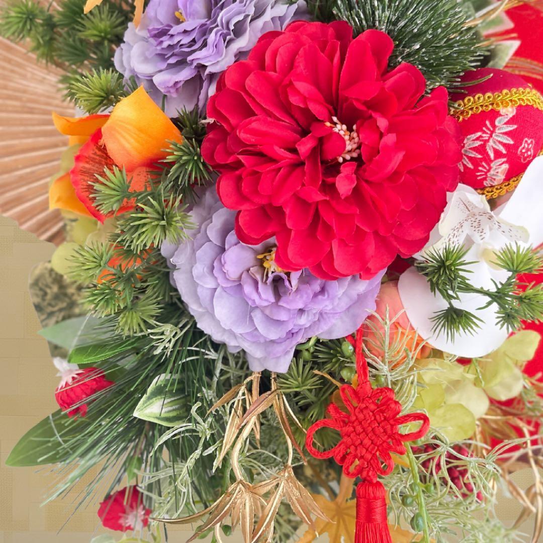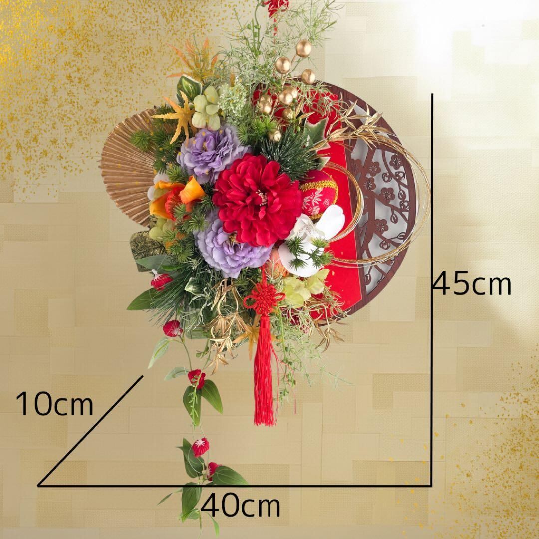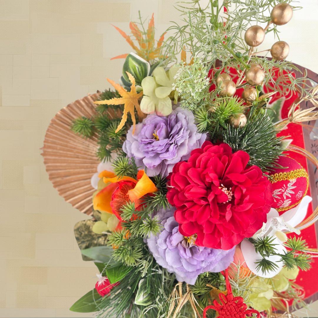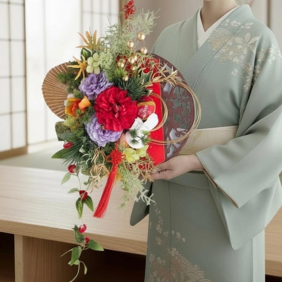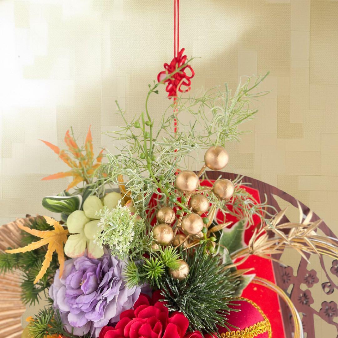 さらに、縁起物の飾り紐や金の実もの、流れるグリーンのしずくラインが美しく揺れ、迎春ムードをより豊かに彩ります。