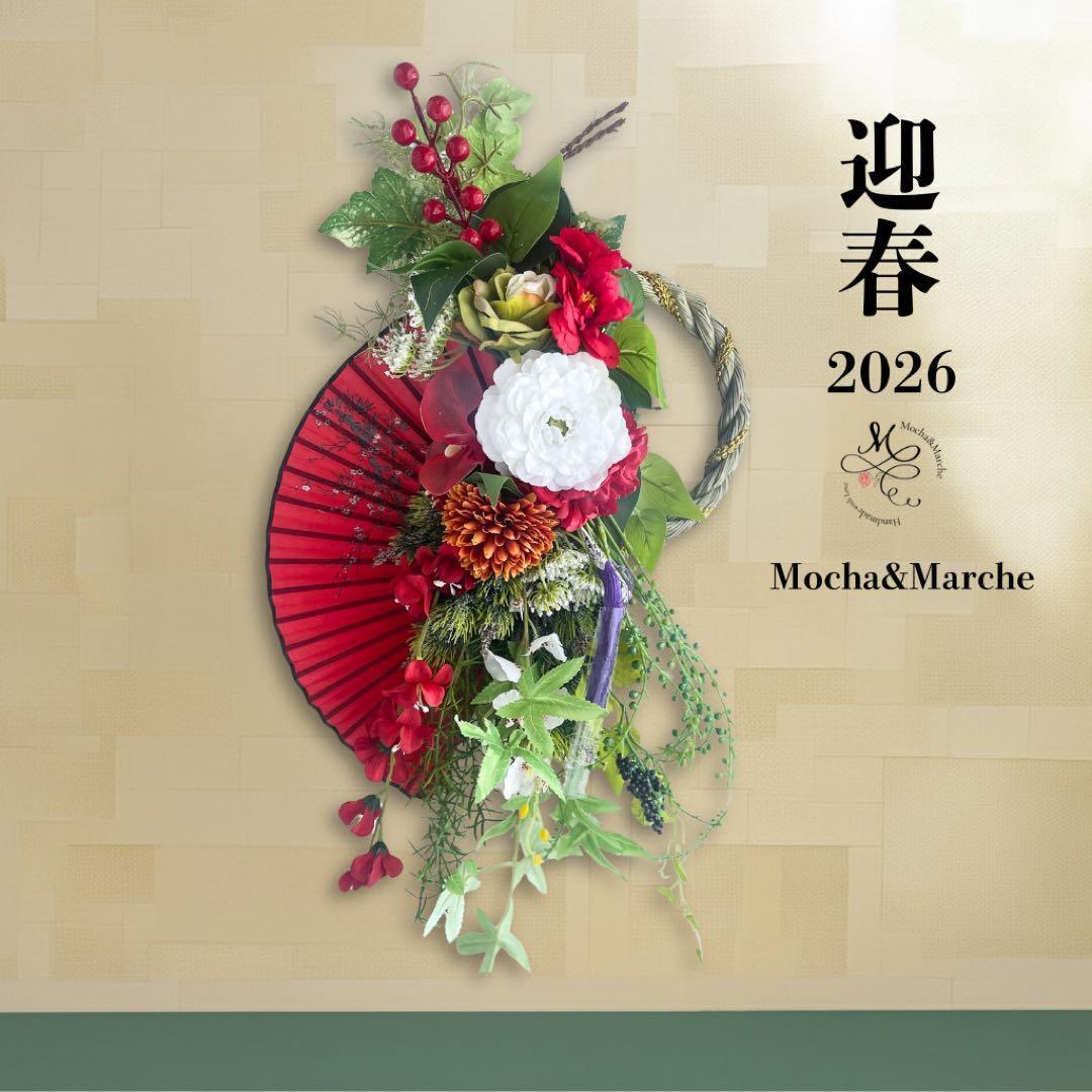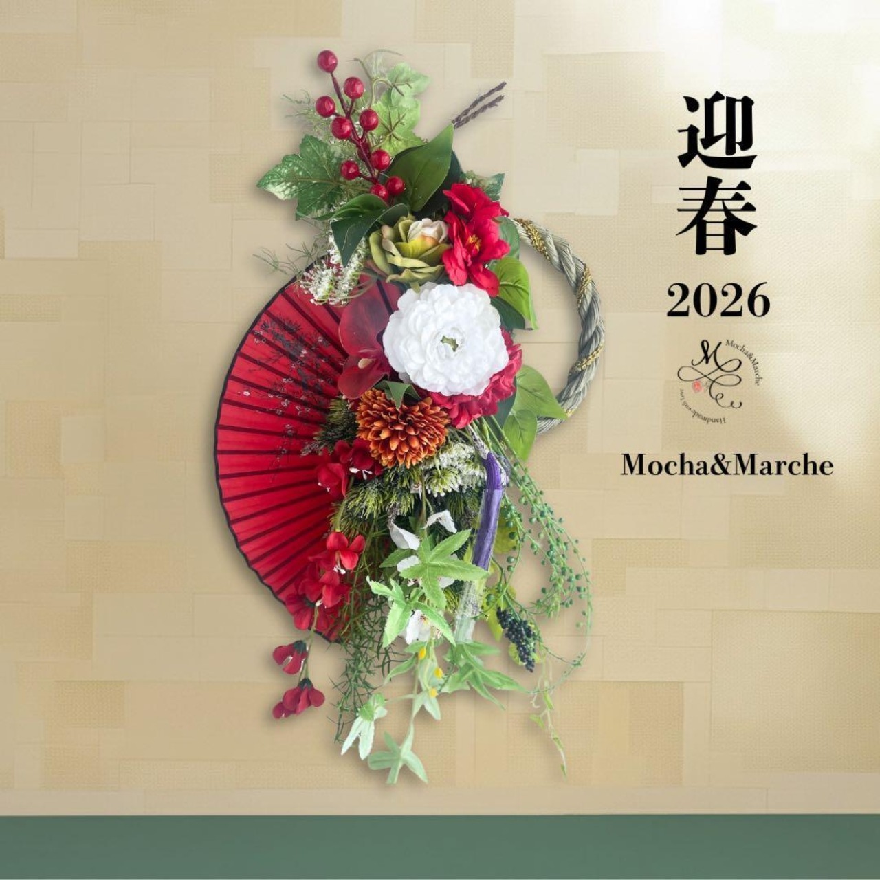 一年のはじまりを凛と彩る、モカアンドマルシェの新シリーズ**「扇しめ縄アレンジメント〈縦長コンパクト〉」**が誕生しました。