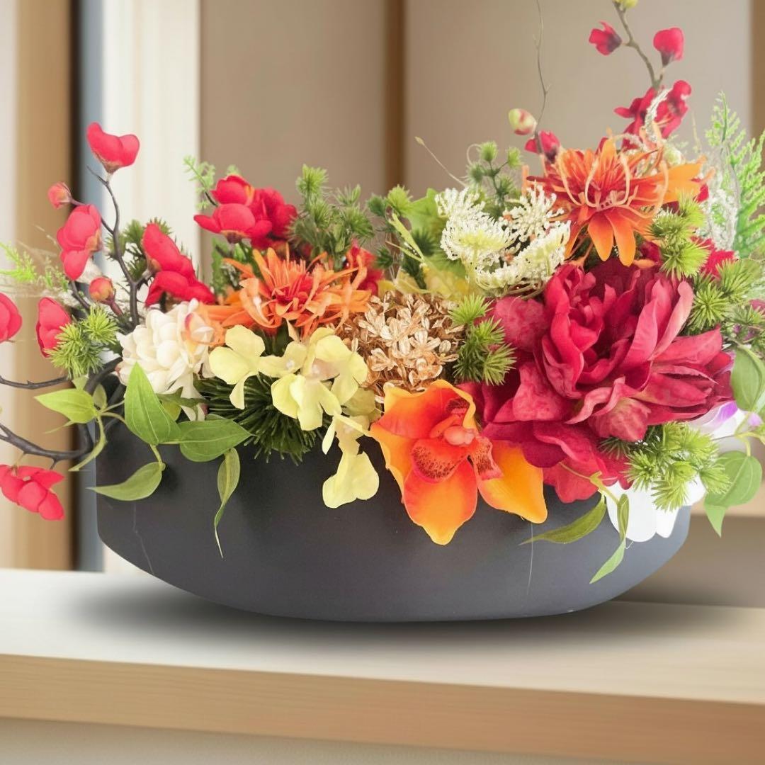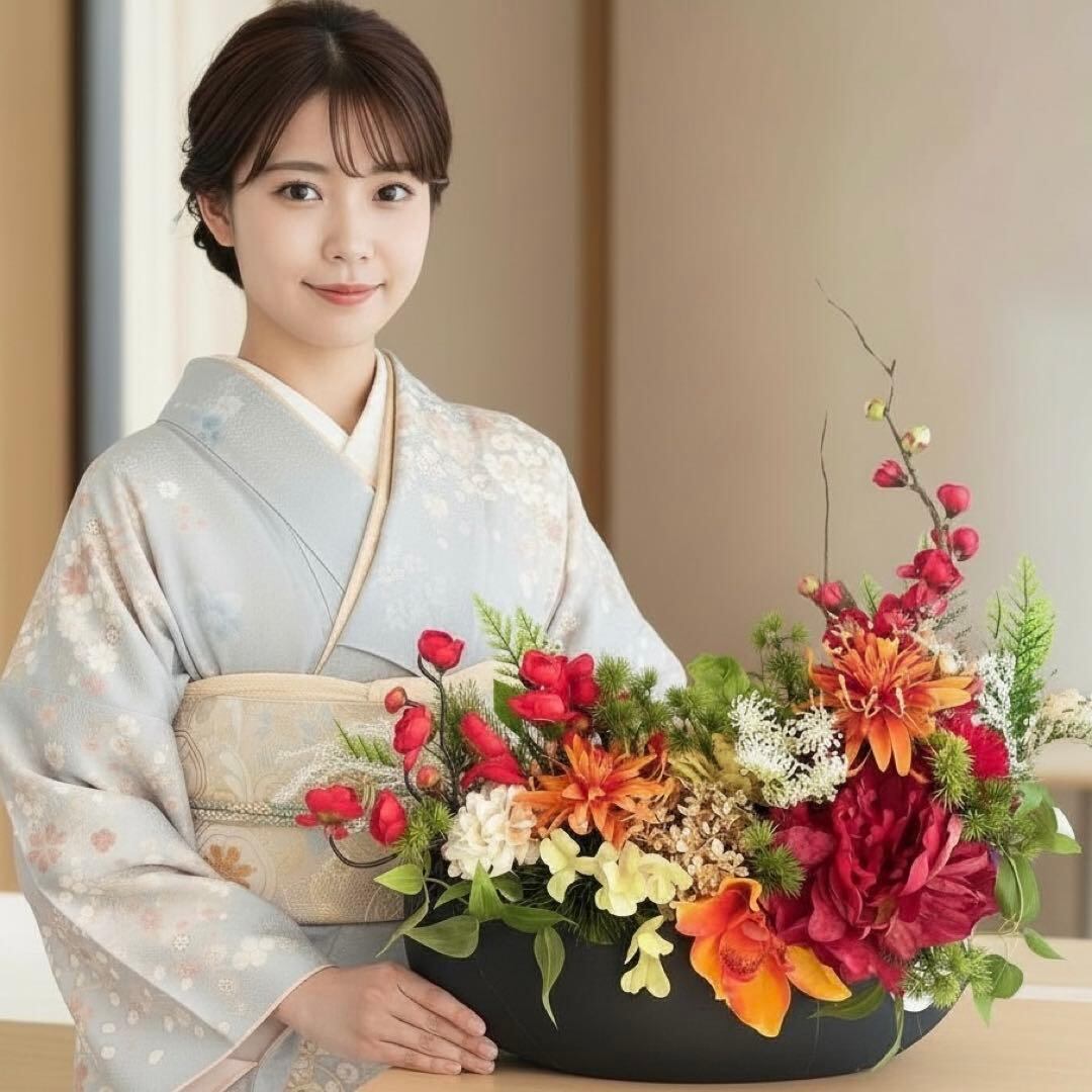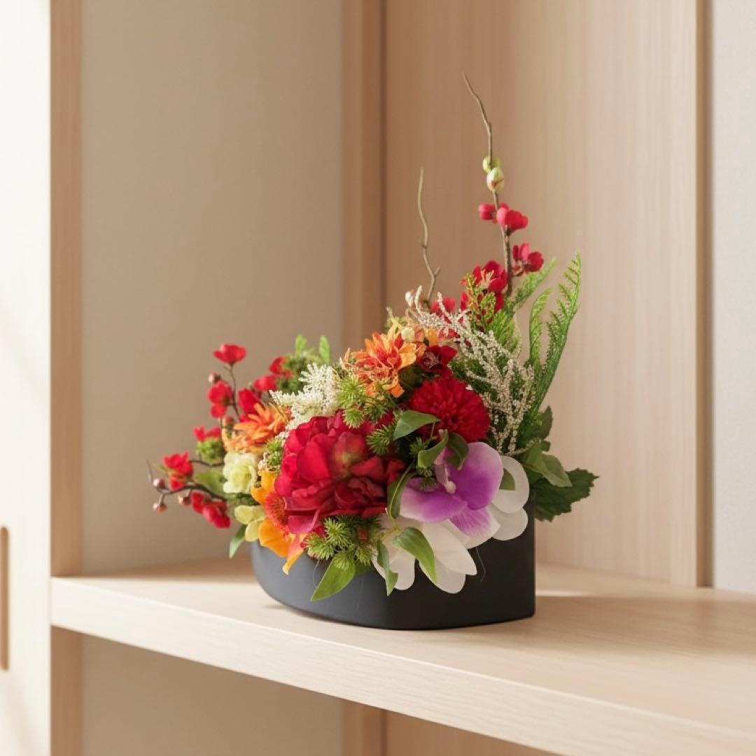 梅・ダリア・シンビジウム・大輪のボタン・松など、お正月を華やかに彩る花々を贅沢にあしらいながら、季節を問わず飾れる“上質な和モダンデザイン”に仕上げました。