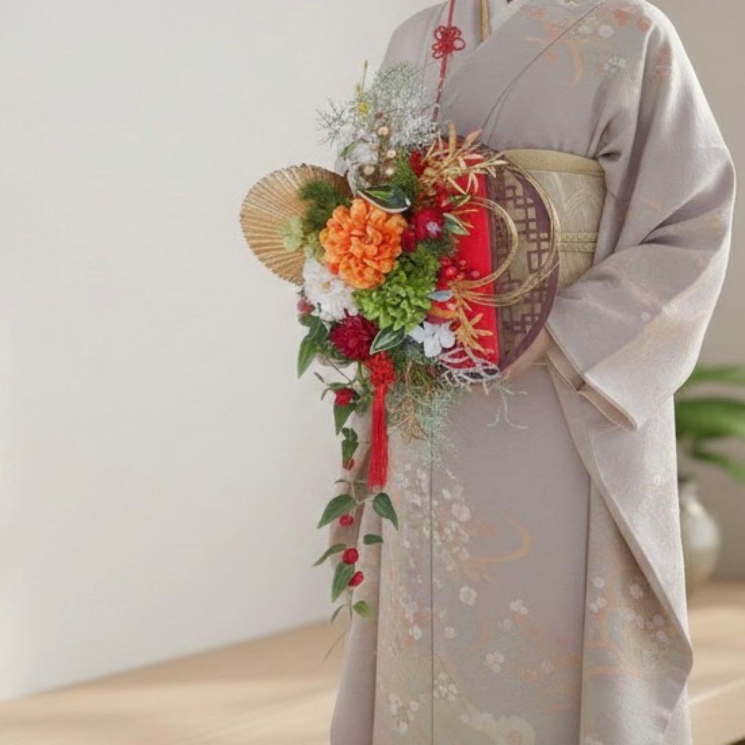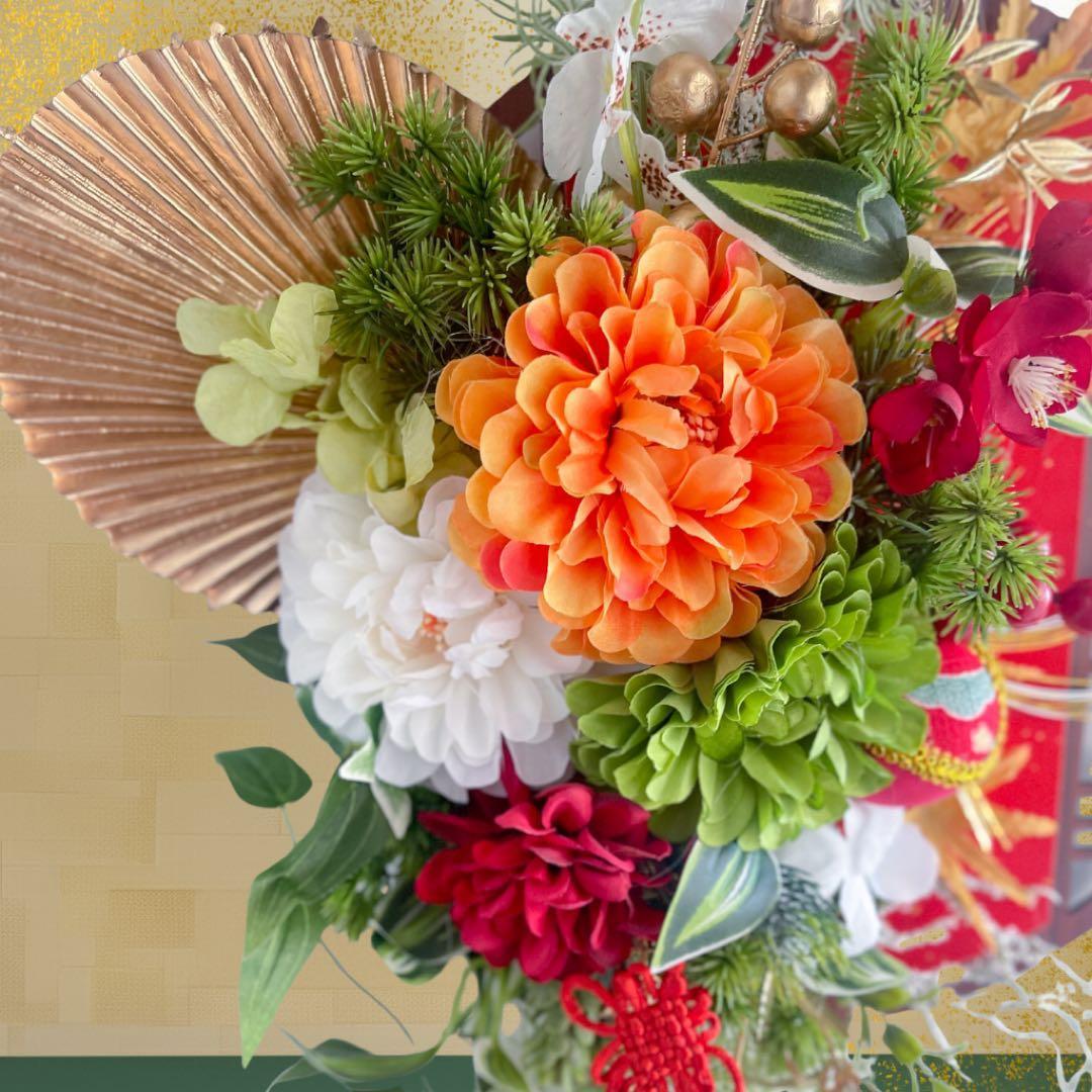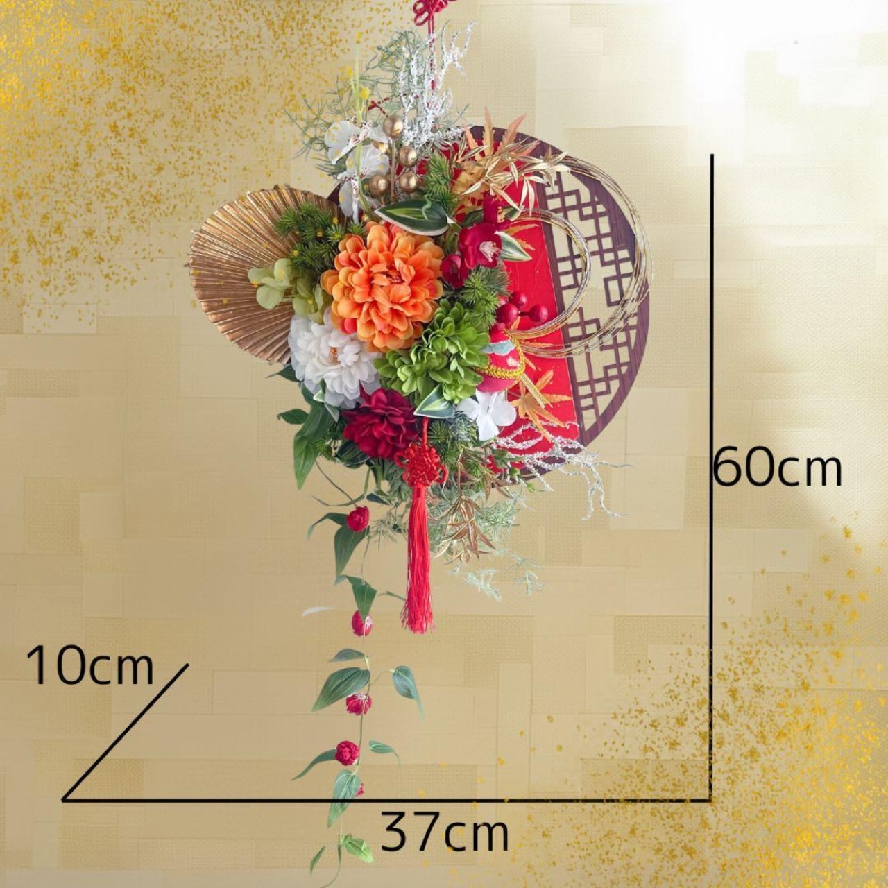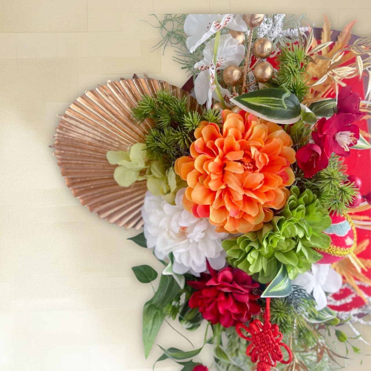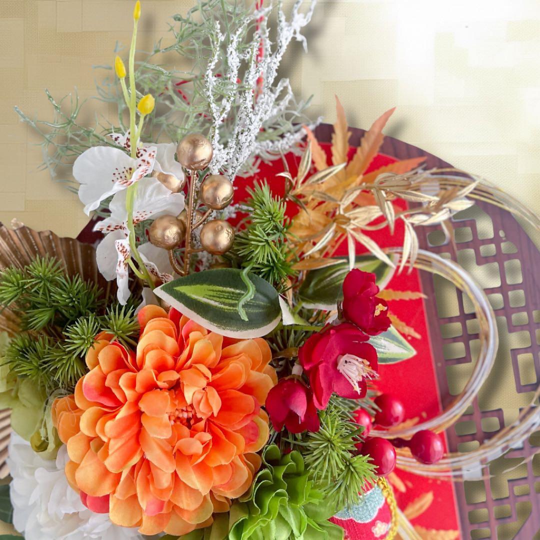 さらに、縁起物の飾り紐や金の実もの、流れるグリーンのしずくラインが美しく揺れ、迎春ムードをより豊かに彩ります。