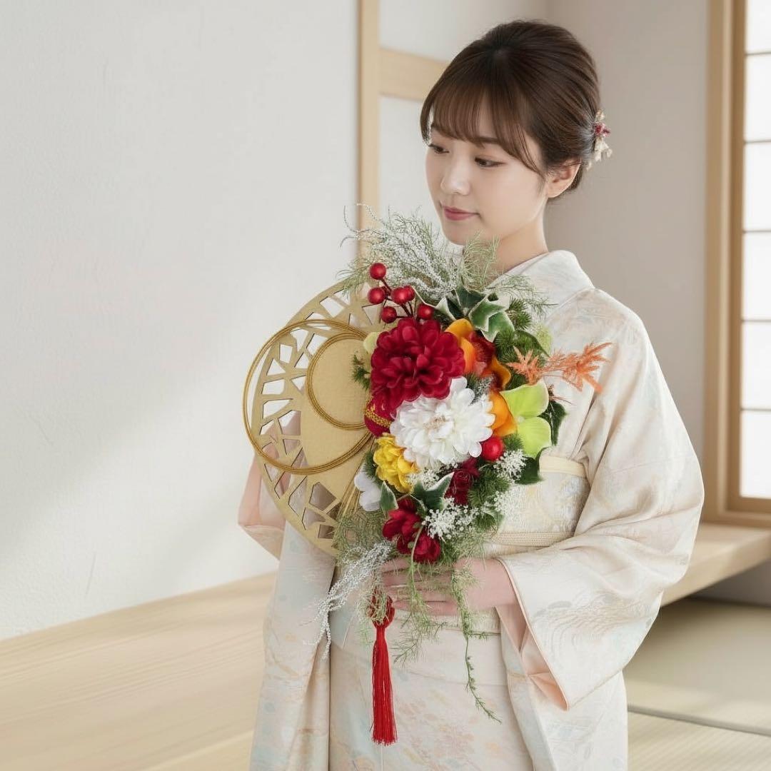 ゴールドベースの土台の凛とした佇まいに、アーティフィシャルフラワーを繊細に重ね、和の上品さと優雅なボリュームを両立。