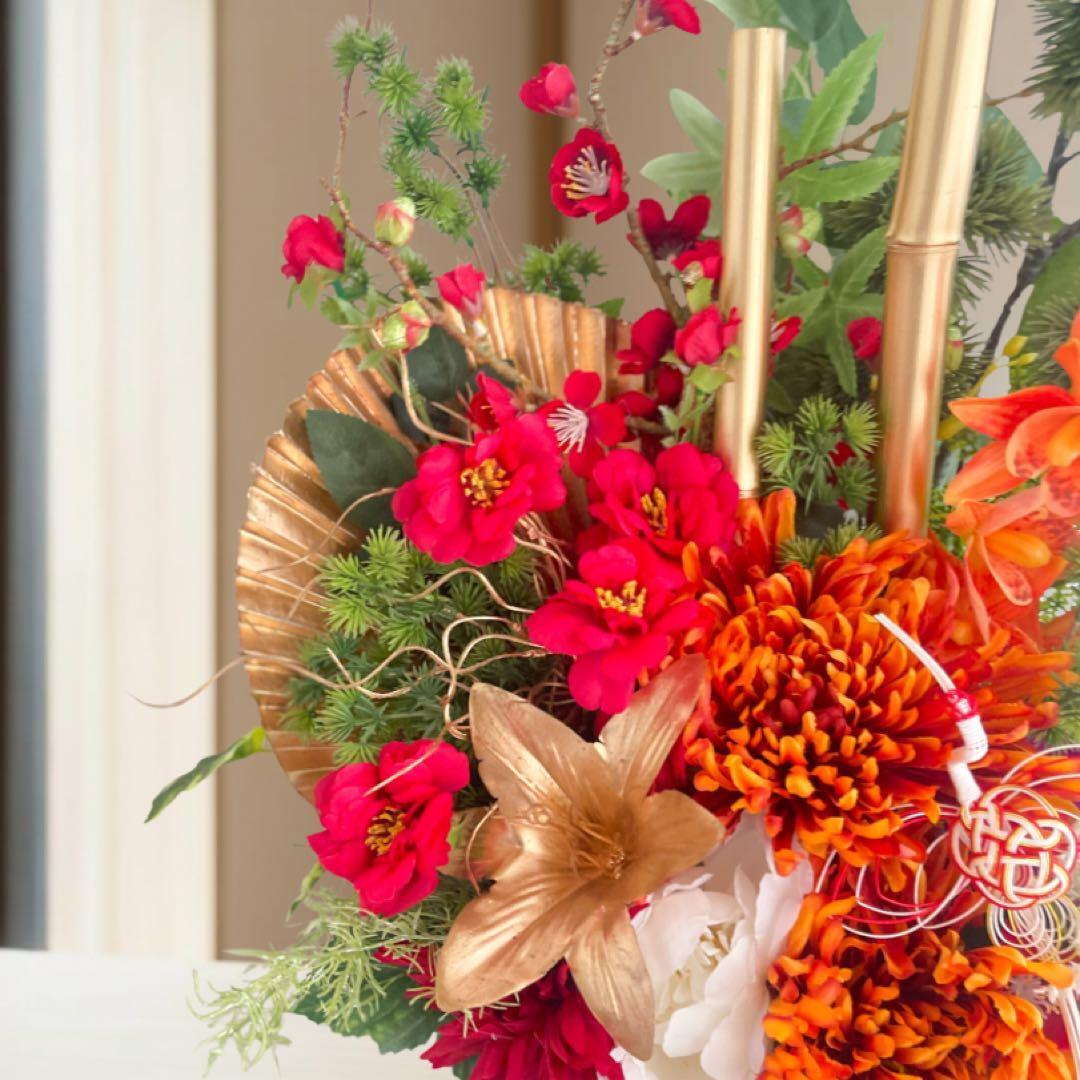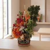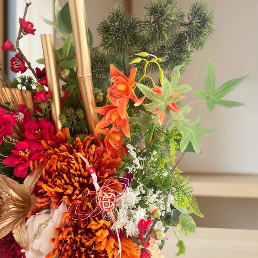 松・竹・梅の《松竹梅》を象徴させながら、中央には力強く咲き誇る特大菊、重なるように咲くダリア、椿、デンドロビウム、そして紅葉の彩りを加え、日本の四季の豊かさをぎゅっと結晶のように閉じ込めたデザイン。