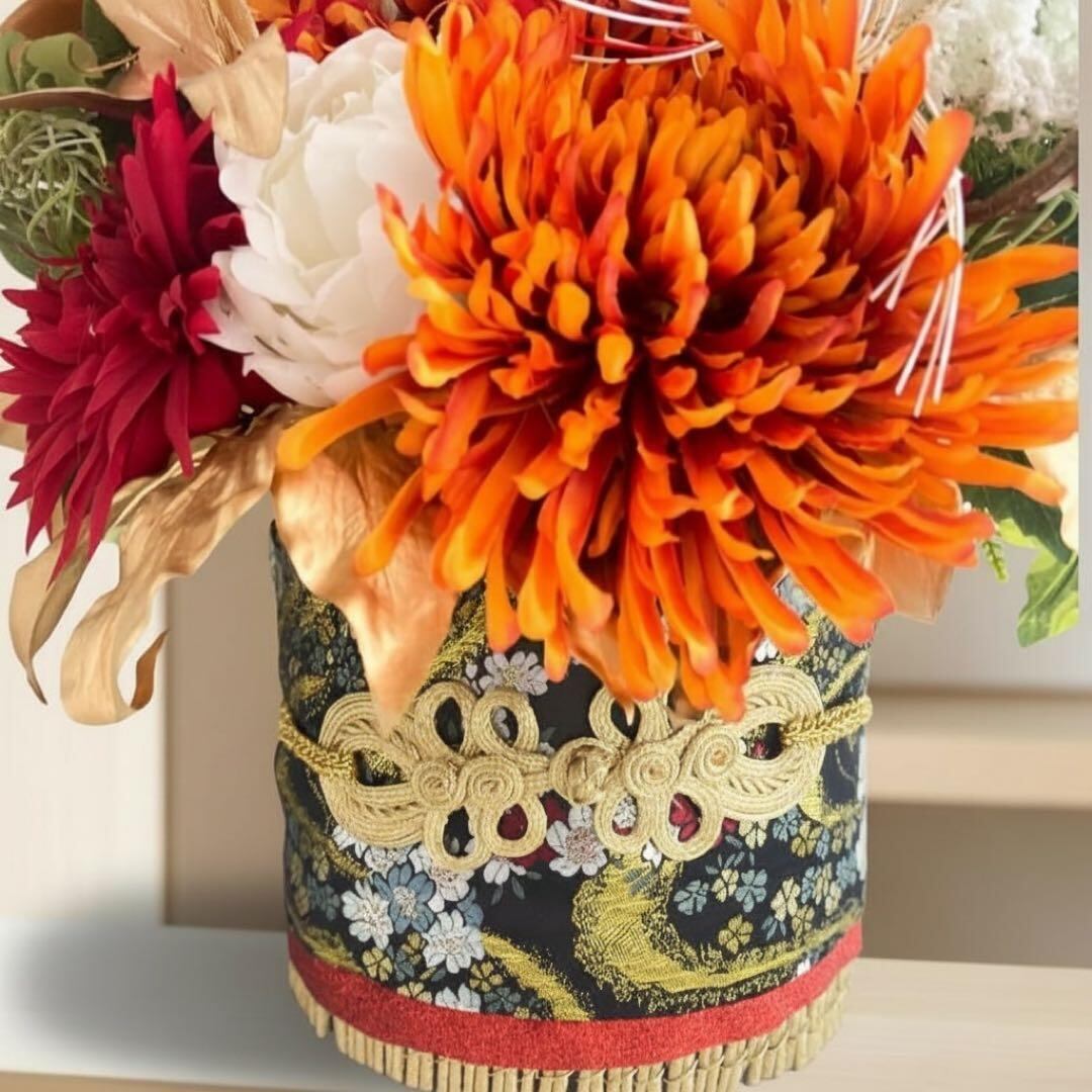 本物の帯と豪華な帯締めを贅沢に使用し、伝統美と華やぎを併せ持つ“格のある迎春装飾”として仕上げました。
