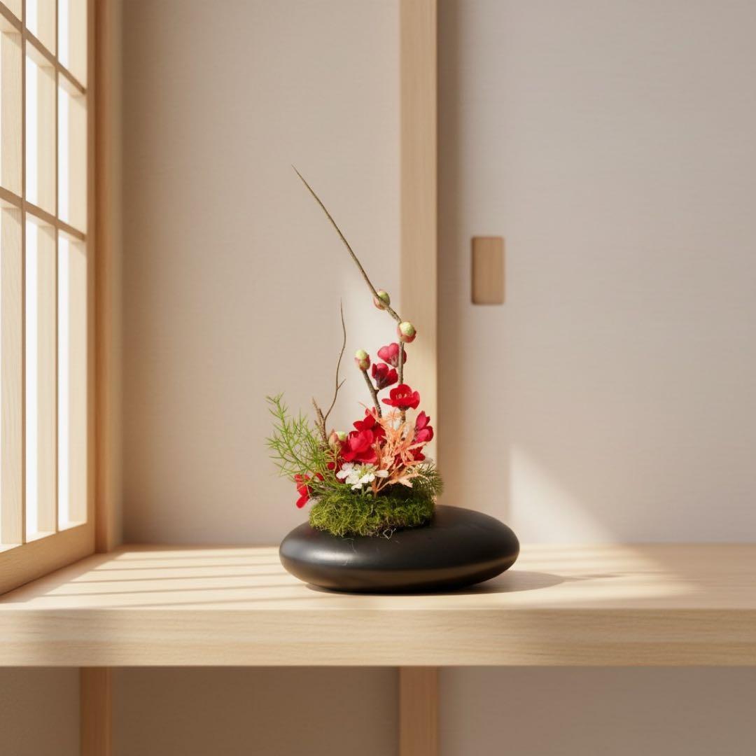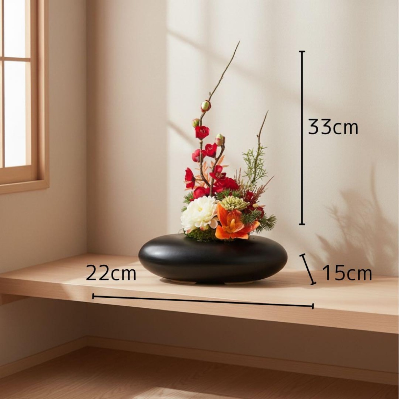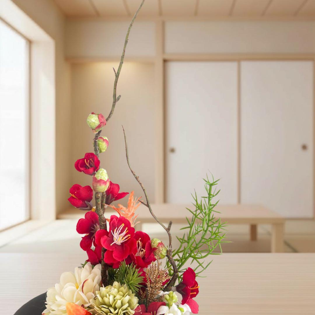 黒のオーバル花器に、紅の梅をすっと立ち上がらせた和モダンアレンジメントです。