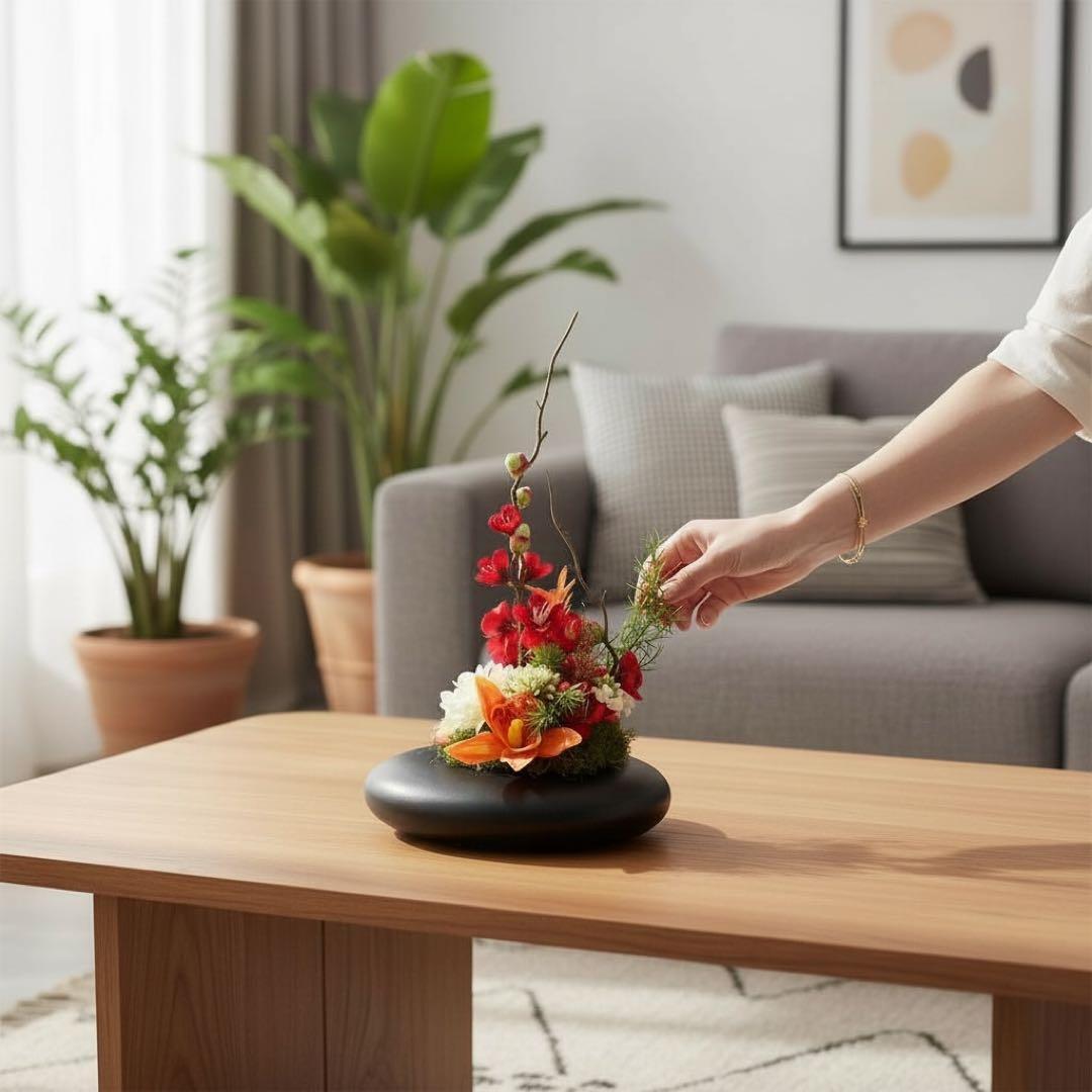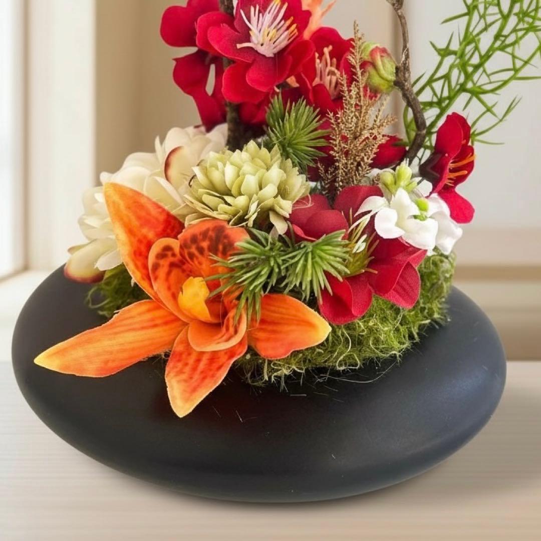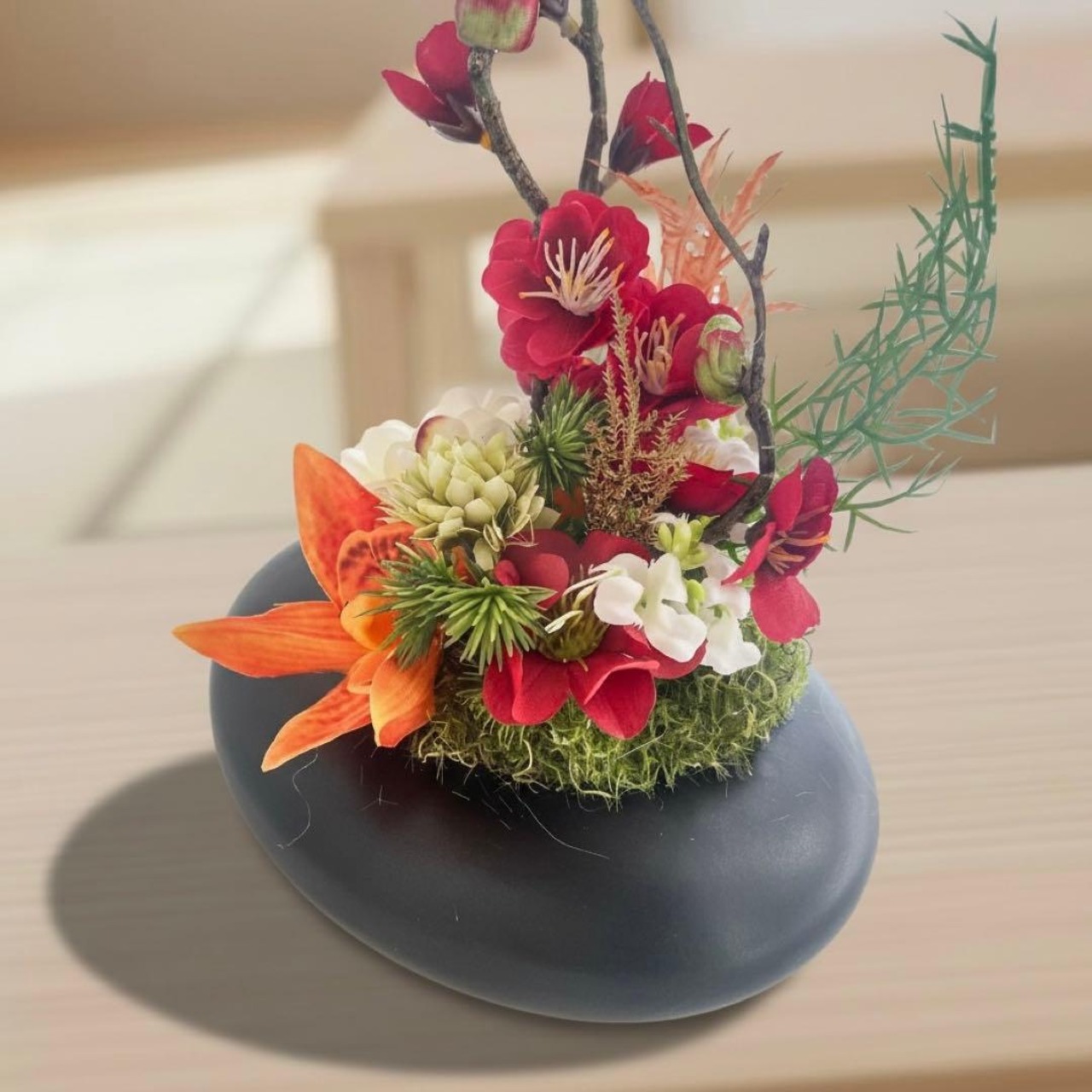 黒のオーバル花器に、紅の梅をすっと立ち上がらせた和モダンアレンジメントです。