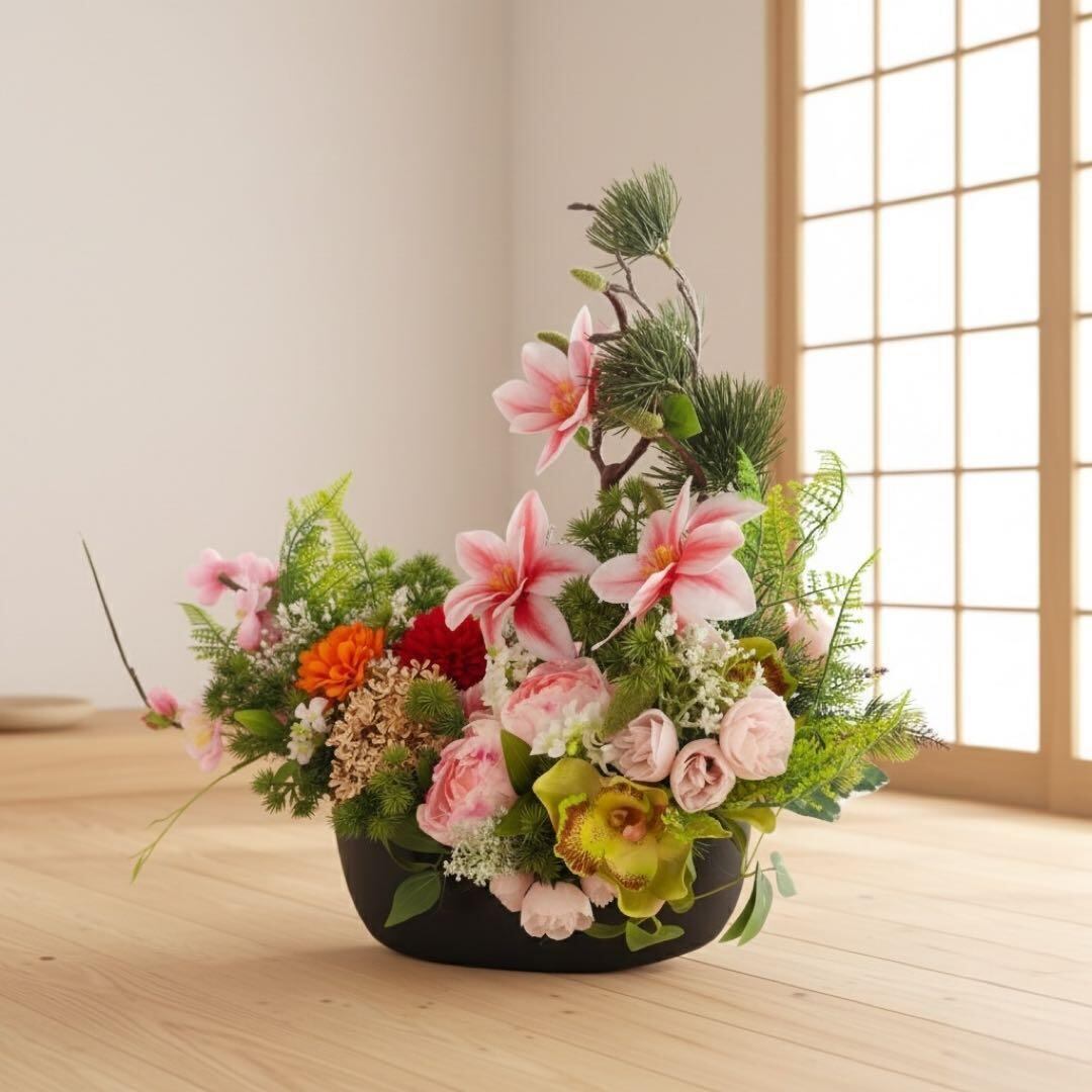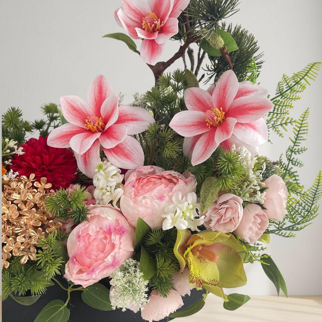 淡いピンクの木蓮に、松・梅を添え、ゴールドが上品にきらめくハイドレンジア、ころんと愛らしいポンポンマム、やさしい表情のローズを重ねました。