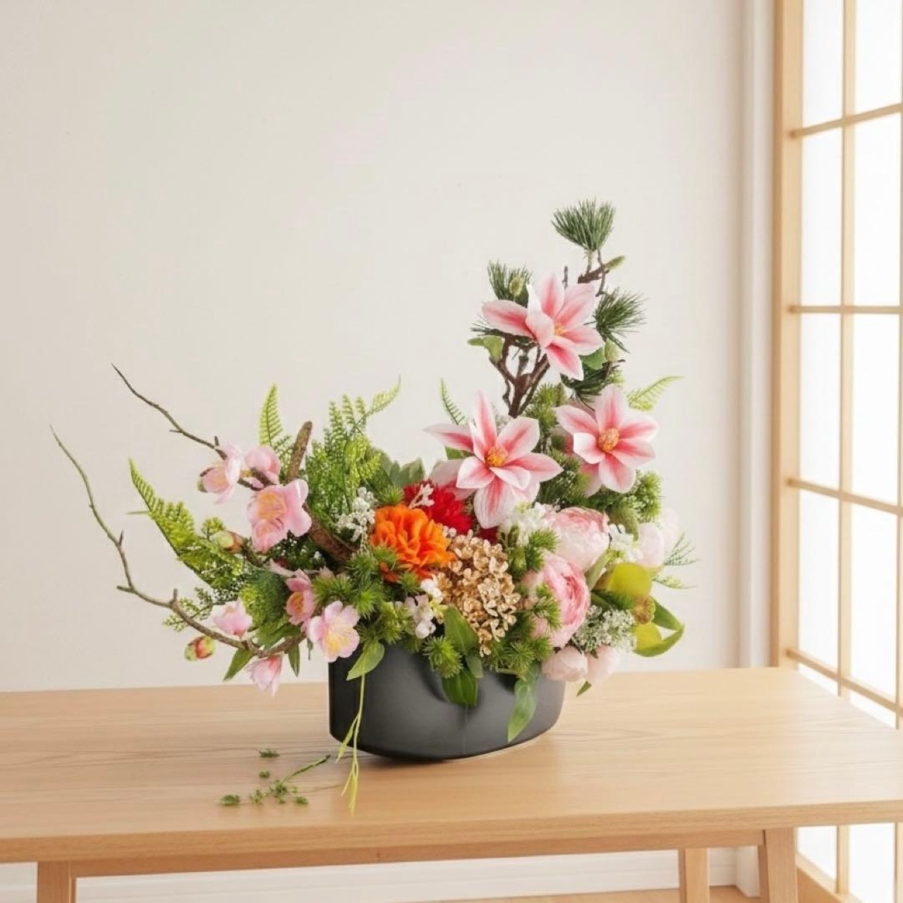 木蓮が咲き誇る オーバルモダンアレンジメント|横長デザイン・光触媒フラワー アーティフィシャルフラワー