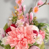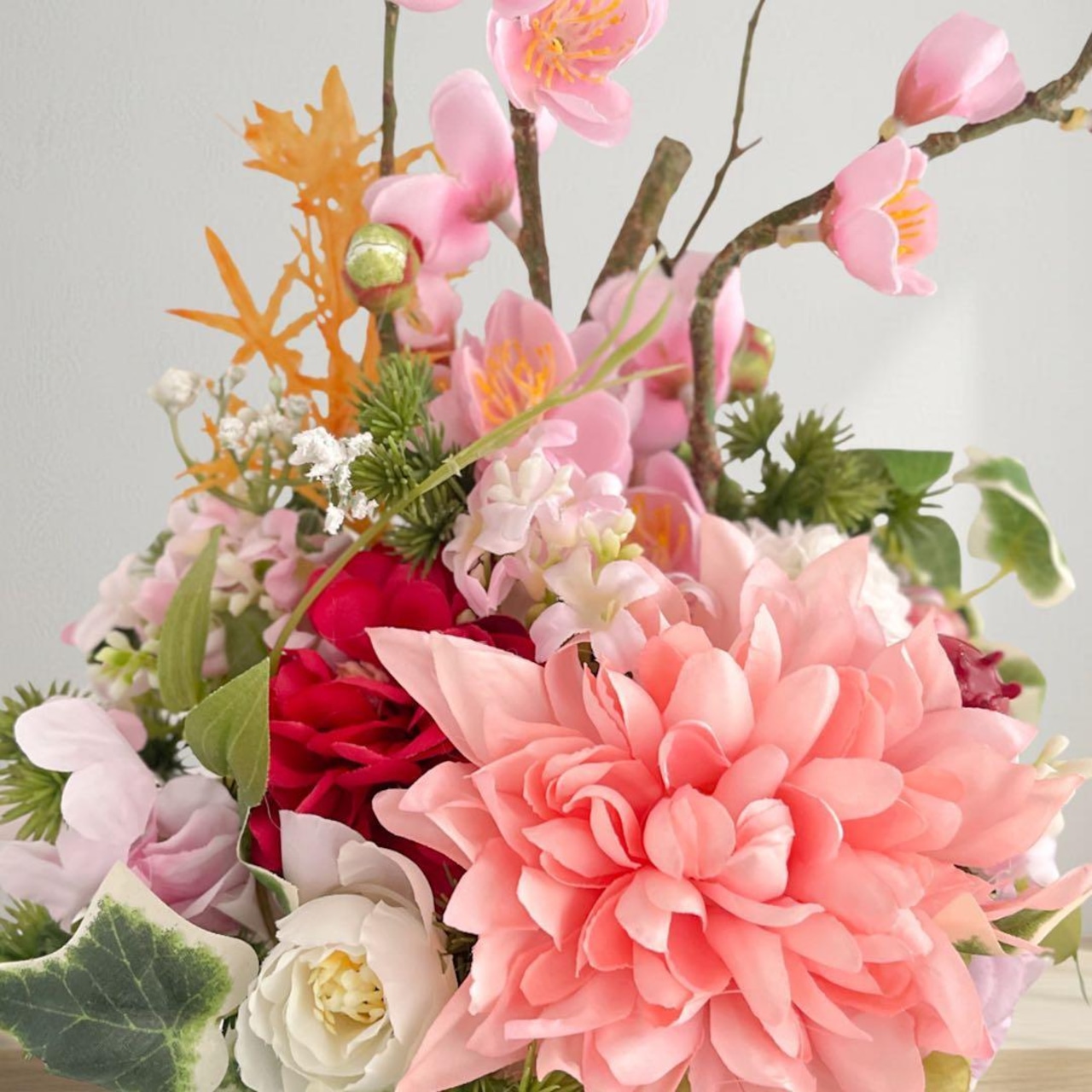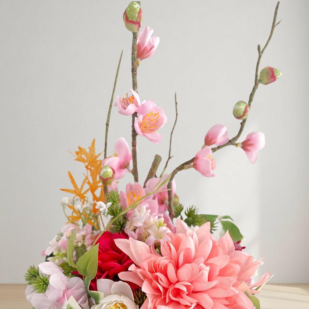 梅の可憐な枝ぶり、ふわりと咲くダリア、瑞々しい松やダリアが重なり合い、まるで小さな庭がテーブルの上に広がるような優しい存在感に仕上げました。