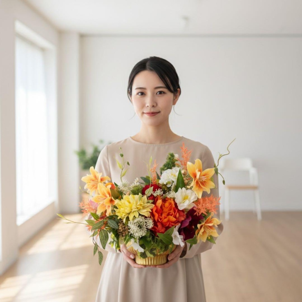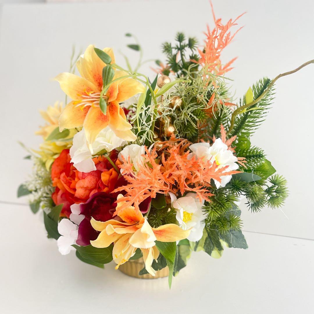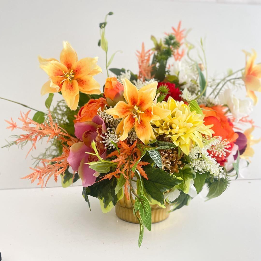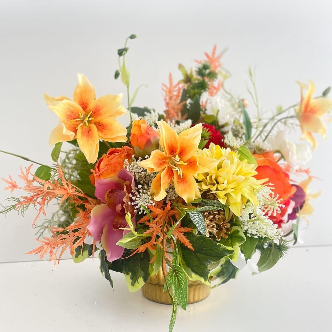 縦のラインが美しく入ったゴールドの花器に、和と洋の花々を贅沢に咲かせた、存在感あふれるフラワーアレンジメントです。