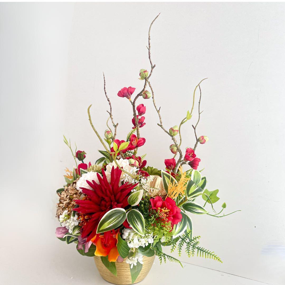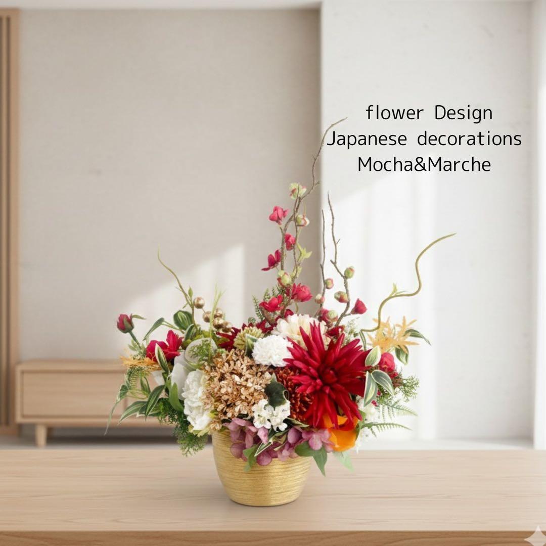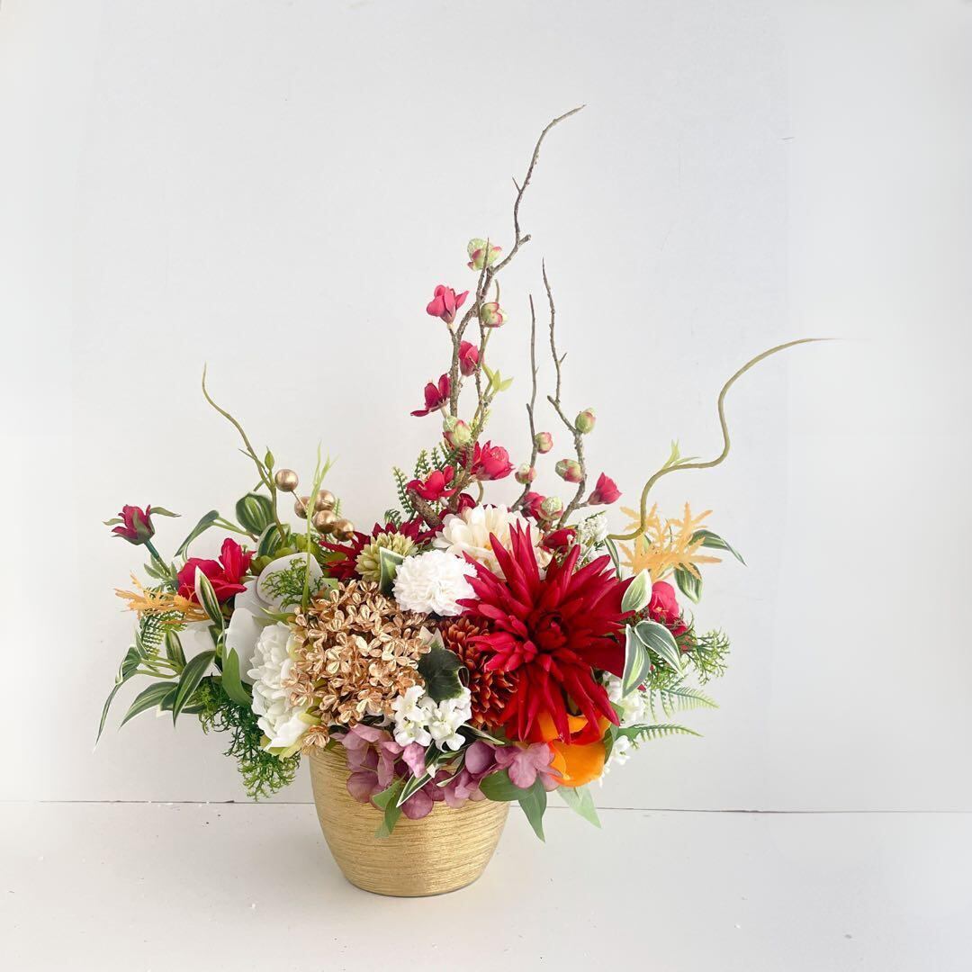 正月アレンジ|金彩ゴールド器に咲く華やぎの和花たち・通年飾れる光触媒フラワー