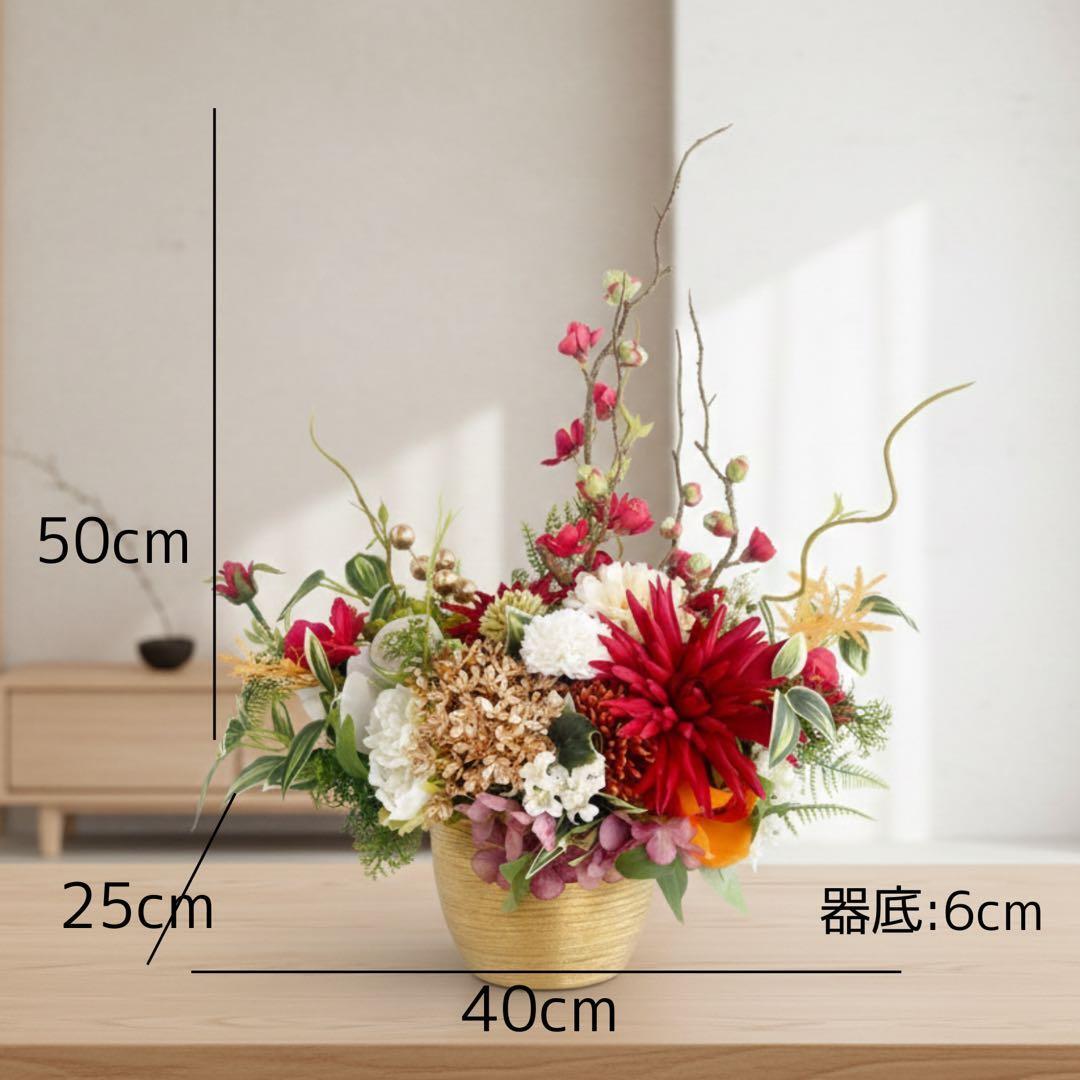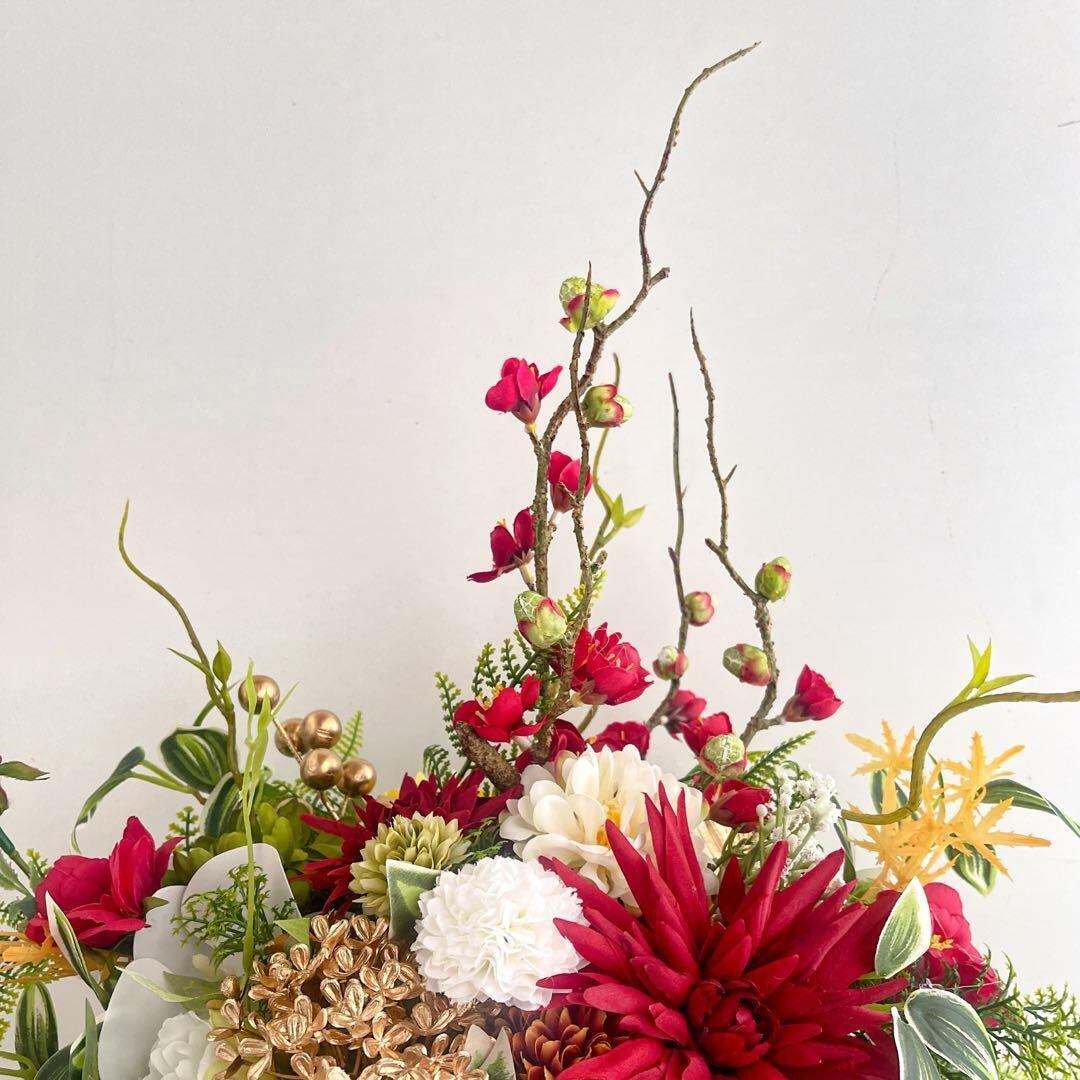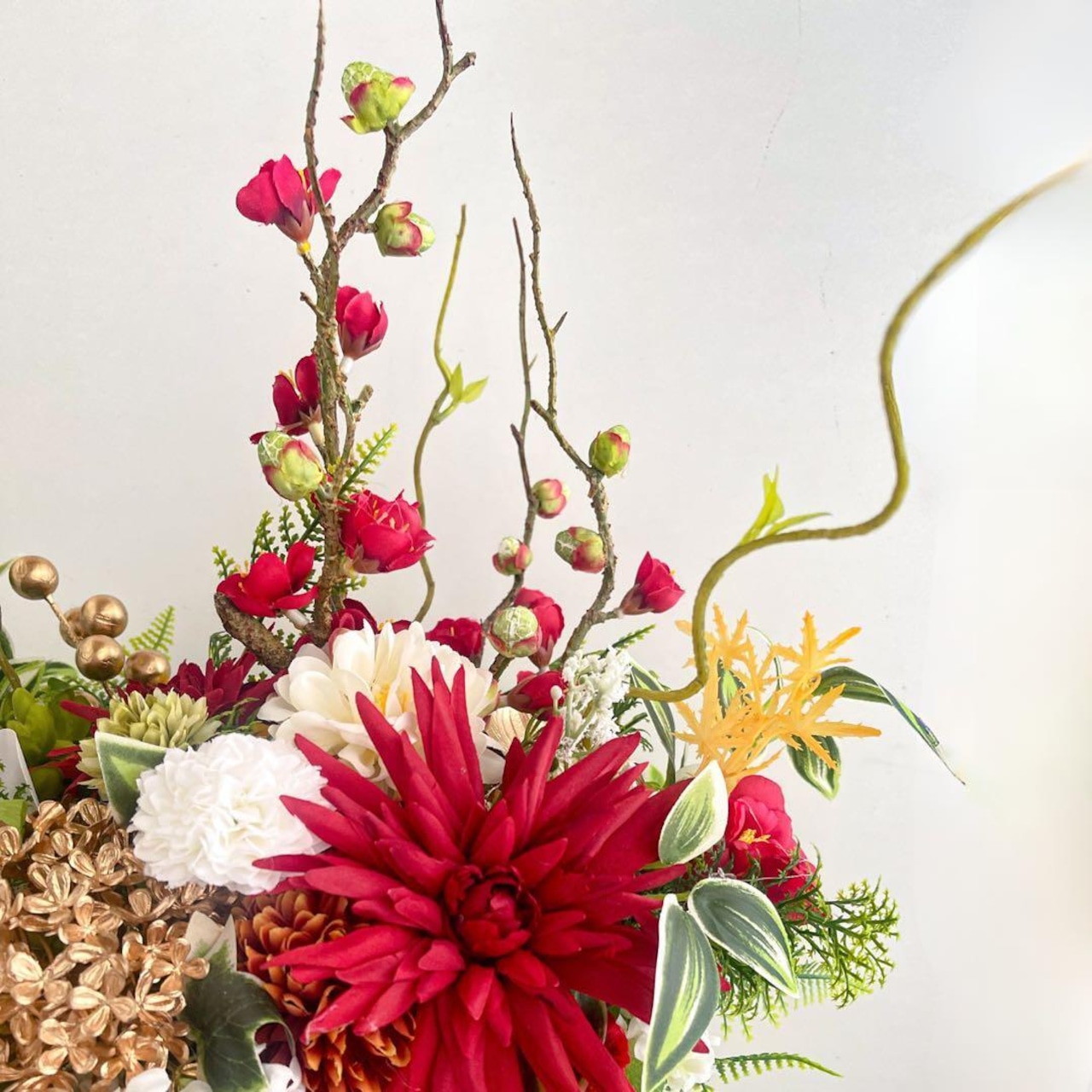正月アレンジ|金彩ゴールド器に咲く華やぎの和花たち・通年飾れる光触媒フラワー