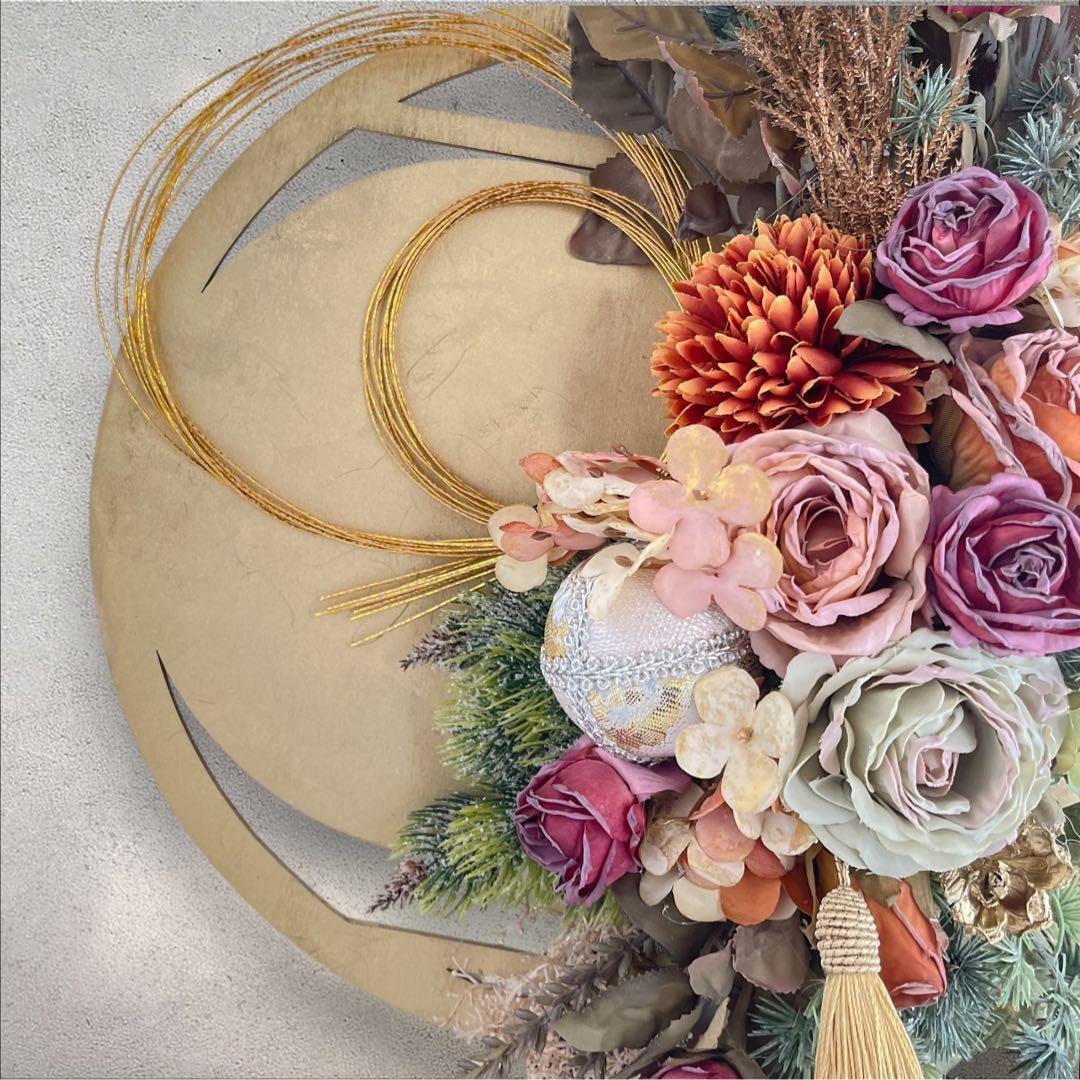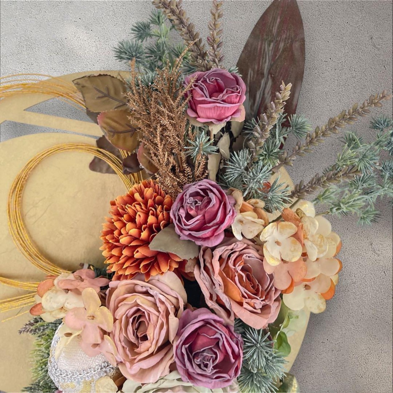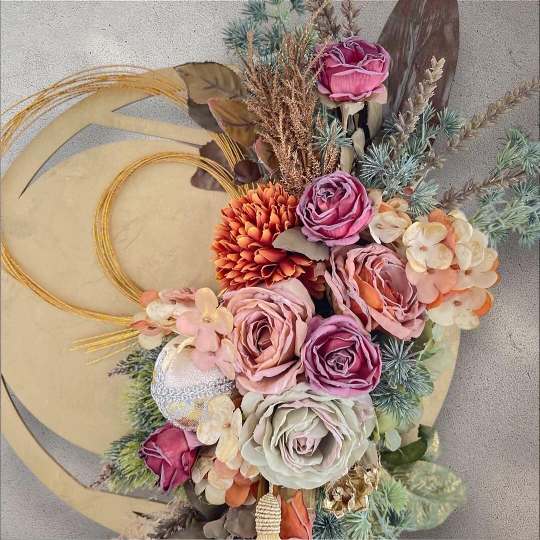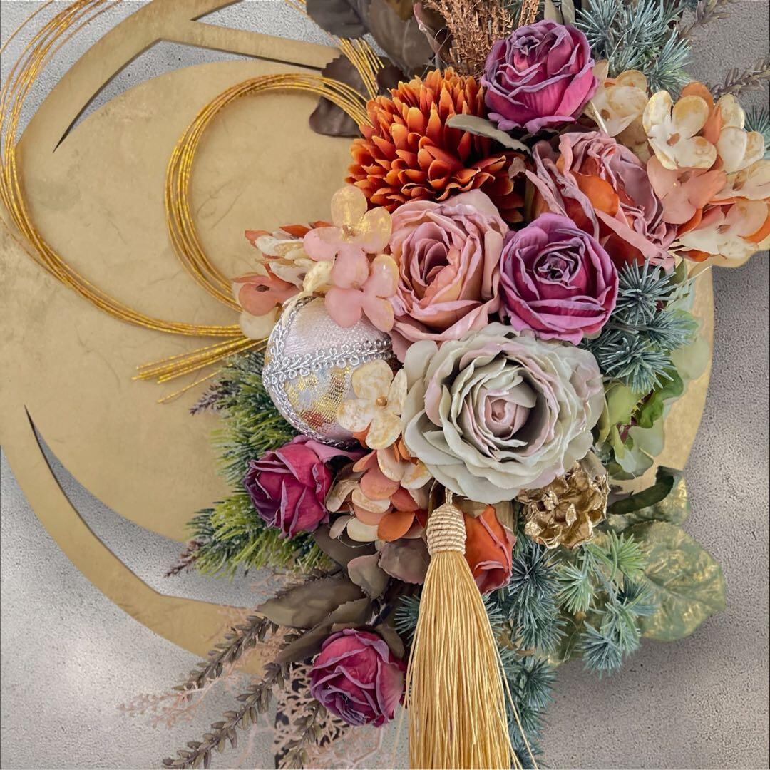 くすみ感のある高品質なローズを贅沢にあしらい、マム、松をベースに、ゴールドの木の実や水引をあしらい、伝統的なしめ縄にモダンで洗練された表情を添えました。