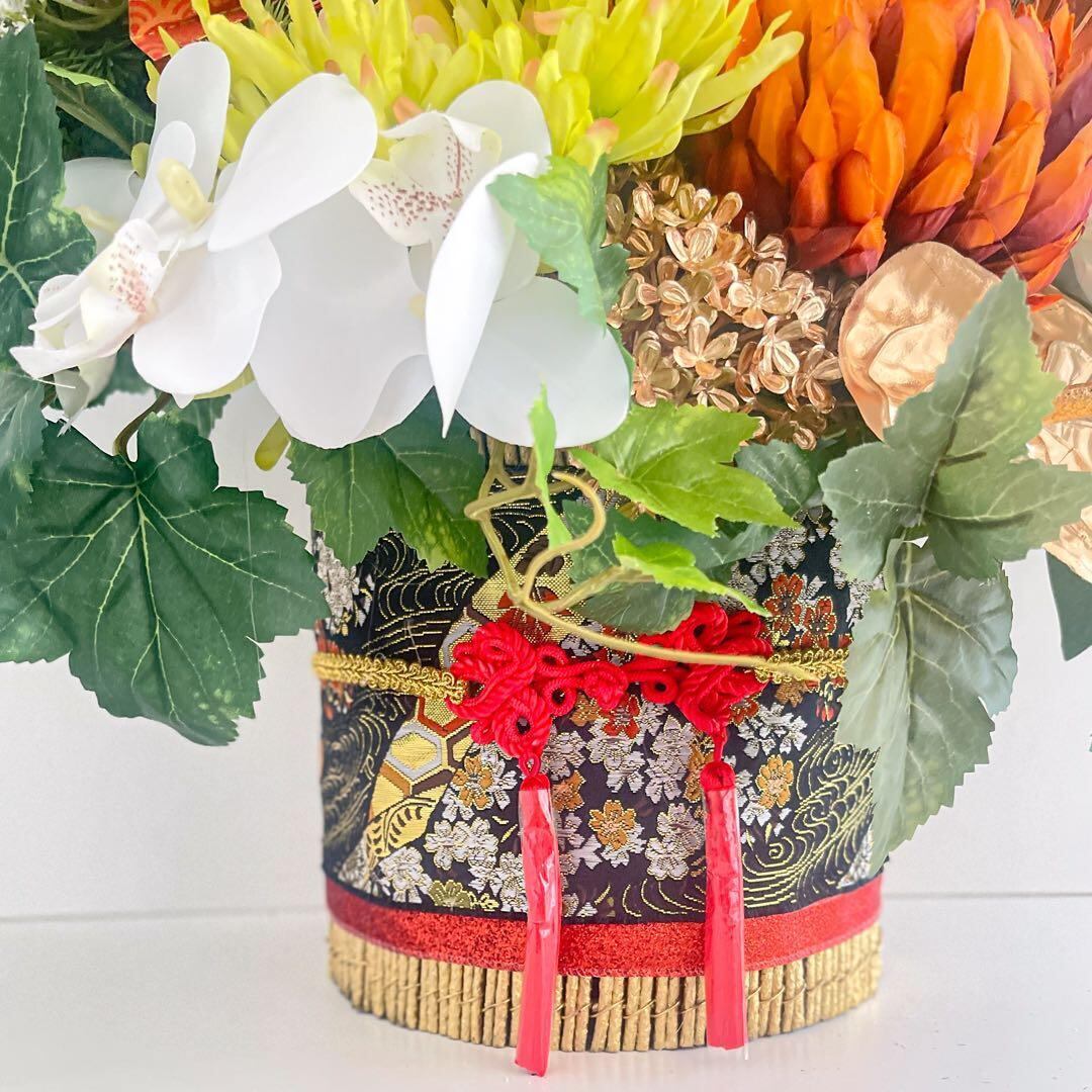 和柄の帯が施された重厚感のある花器が全体を引き締め、ご自宅の床の間や玄関はもちろん、店舗・オフィス・施設・式典会場・マンションエントランスなど、
