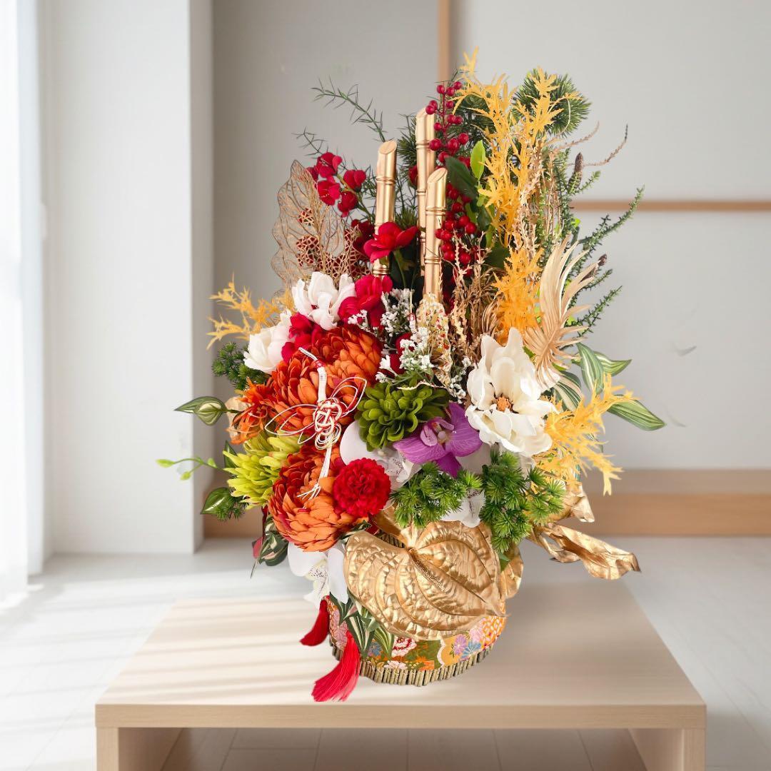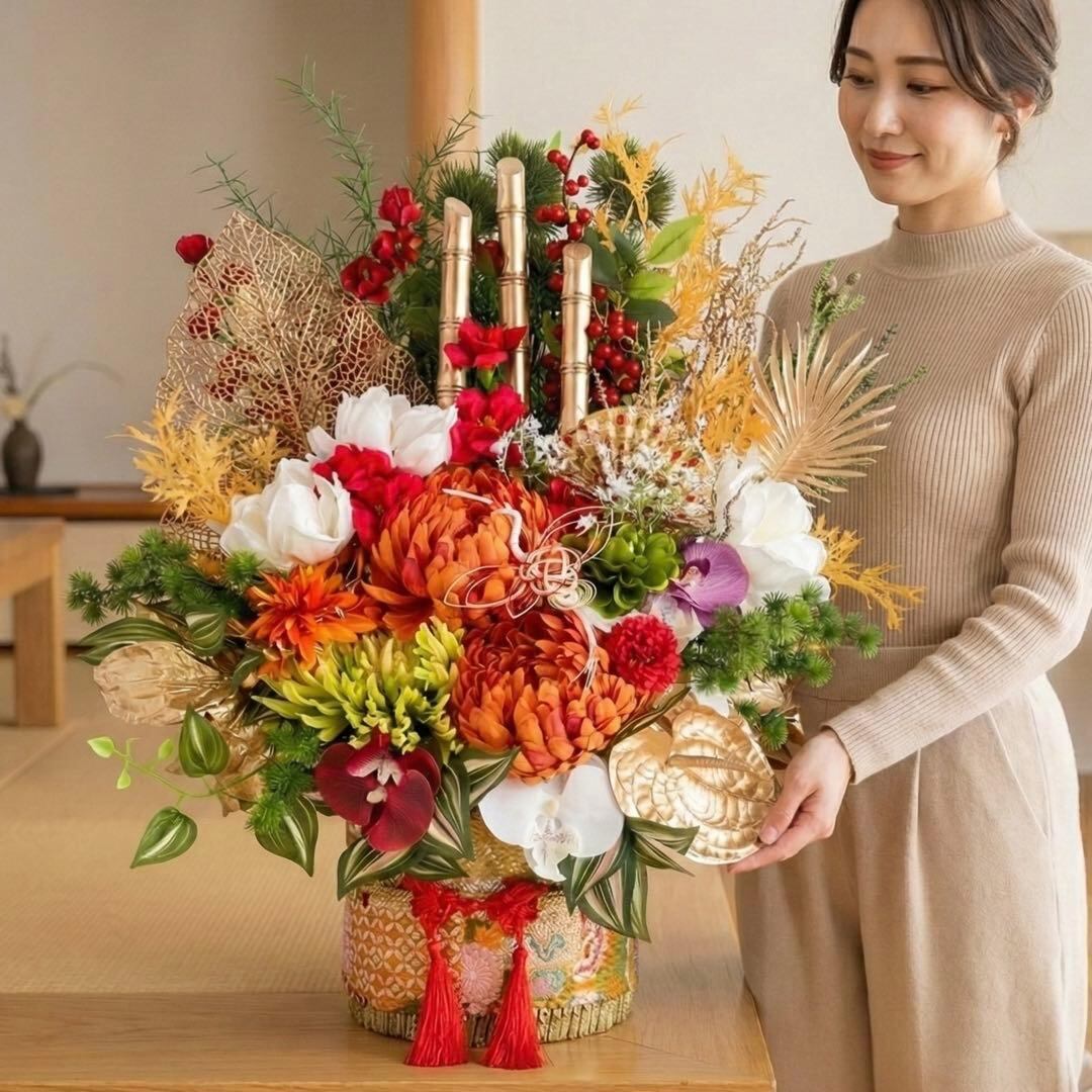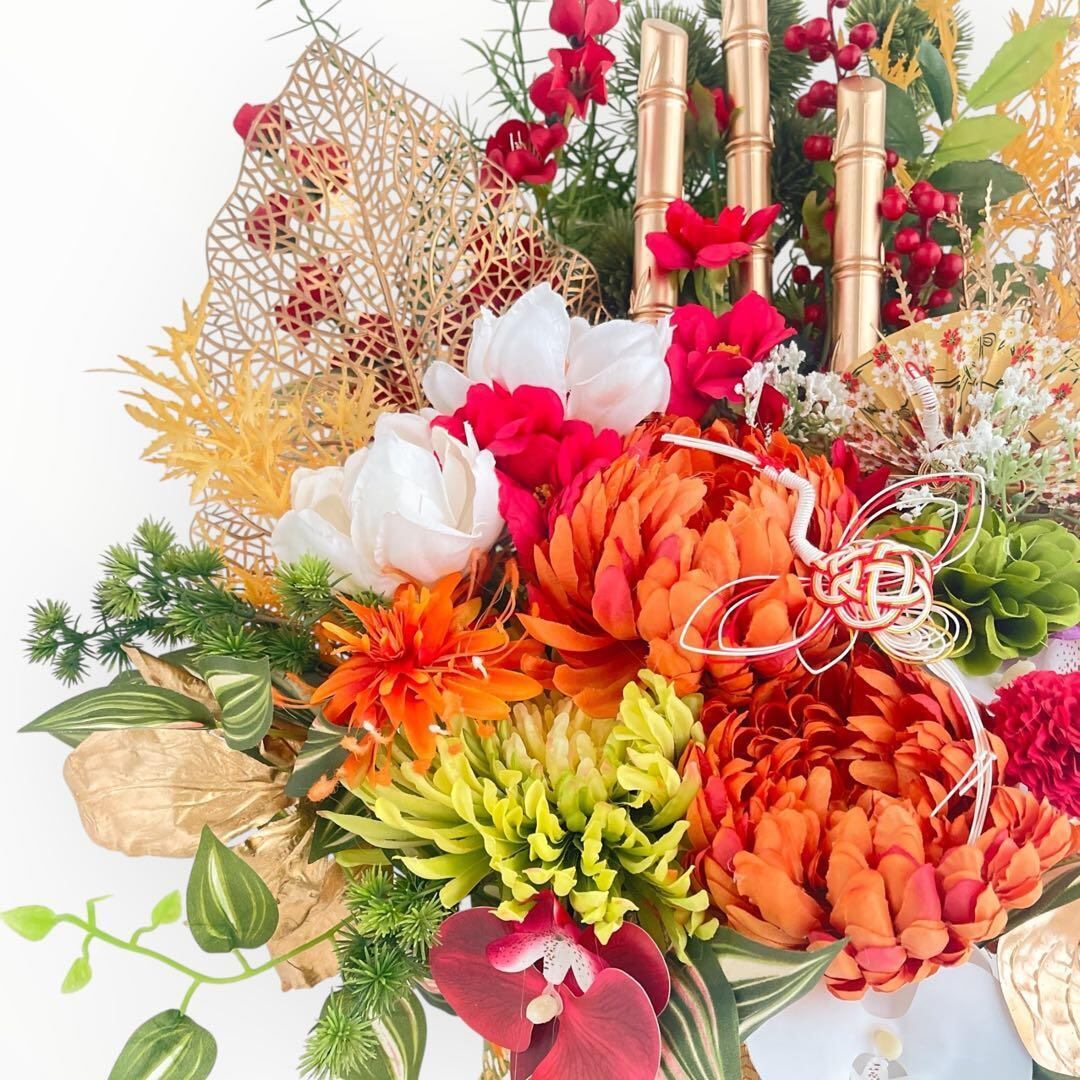主役には、ふっくらとした立体感が美しい大輪のマムを中心に、胡蝶蘭、木蓮、ダリア、椿、竹飾りを重ね、赤・金・緑を基調とした華やかな配色で、**「迎春」「繁栄」「長寿」**の意味を込めています。