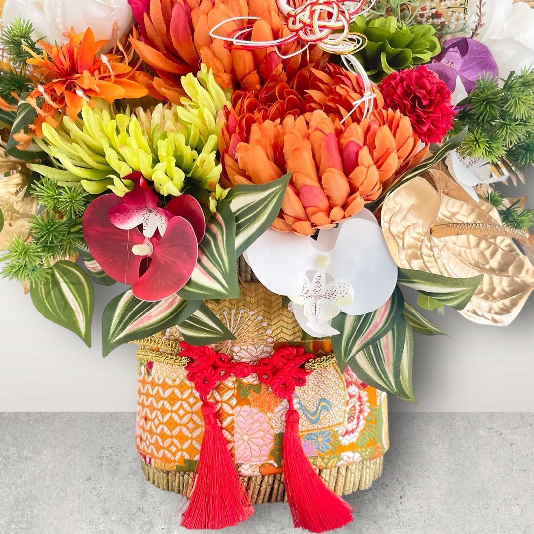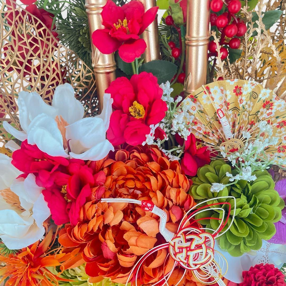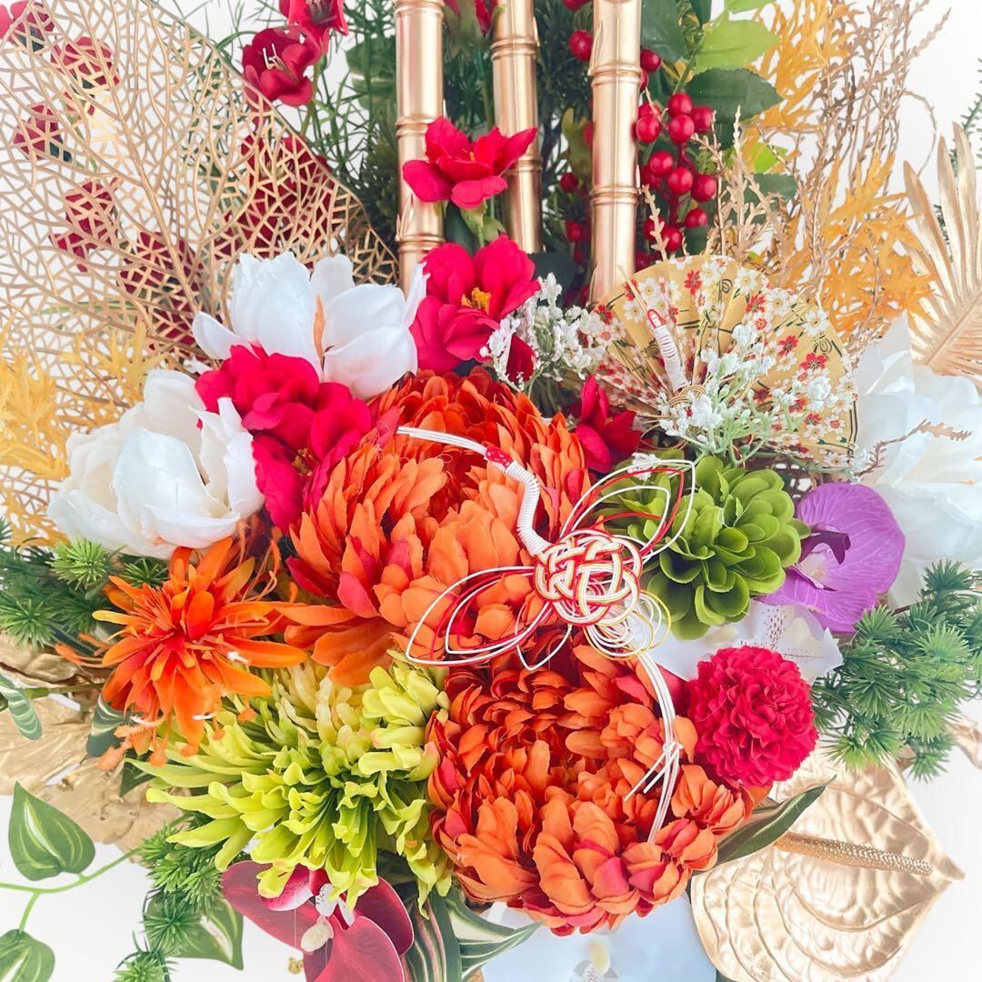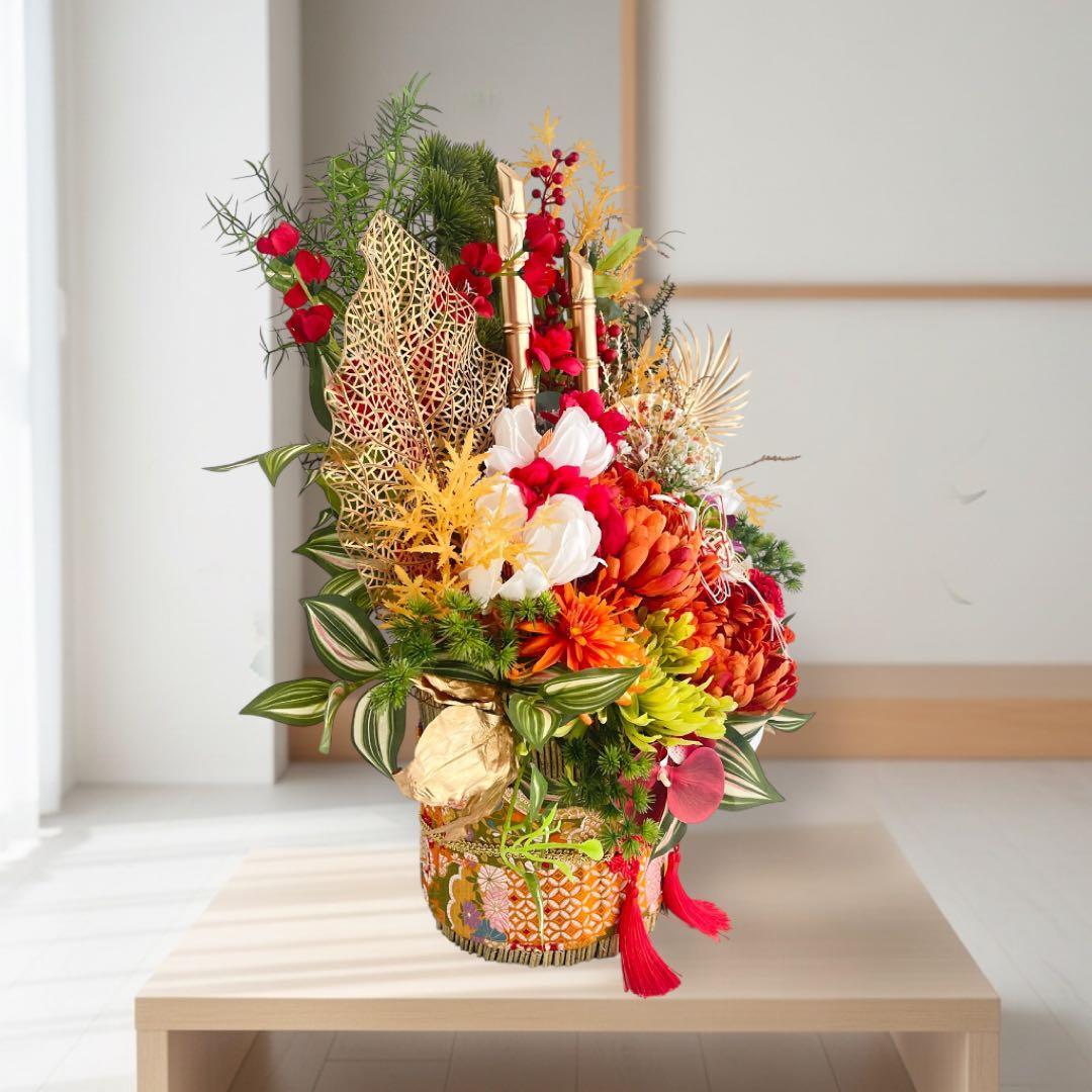 主役には、ふっくらとした立体感が美しい大輪のマムを中心に、胡蝶蘭、木蓮、ダリア、椿、竹飾りを重ね、赤・金・緑を基調とした華やかな配色で、**「迎春」「繁栄」「長寿」**の意味を込めています。