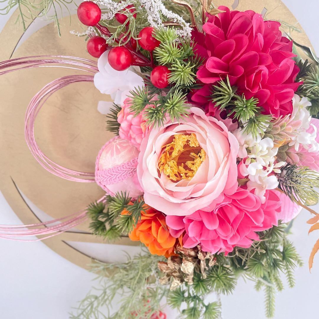 ゴールドベースの土台の凛とした佇まいに、アーティフィシャルフラワーを繊細に重ね、和の上品さと優雅なボリュームを両立。