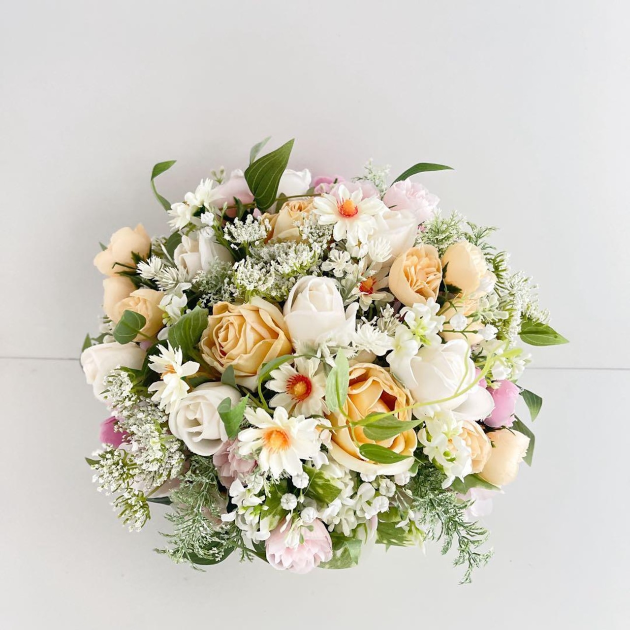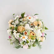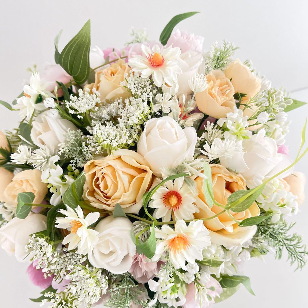 ころんと可愛らしい蕾ローズを添え、カスミソウとレースフラワーをふんわり散らしながら、デイジーをリズムよく遊ばせたドーム型の愛らしいデザインに仕上げました。