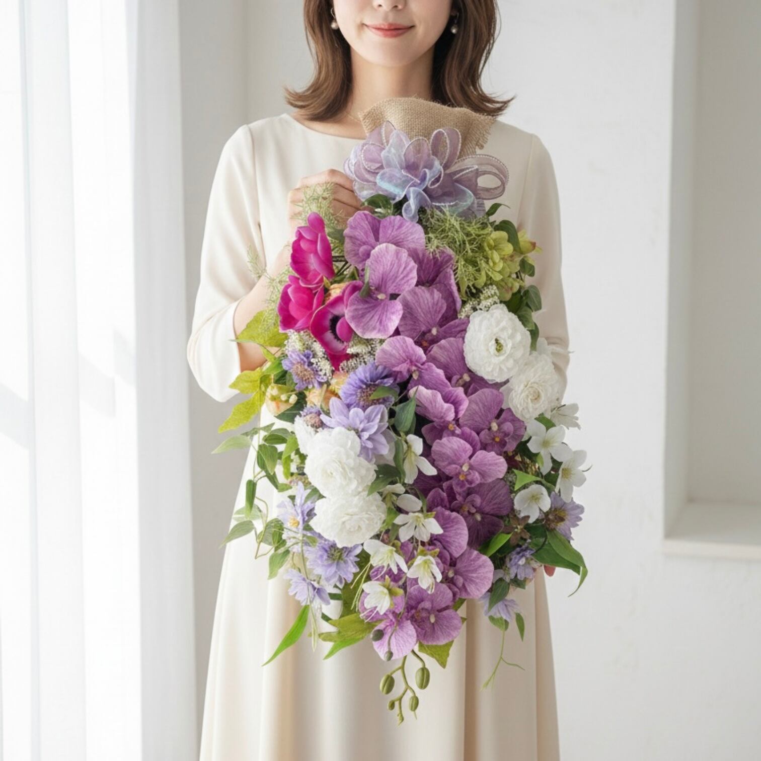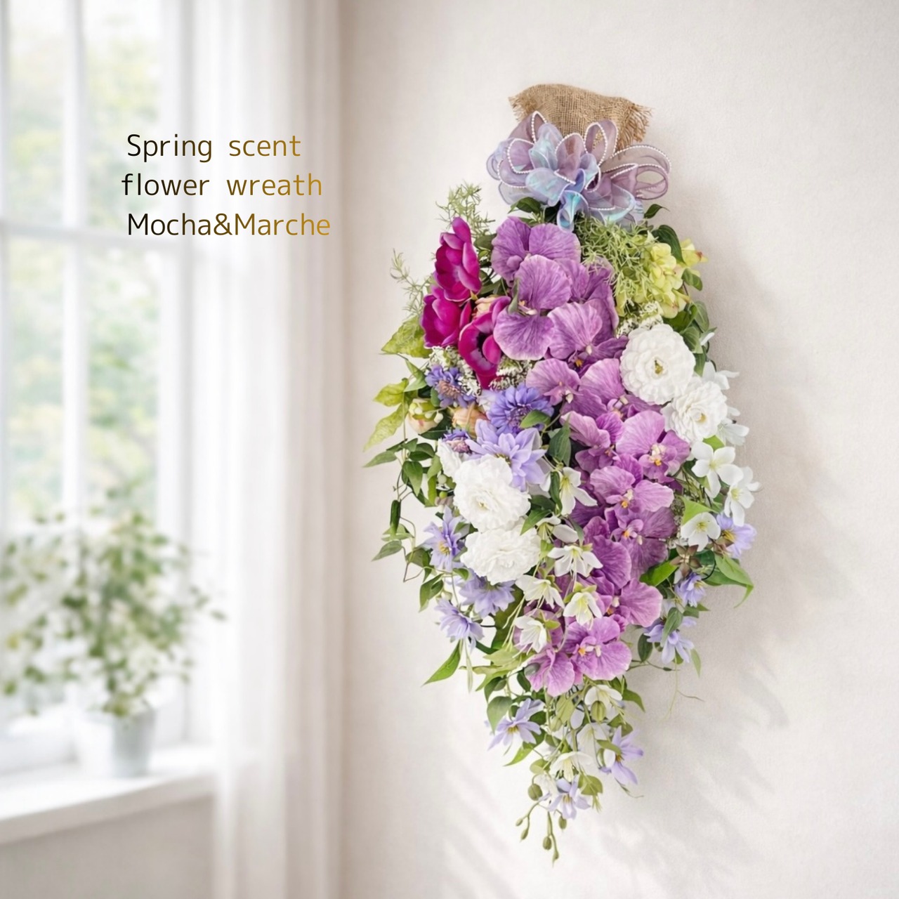 花束のように想いを包み、長く楽しめるフラワースワッグです。