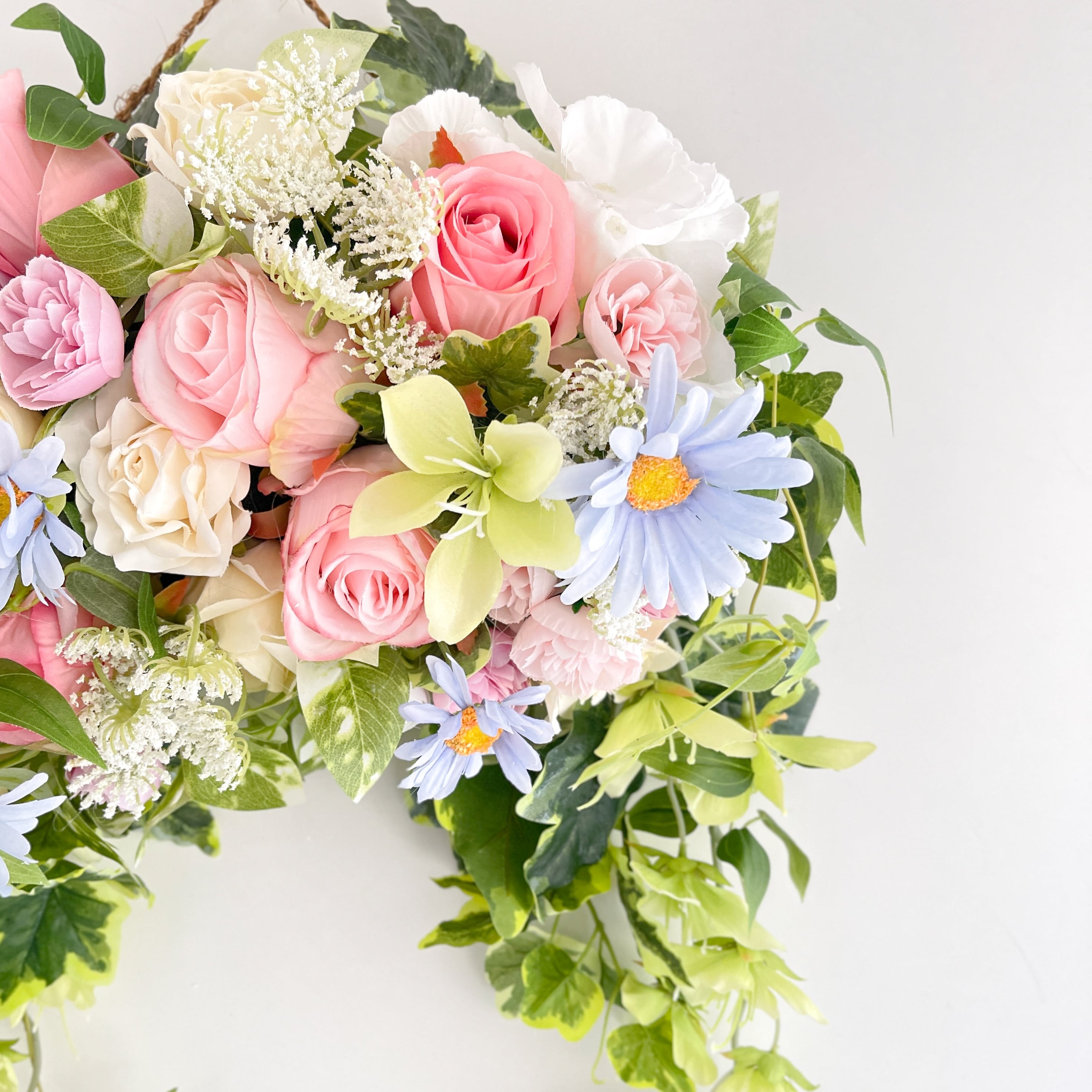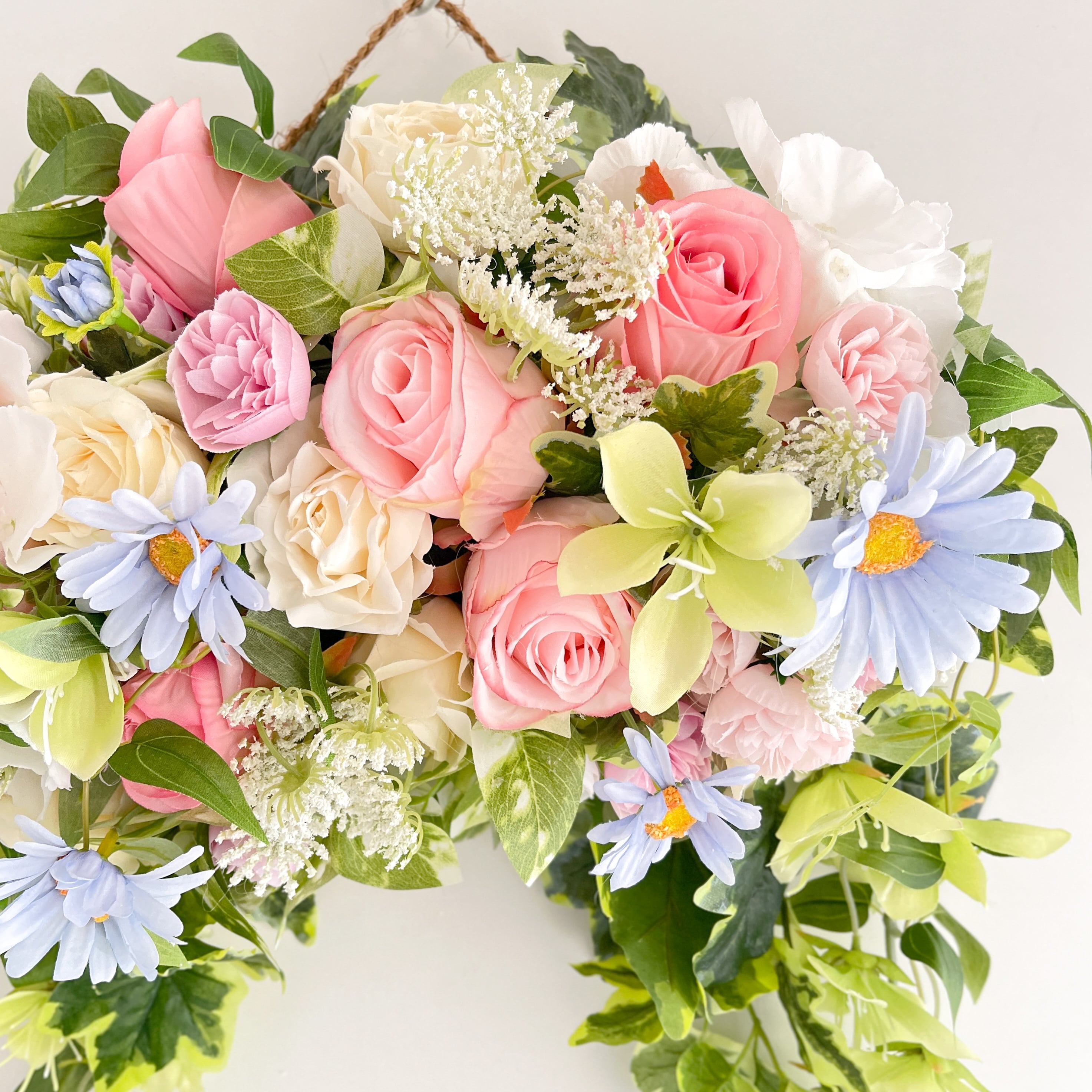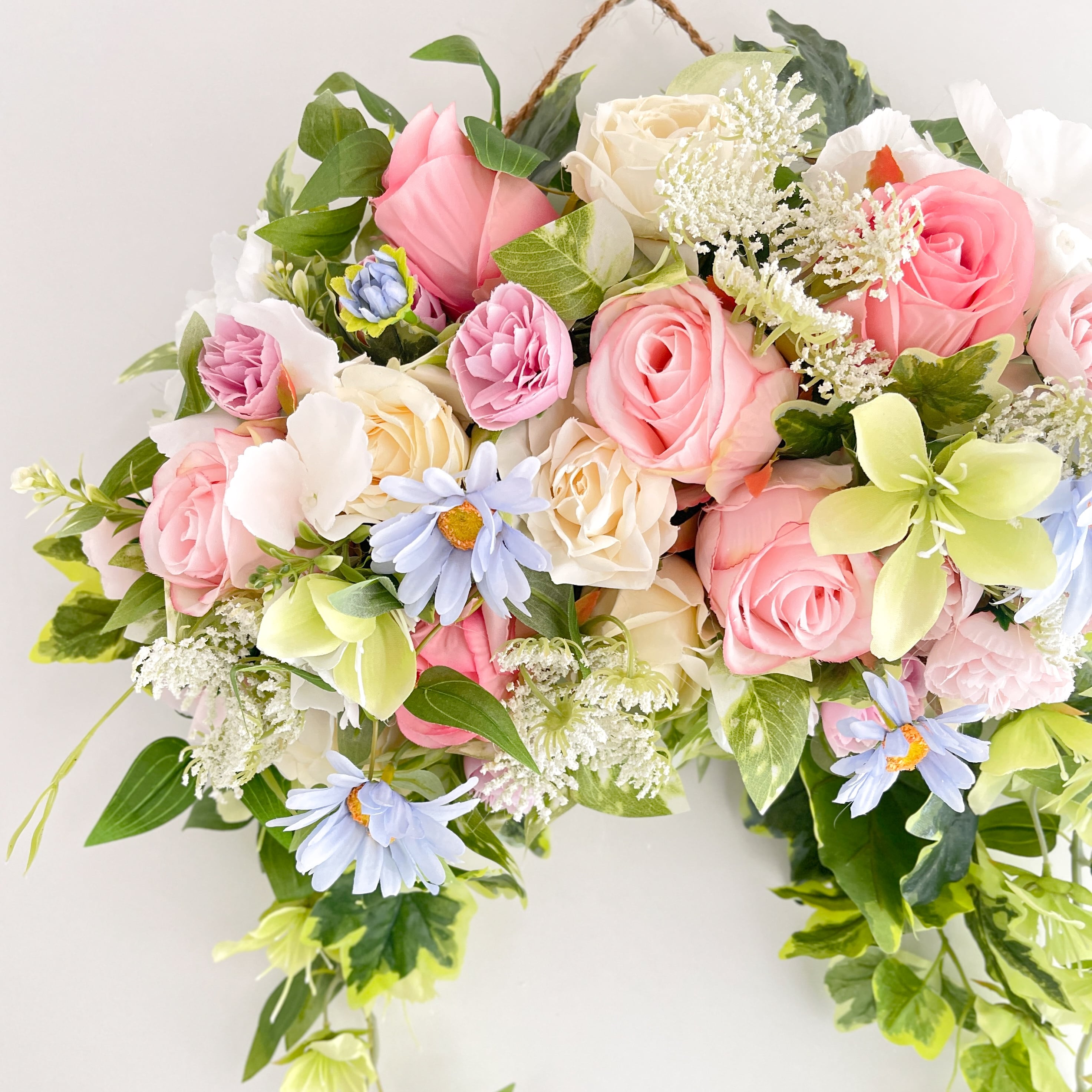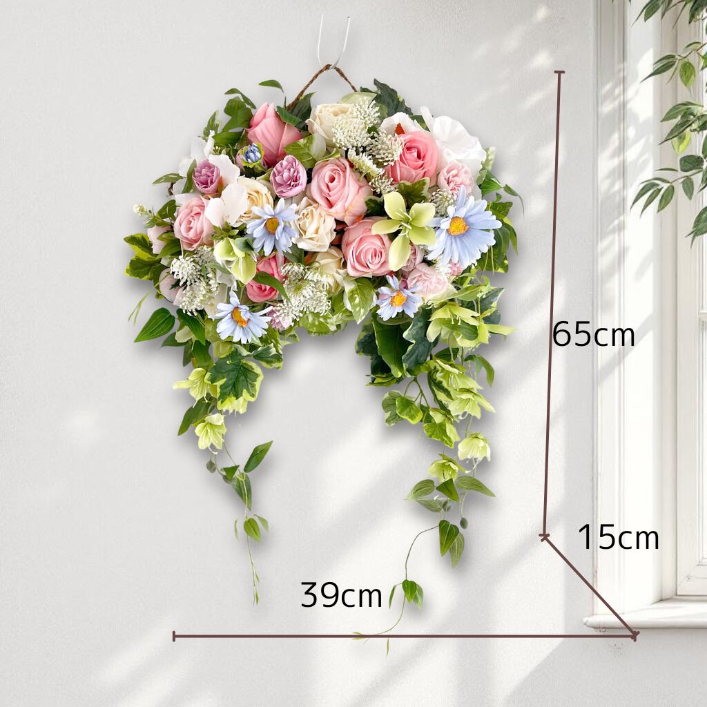 こちらは、高さ約65cmの存在感あるサイズで仕立てた春色のフラワーリースです。