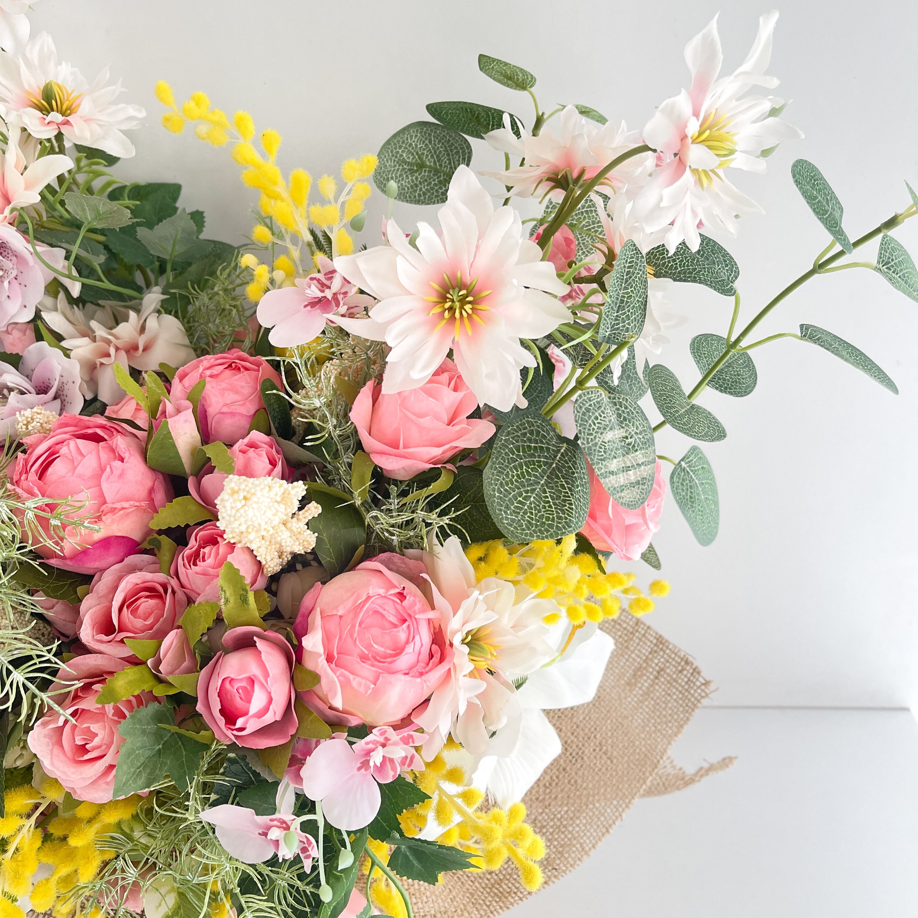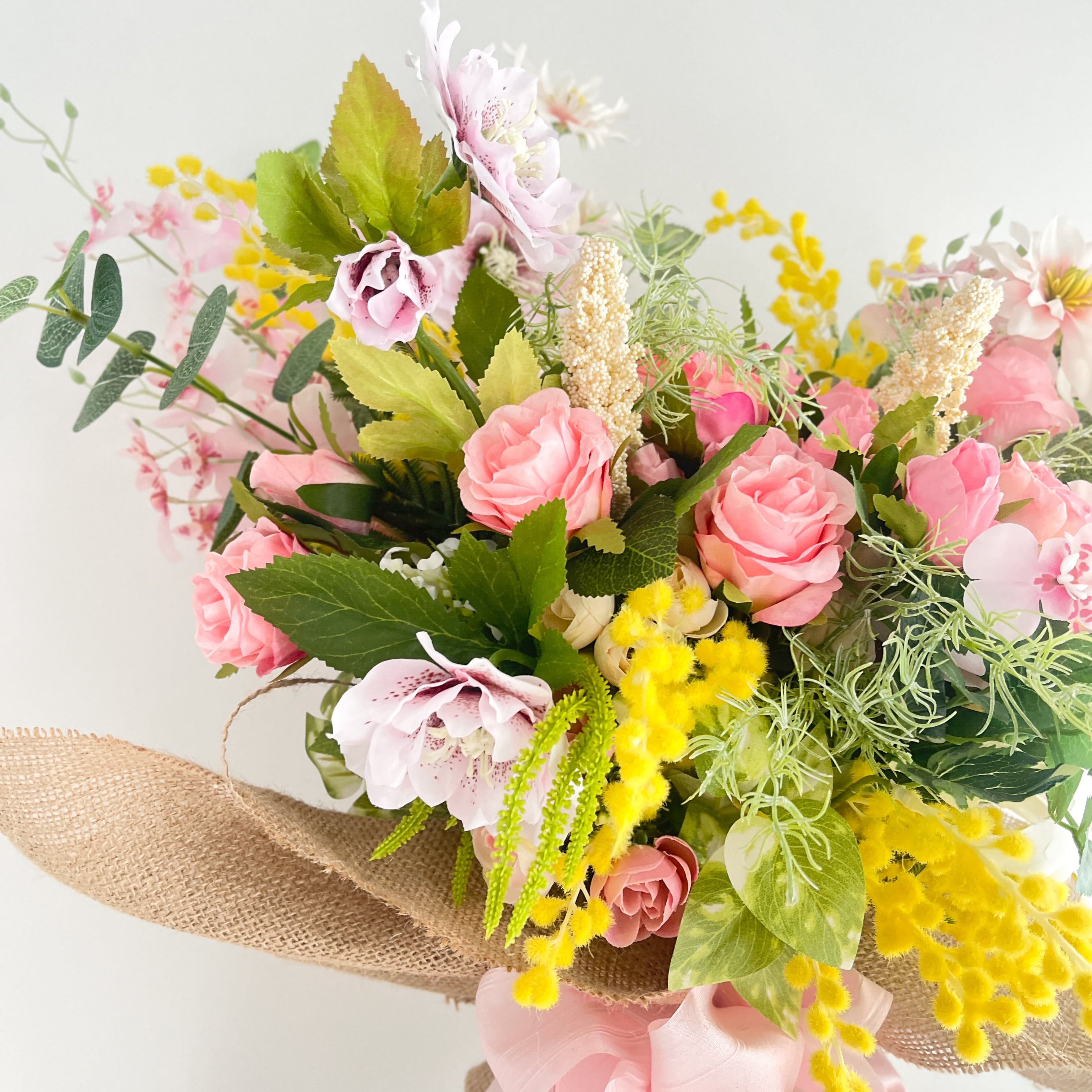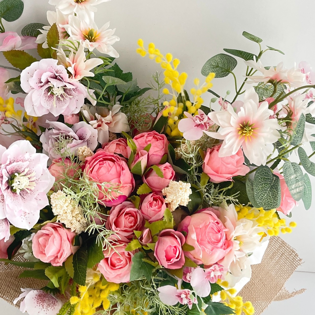 光触媒フラワー 春を束ねた飾る花束ブーケ|ミモザ・クリスマスローズ・アーティフィシャルフラワー クラッチブーケ