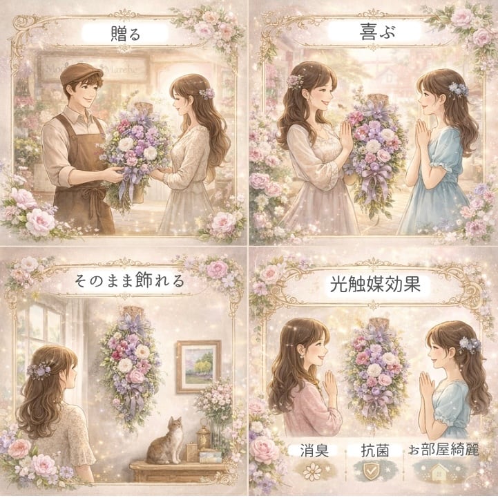 安定感のあるデザインのため、お受け取り後はラッピングを外すだけで、そのままテーブルや棚、玄関などに飾っていただけます。