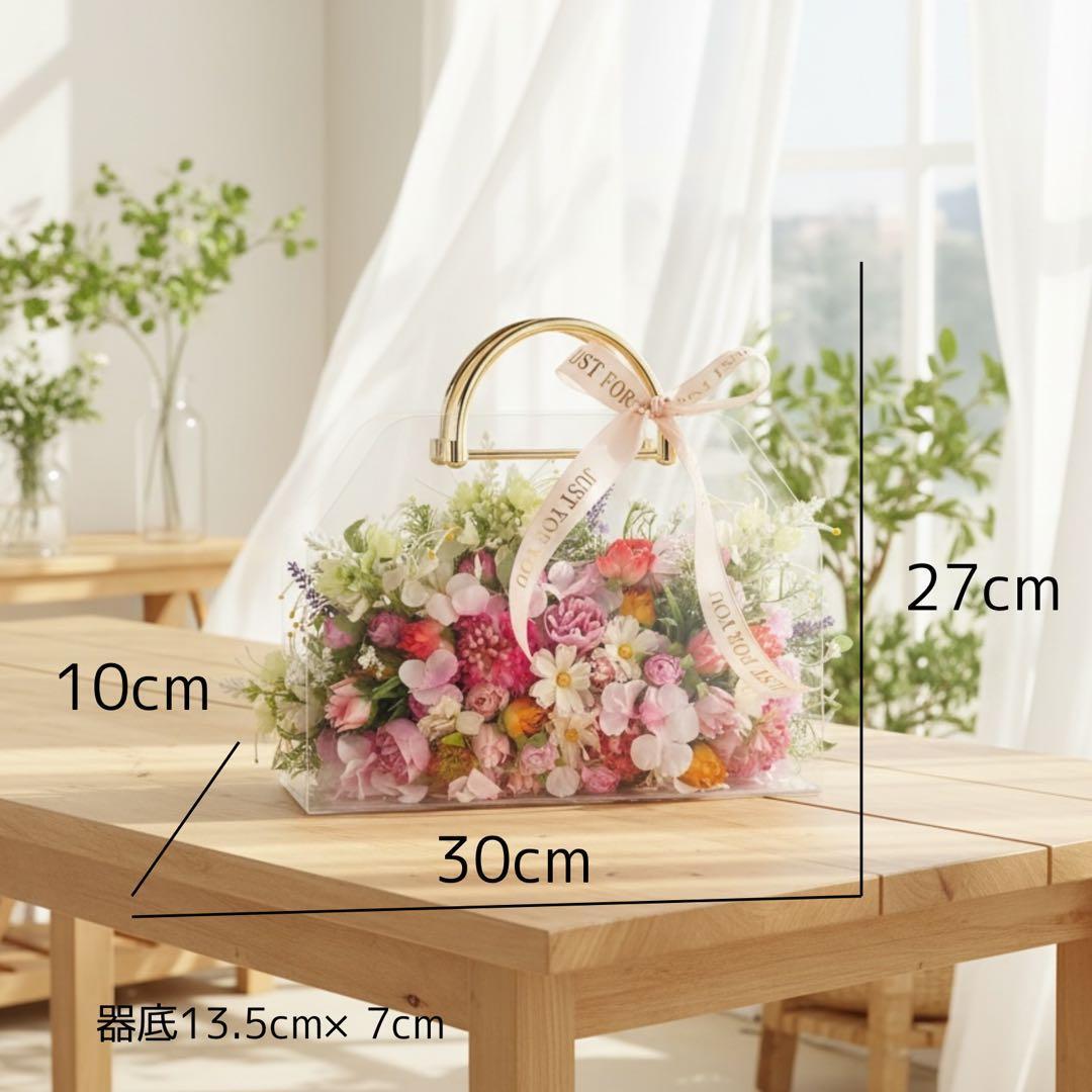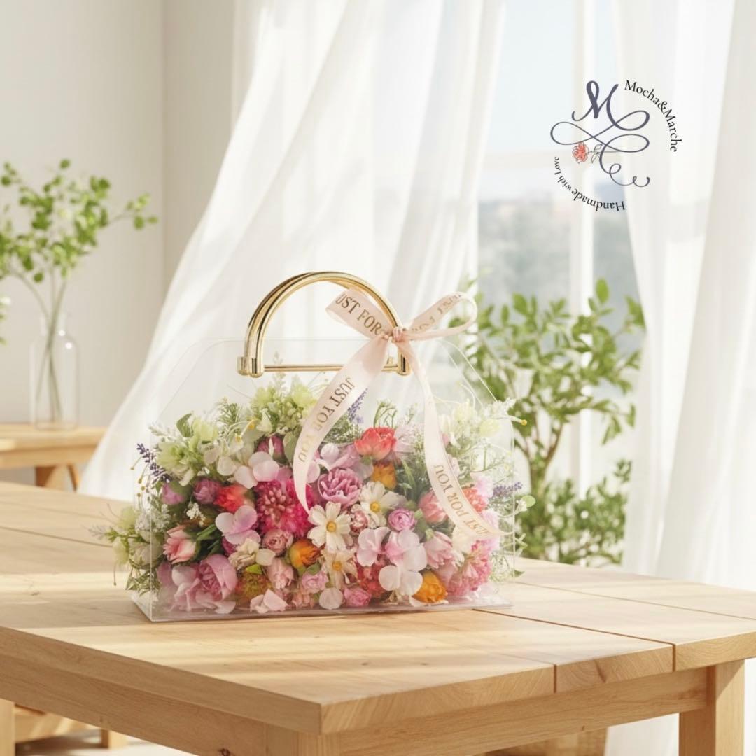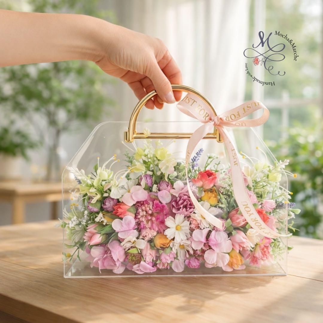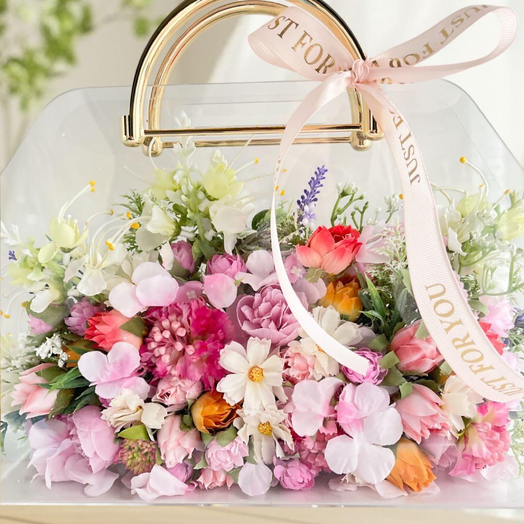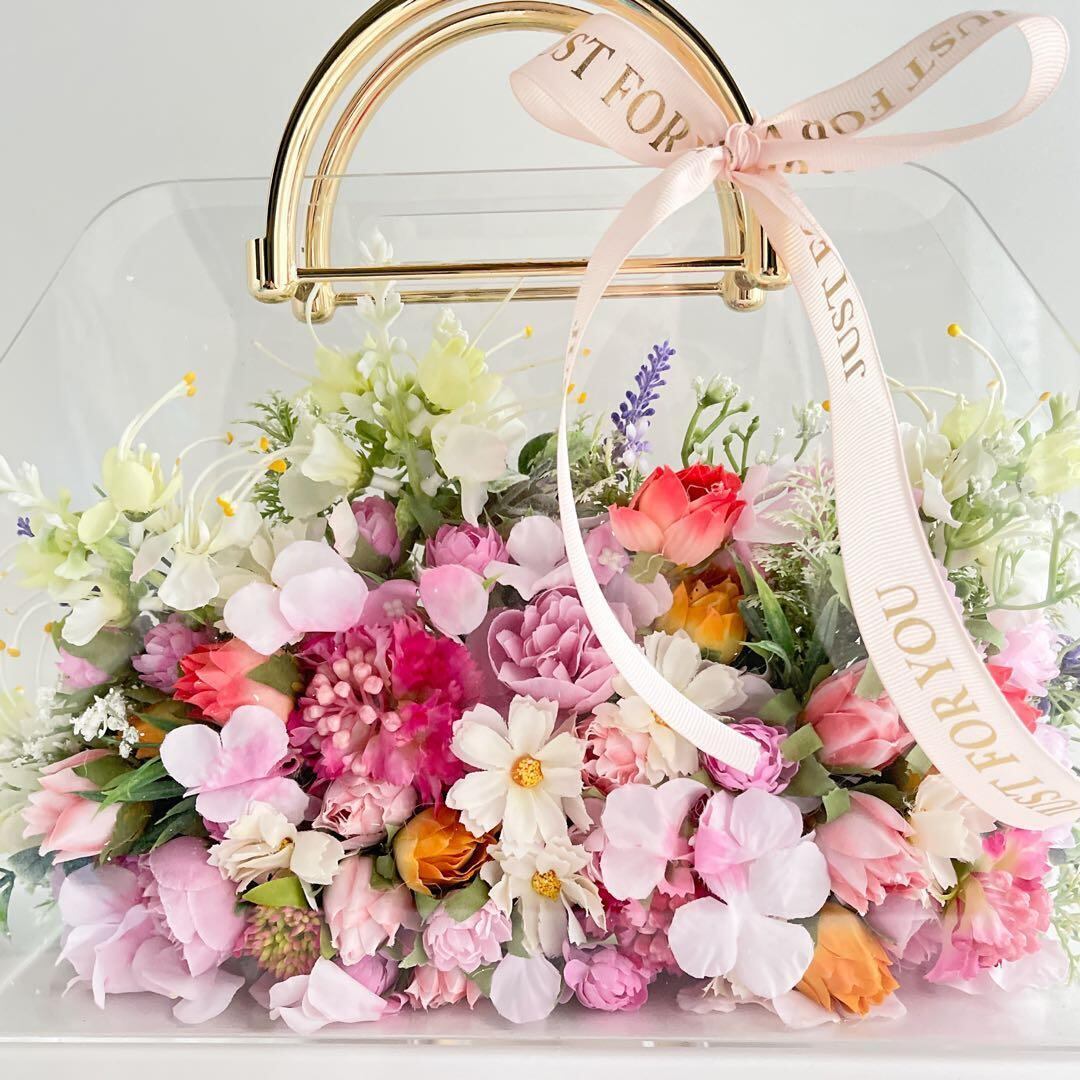 花を持ち歩くように贈る|春の小花が咲く 光触媒フラワーバッグ(アクリルバッグ) アーティフィシャルフラワー