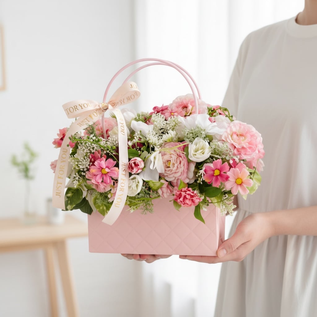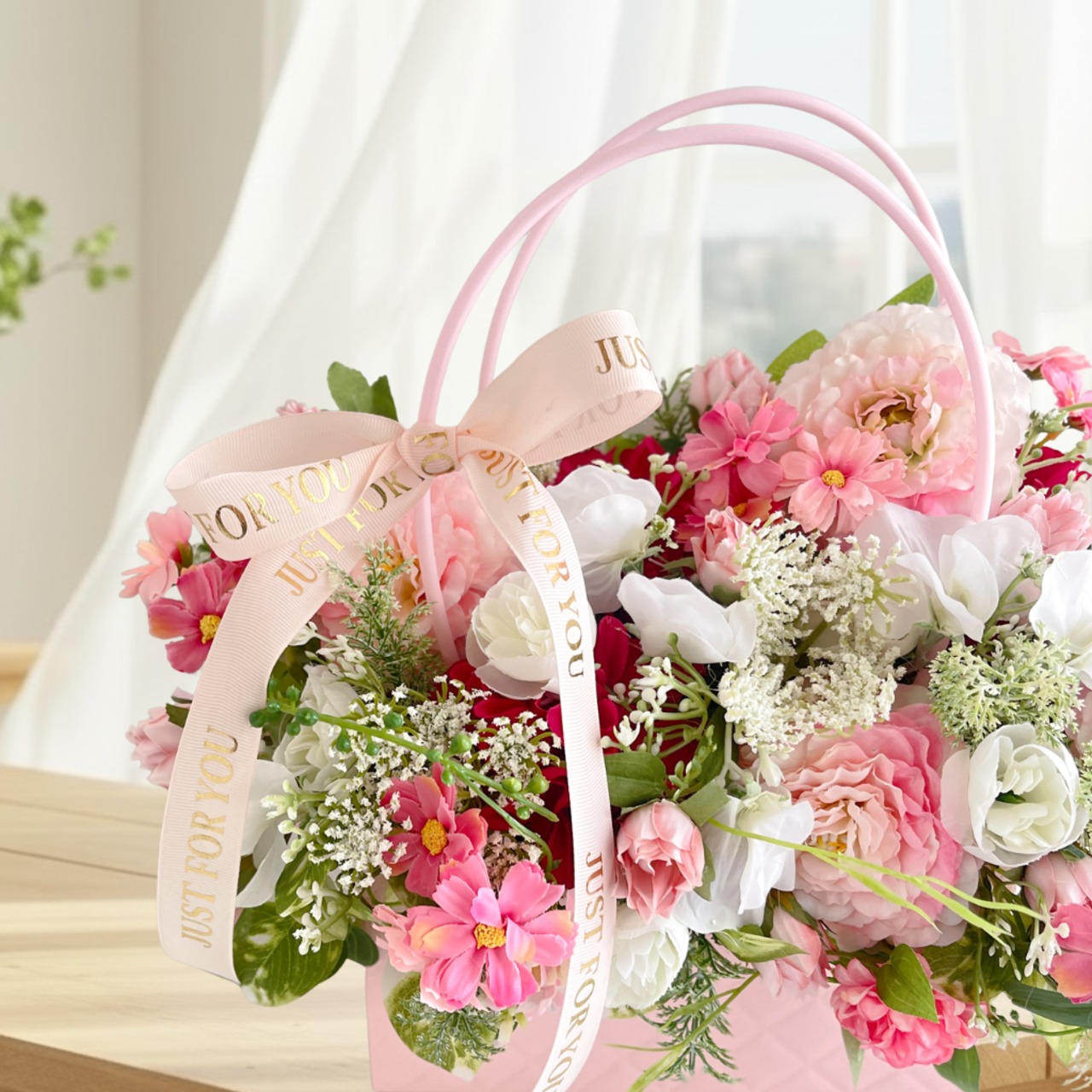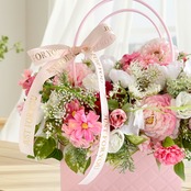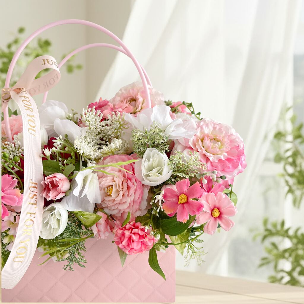 まるで本物のバッグのように持ち手がついた、人気のバッグ型フラワーアレンジメントです。