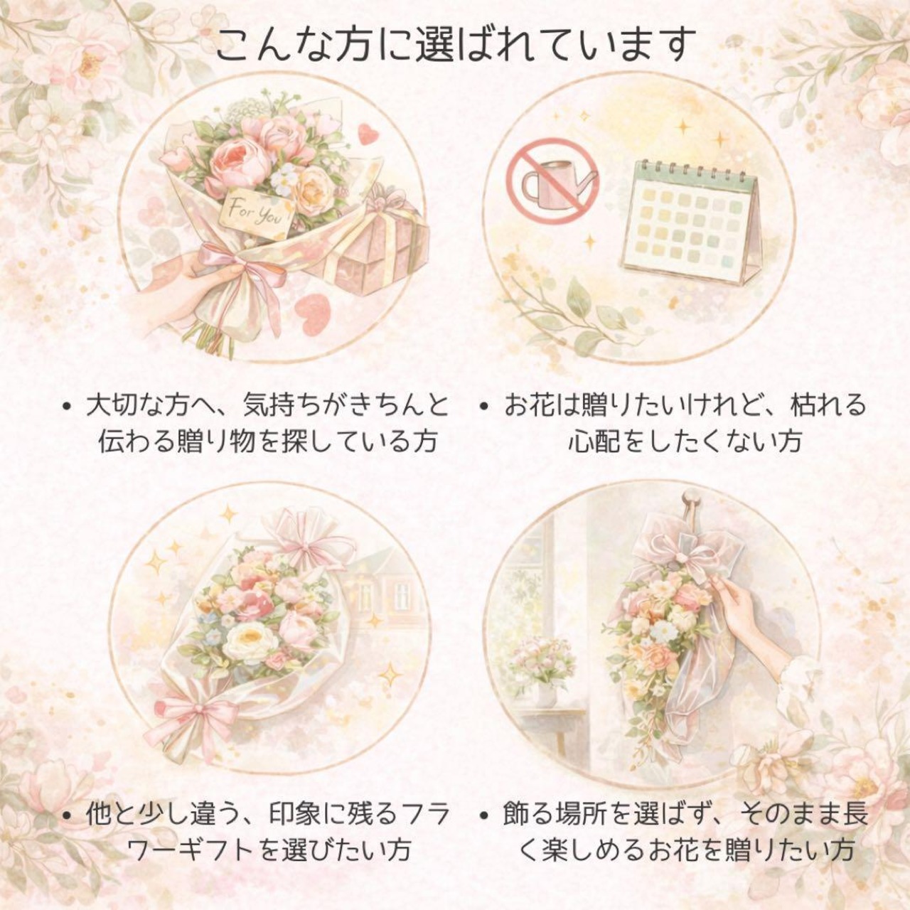 花粉や香りが気になる方にも安心して飾っていただける、枯れないフラワーギフトです。