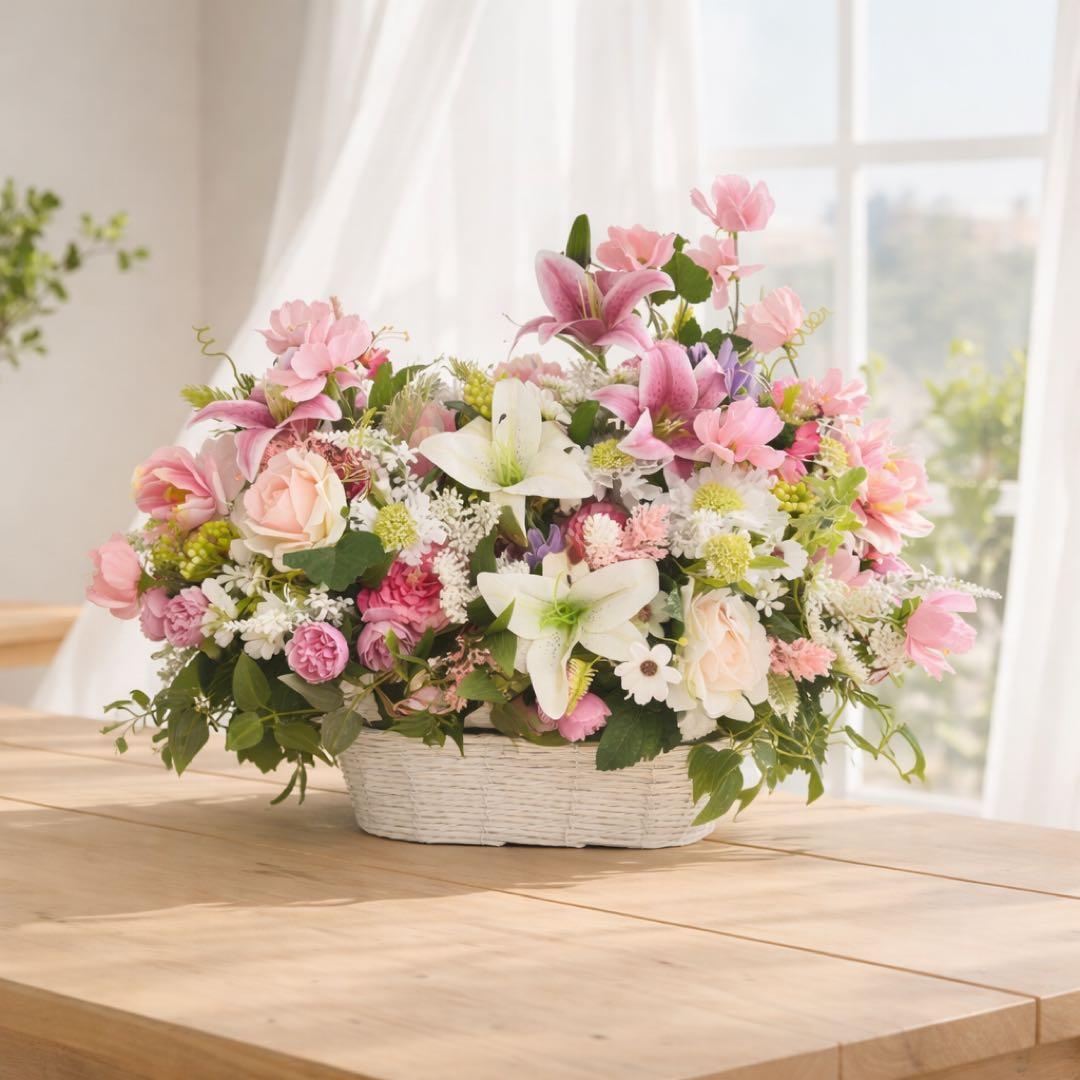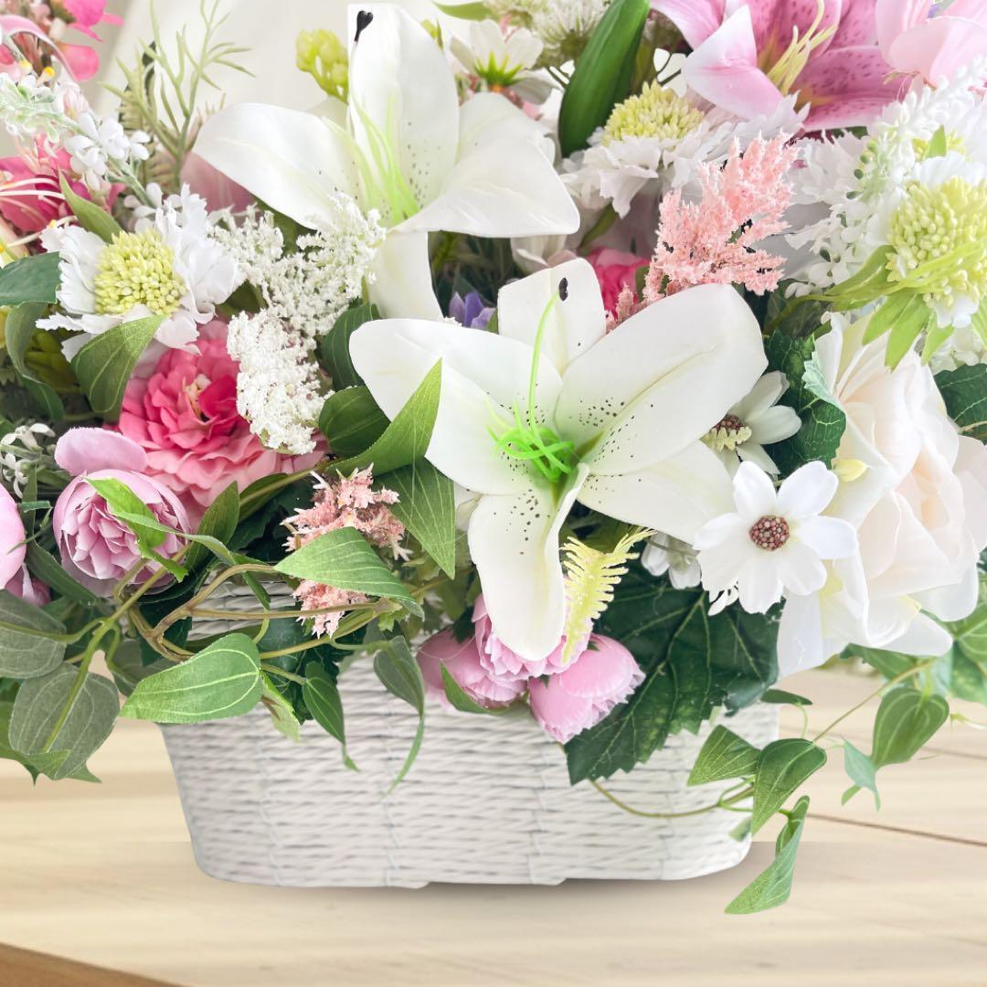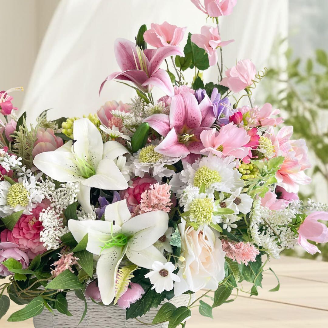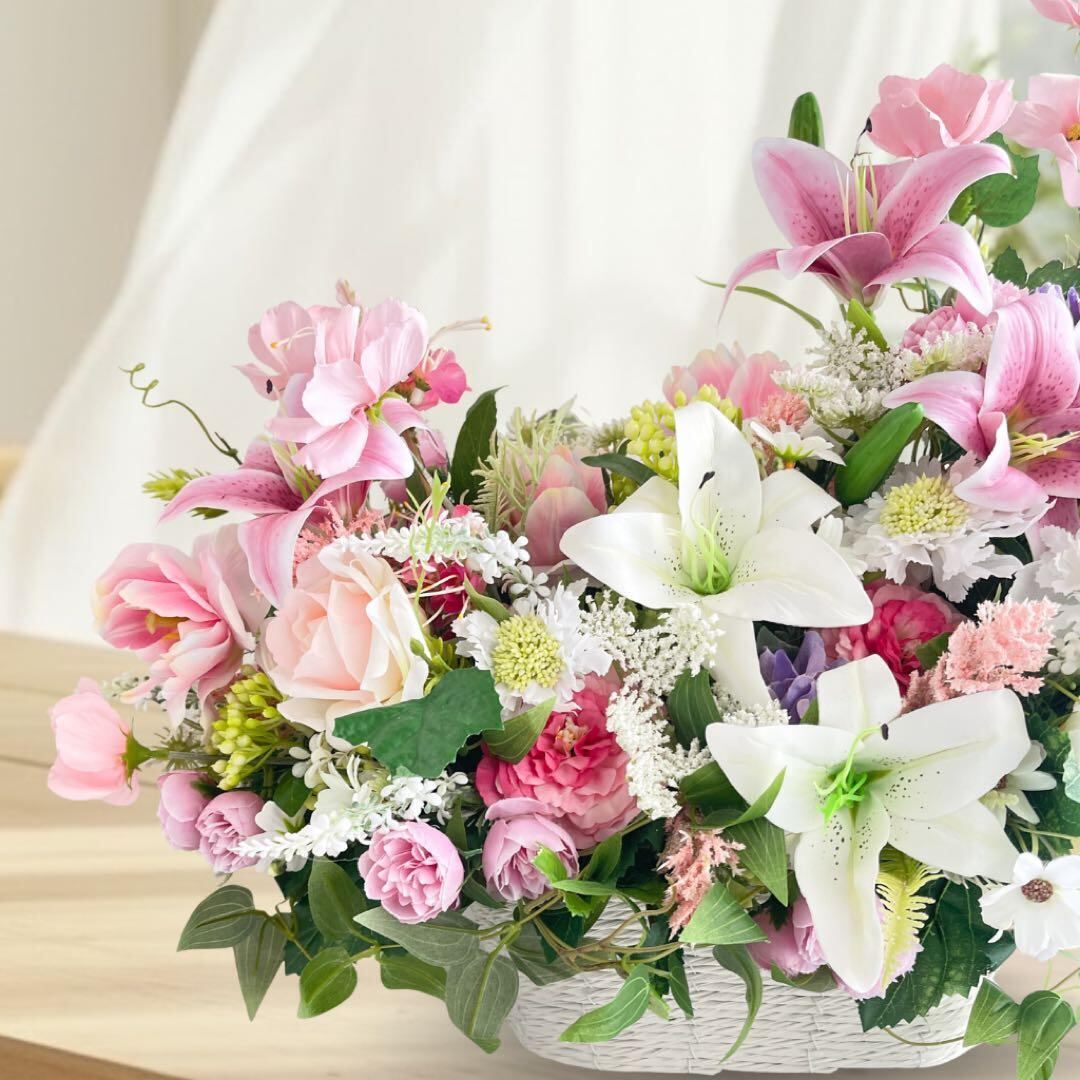 光触媒フラワー「至福の庭園」春のバスケット 百合とチューリップの豪華アレンジ 開店祝 新築祝 退職祝 アーティフィシャルフラワー