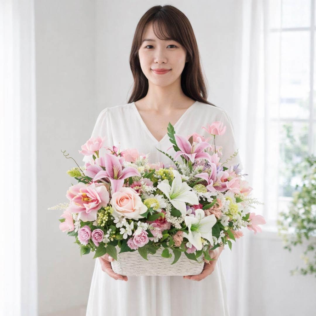 横幅約58cm、高さ約50cm。ホワイトの特大バスケットから溢れんばかりに仕立てられたその姿は、開店祝いや新築祝いのメインを飾るにふさわしい、格別な品格を放ちます。