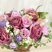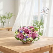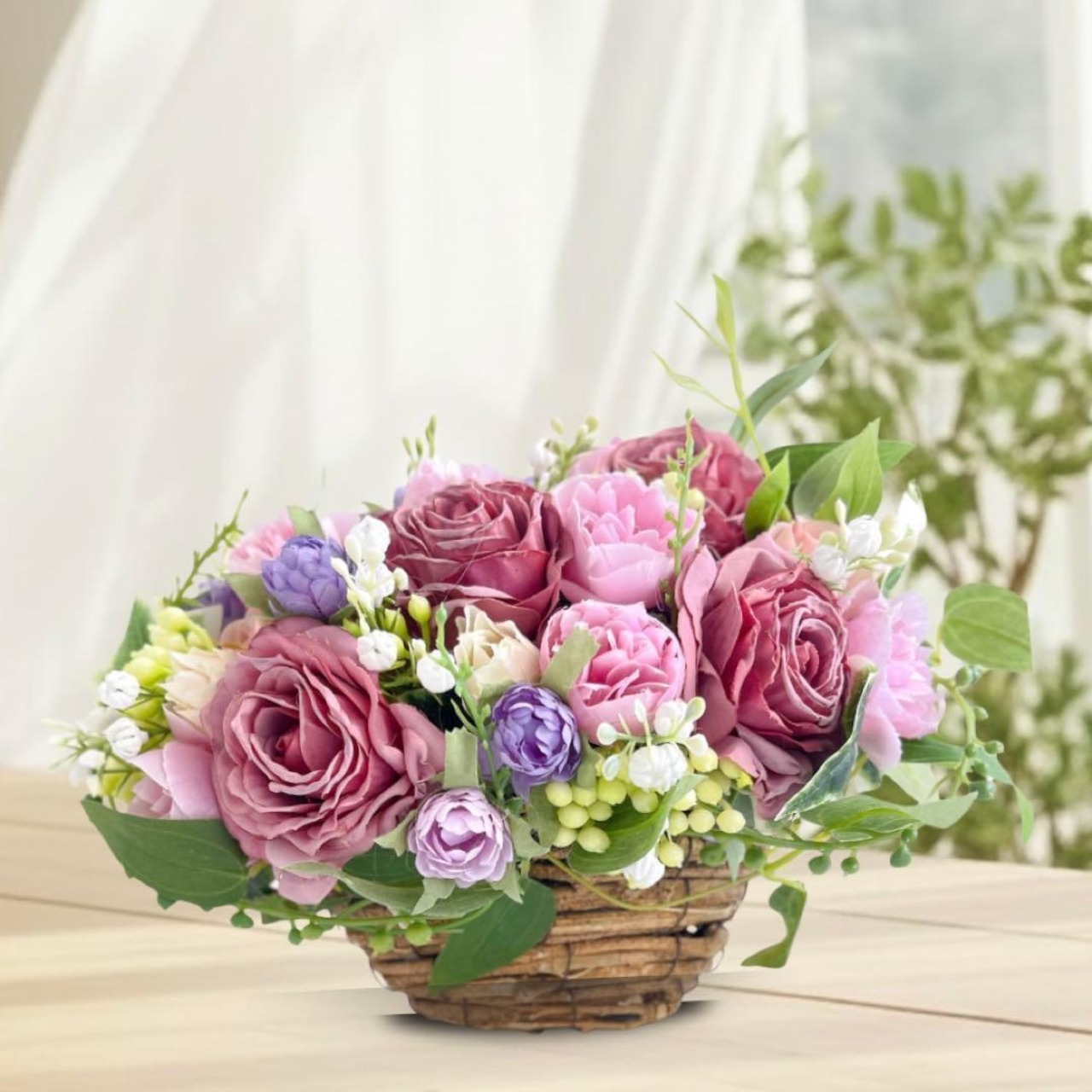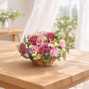 天然素材のバスケットから溢れ出すように、瑞々しい花々を詰め込んだコンパクトなアレンジメントです。