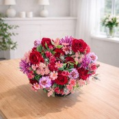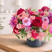 一際目を引く深紅のオールドローズを主役に、高貴な美しさの象徴である胡蝶蘭、そして幾重にも花びらを重ねた豪華なダリアを贅沢に配した、気品漂う特大アレンジメントです。