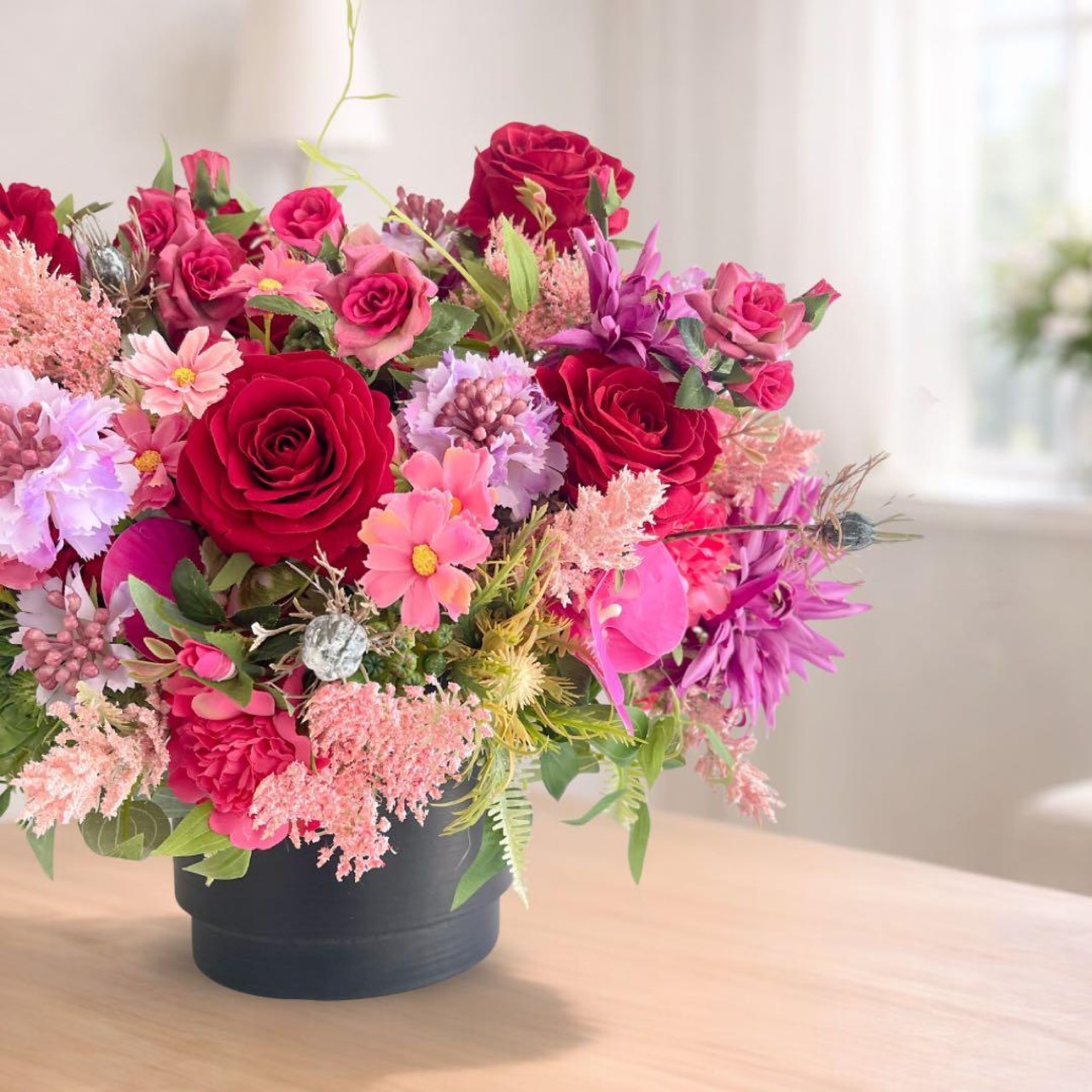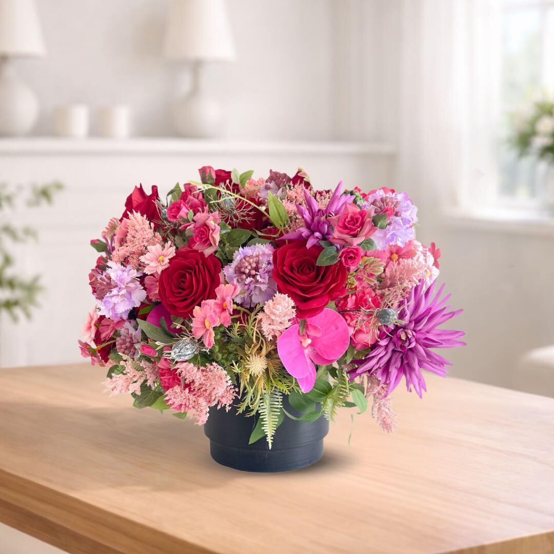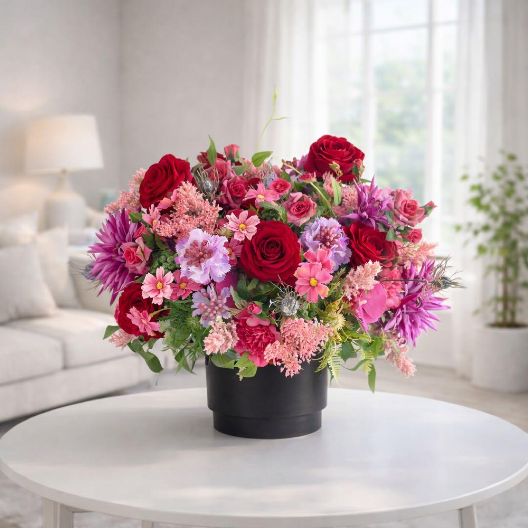 重厚感のあるブラックの器が、花々の色彩をより鮮やかに引き立て、空間全体に凛とした品格をもたらします。