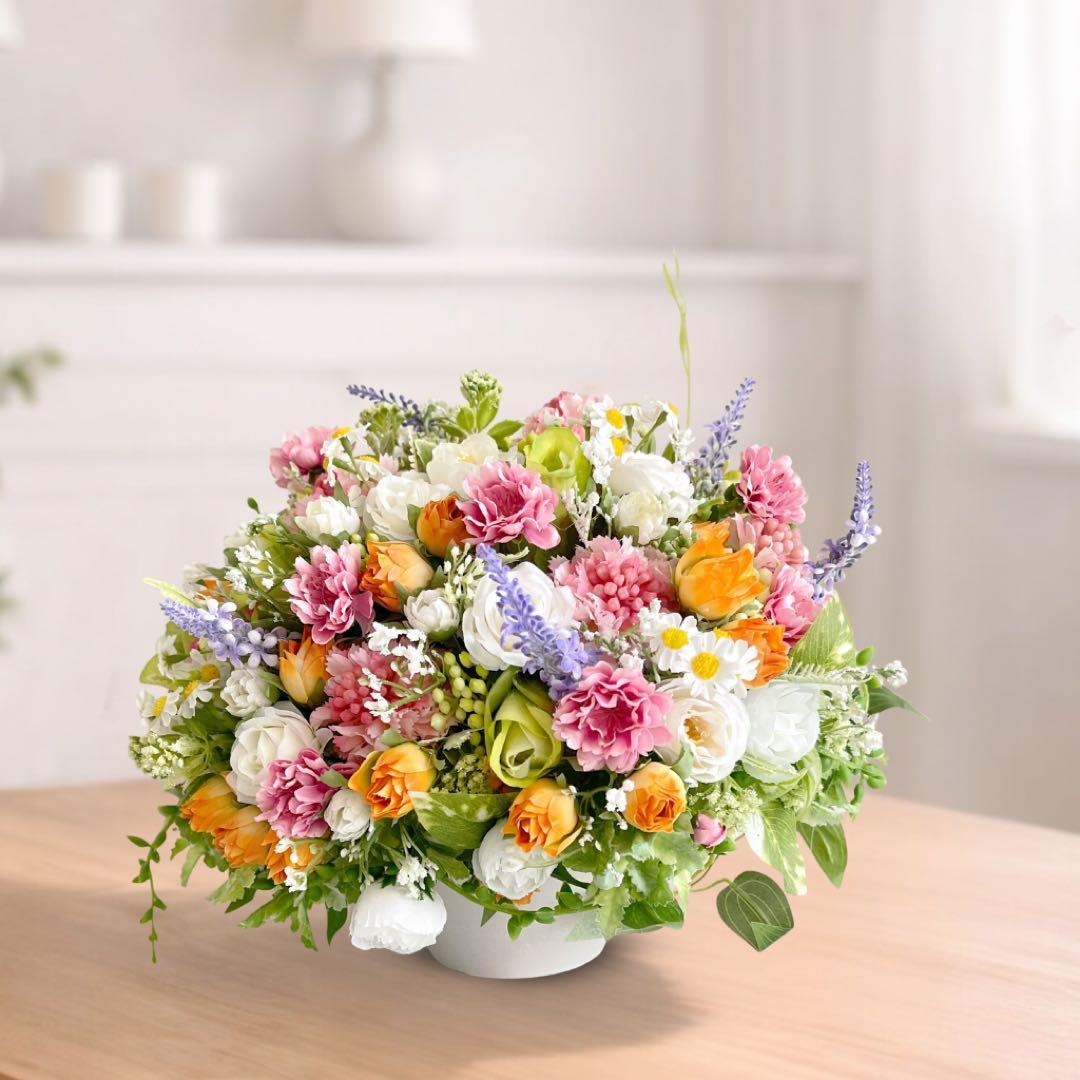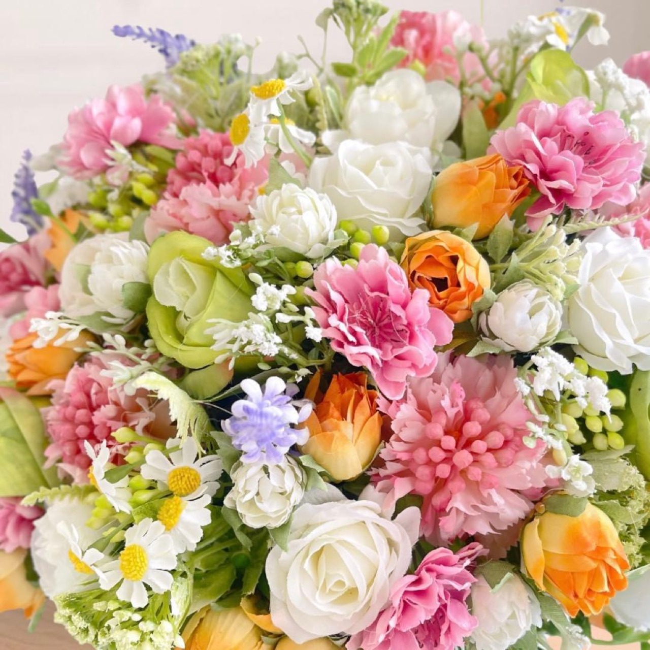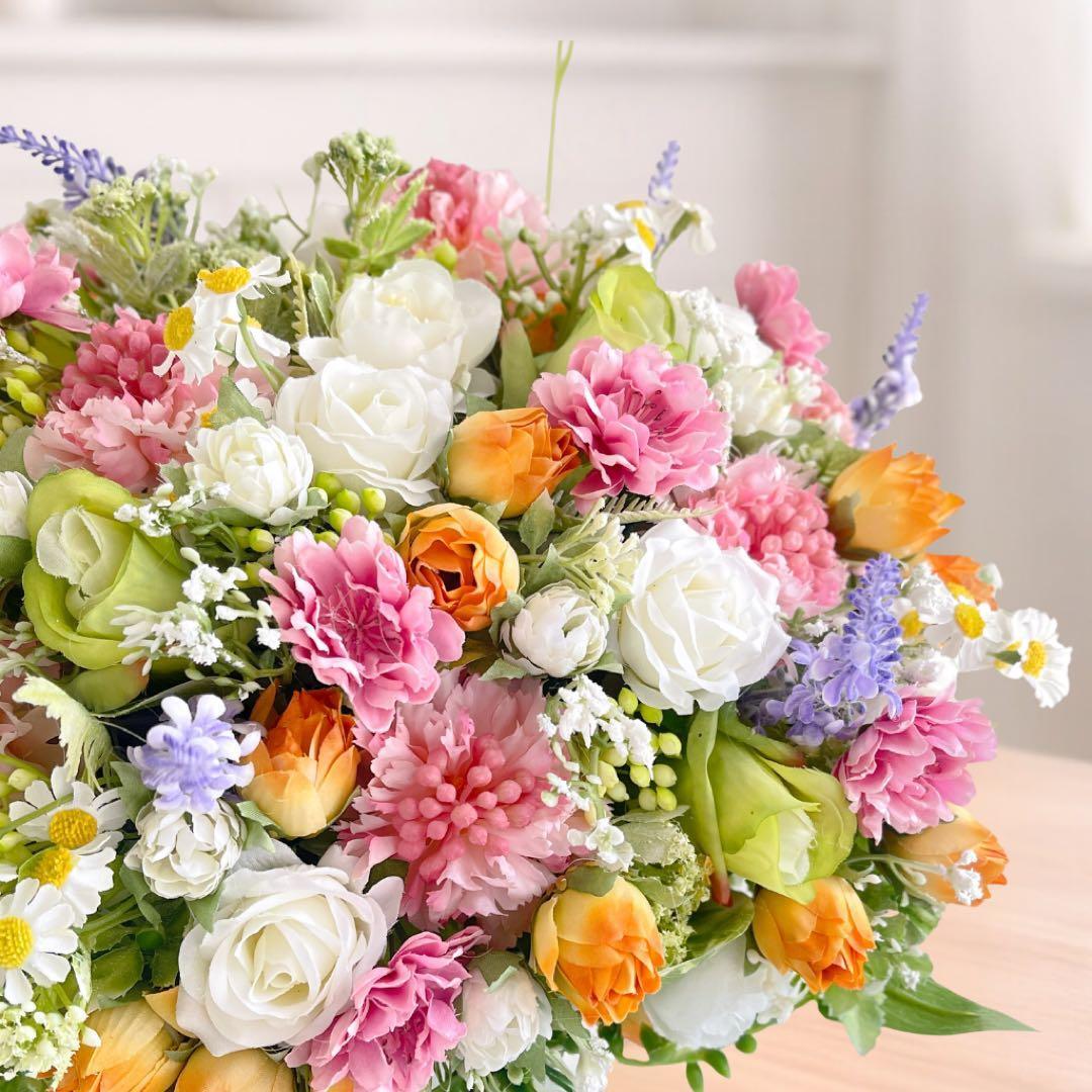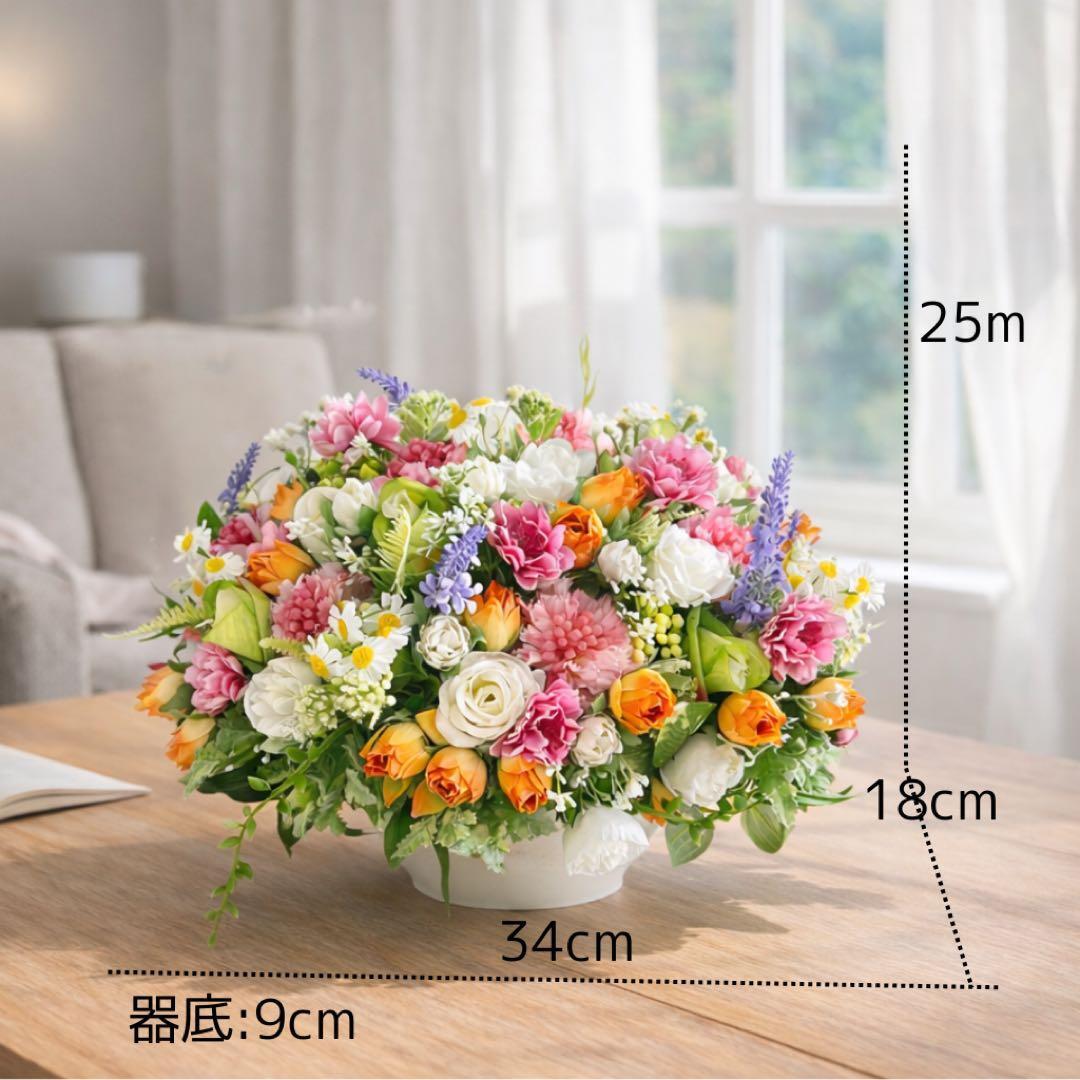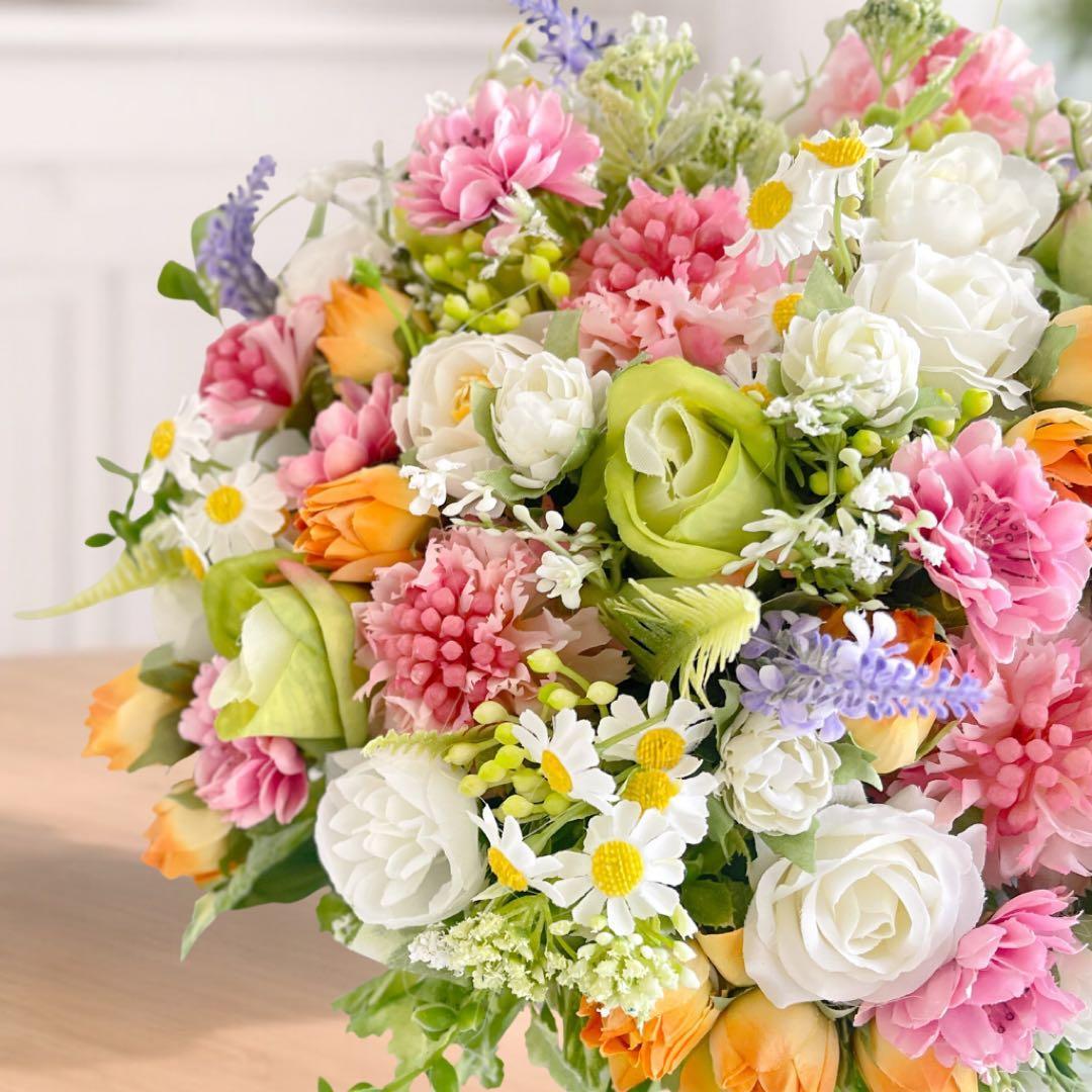 光触媒フラワー「陽だまりの野原」桃とローズの贅沢アレンジ 繊細な多種花材仕立て アーティフィシャルフラワー