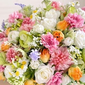 可憐な桃の花と気品あるローズを主役に、カスミソウやラベンダー、カモミールといった野に咲く花々を贅沢に詰め込んだ、繊細かつ華やかなアレンジメントです。