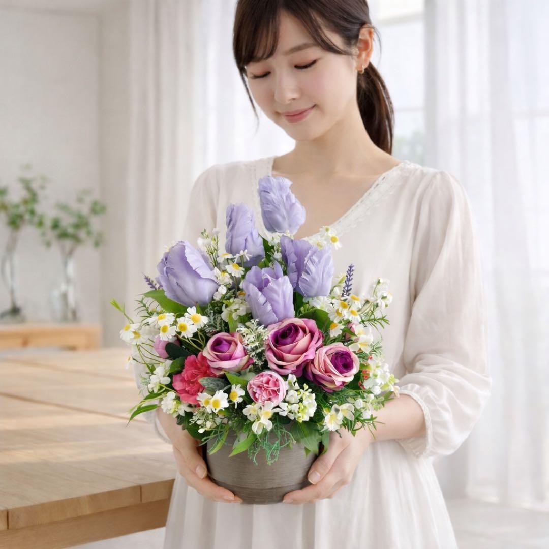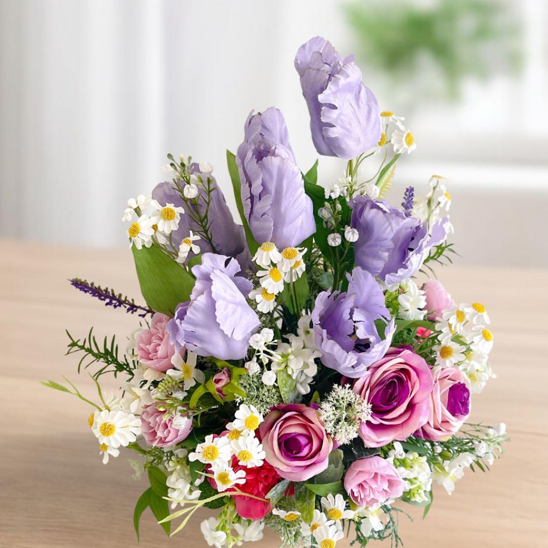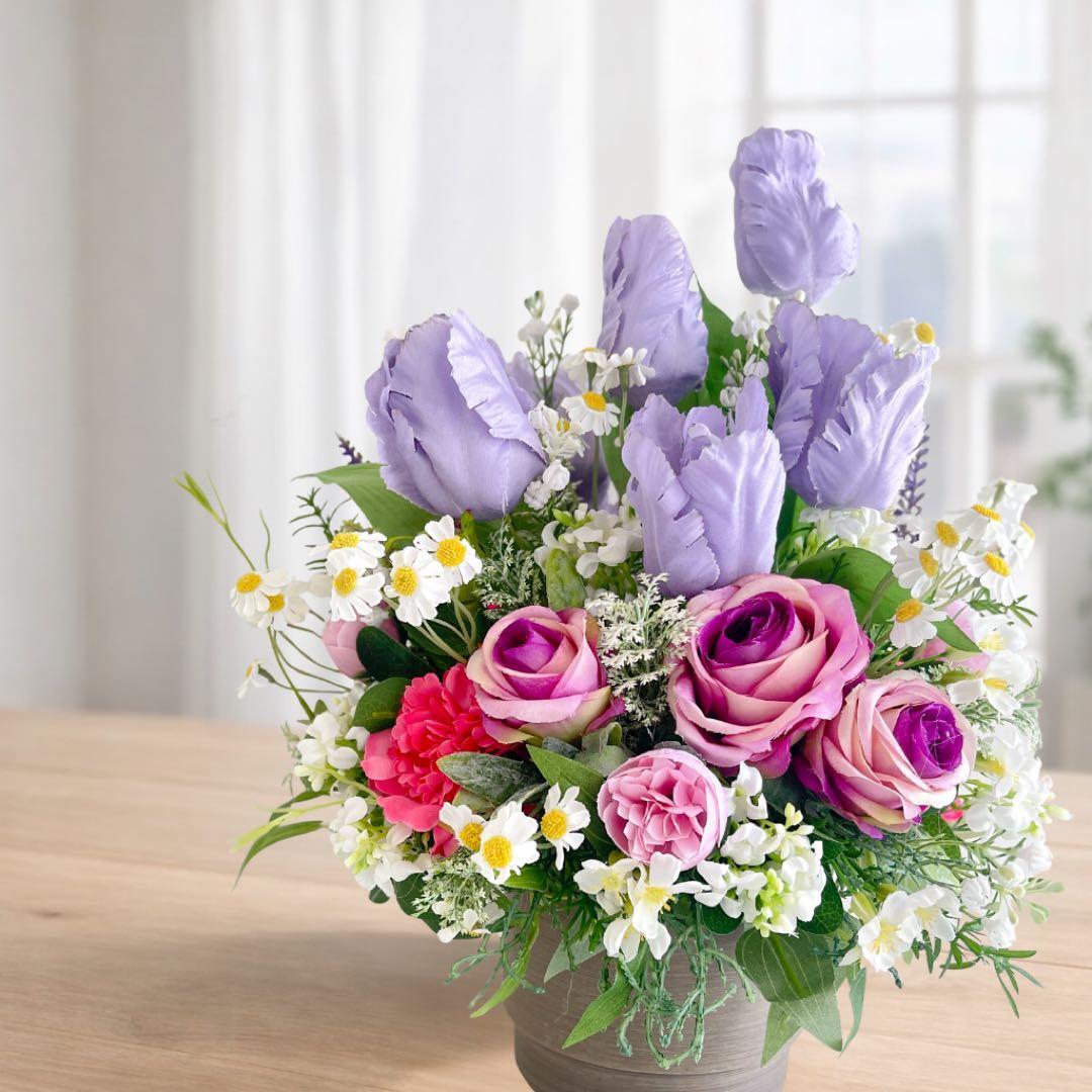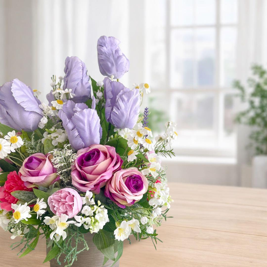 光触媒フラワー チューリップとパープルローズのコンパクトアレンジ 母の日 誕生日 アーティフィシャルフラワー